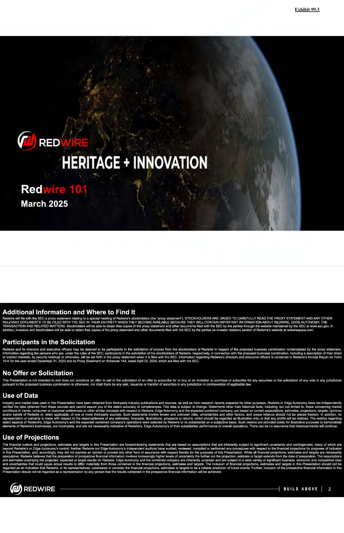 Exhibit 99.3 Additional Information and Where to Find It Redwire will file with the SEC a proxy statement relating to a special meeting of Redwire's stockholders (the "proxy statement"). STOCKHOLDERS ARE URGED TO CAREFULLY READ THE PROXY STATEMENT AND ANY OTHER RELEVANT DOCUMENTS TO BE FILED WITH THE SEC IN THEIR ENTIRETY WHEN THEY BECOME AVAILABLE BECAUSE THEY WILL CONTAIN IMPORTANT INFORMATION ABOUT REDWIRE, EDGE AUTONOMY, THE TRANSACTION AND RELATED MATTERS. Stockholders will be able to obtain free copies of the proxy statement and other documents filed with the SEC by the parties through the website maintained by the SEC at www.sec.gov. In addition, investors and stockholders will be able to obtain free copies of the proxy statement and other documents filed with the SEC by the parties on investor relations section of Redwire's website at redwirespace.com. Participants in the Solicitation Redwire and its directors and executive officers may be deemed to be participants in the solicitation of proxies from the stockholders of Redwire in respect of the proposed business combination contemplated by the proxy statement. Information regarding the persons who are, under the rules of the SEC, participants in the solicitation of the stockholders of Redwire, respectively, in connection with the proposed business combination, including a description of their direct or indirect interests, by security holdings or otherwise, will be set forth in the proxy statement when it is filed with the SEC. Information regarding Redwire's directors and executive officers is contained in Redwire's Annual Report on Form 10-K for the year ended December 31, 2023 and its Proxy Statement on Schedule 14A, dated April 22, 2024, which are filed with the SEC. No Offer or Solicitation This Presentation is not intended to and does not constitute an offer to sell or the solicitation of an offer to subscribe for or buy or an invitation to purchase or subscribe for any securities or the solicitation of any vote in any jurisdiction pursuant to the proposed business combination or otherwise, nor shall there be any sale, issuance or transfer of securities in any jurisdiction in contravention of applicable law. Use of Data Industry and market data used in this Presentation have been obtained from third-party industry publications and sources, as well as from research reports prepared for other purposes. Redwire or Edge Autonomy have not independently verified the data obtained from these sources and cannot assure you of the data's accuracy or completeness. This data is subject to change. Statements other than historical facts, including, but not limited to, those concerning market conditions or trends, consumer or customer preferences or other similar concepts with respect to Redwire, Edge Autonomy and the expected combined company, are based on current expectations, estimates, projections, targets, opinions and/or beliefs of Redwire or, when applicable, of one or more third-party sources. Such statements involve known and unknown risks, uncertainties and other factors, and undue reliance should not be placed thereon. In addition, no representation or warranty is made with respect to the reasonableness of any estimates, forecasts, illustrations, prospects or returns, which should be regarded as illustrative only, or that any profits will be realized. The metrics regarding select aspects of Redwire's, Edge Autonomy's and the expected combined company's operations were selected by Redwire or its subsidiaries on a subjective basis. Such metrics are provided solely for illustrative purposes to demonstrate elements of Redwire's businesses, are incomplete, and are not necessarily indicative of Redwire's, Edge Autonomy's or their subsidiaries' performance or overall operations. There can be no assurance that historical trends will continue. Use of Projections The financial outlook and projections, estimates and targets in this Presentation are forward-looking statements that are based on assumptions that are inherently subject to significant uncertainty and contingencies, many of which are beyond Redwire's or Edge Autonomy's control. Neither Redwire nor Edge Autonomy's independent auditors have audited, reviewed, compiled or performed any procedures with respect to the financial projections for purposes of inclusion in this Presentation, and, accordingly, they did not express an opinion or provide any other form of assurance with respect thereto for the purposes of this Presentation. While all financial projections, estimates and targets are necessarily speculative, Redwire believes that the preparation of prospective financial information involves increasingly higher levels of uncertainty the further out the projection, estimate or target extends from the date of preparation. The assumptions and estimates underlying the projected, expected or target results for Redwire, Edge Autonomy and the combined company are inherently uncertain and are subject to a wide variety of significant business, economic and competitive risks and uncertainties that could cause actual results to differ materially from those contained in the financial projections, estimates and targets. The inclusion of financial projections, estimates and targets in this Presentation should not be regarded as an indication that Redwire, or its representatives, considered or consider the financial projections, estimates or targets to be a reliable prediction of future events. Further, inclusion of the prospective financial information in this Presentation should not be regarded as a representation by any person that the results contained in the prospective financial information will be achieved. {jiJbREDWIRE BUILD ABOVE 2