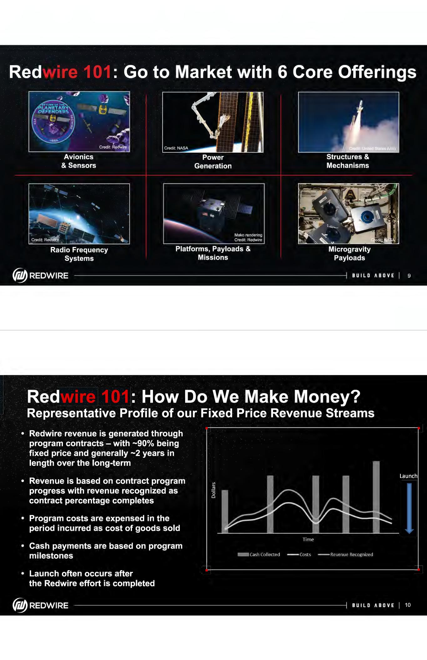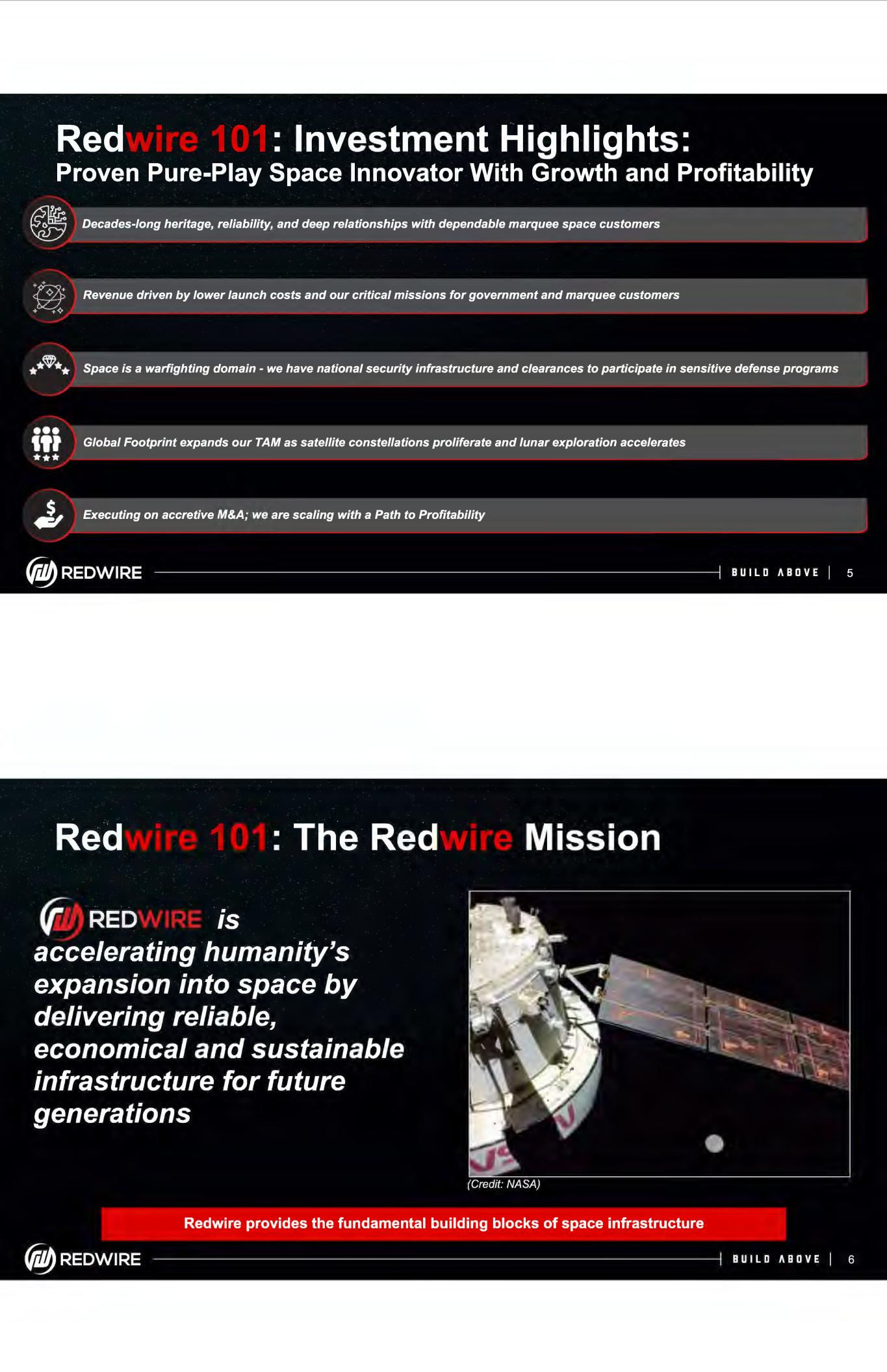 Red : Investment Highlights: Proven Pure-Play Space Innovator With Growth and Profitability @ Decades-long heritage, reliability, and deep relationships with dependable marquee space customers + + ◊ + Revenue driven by lower launch costs and our critical missions for government and marquee customers + +◊ •*'fl)*• Space is a warfighting domain - we have national security infrastructure and clearances to participate in sensitive defense programs ••• llf Global Footprint expands our TAM as satellite constellations proliferate and lunar exploration accelerates *** .J, Executing on accretive M&A; we are scaling with a Path to Profitability {jiJbREDWIRE BUILD ABOVE I 5