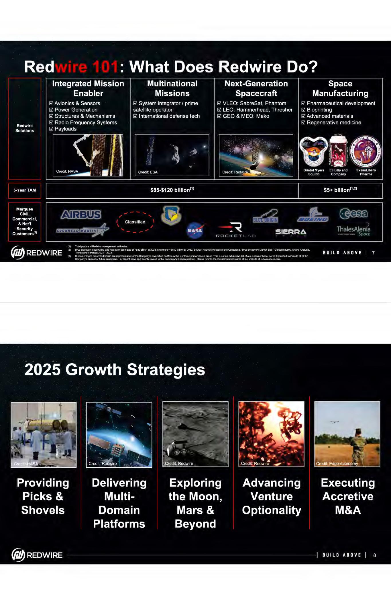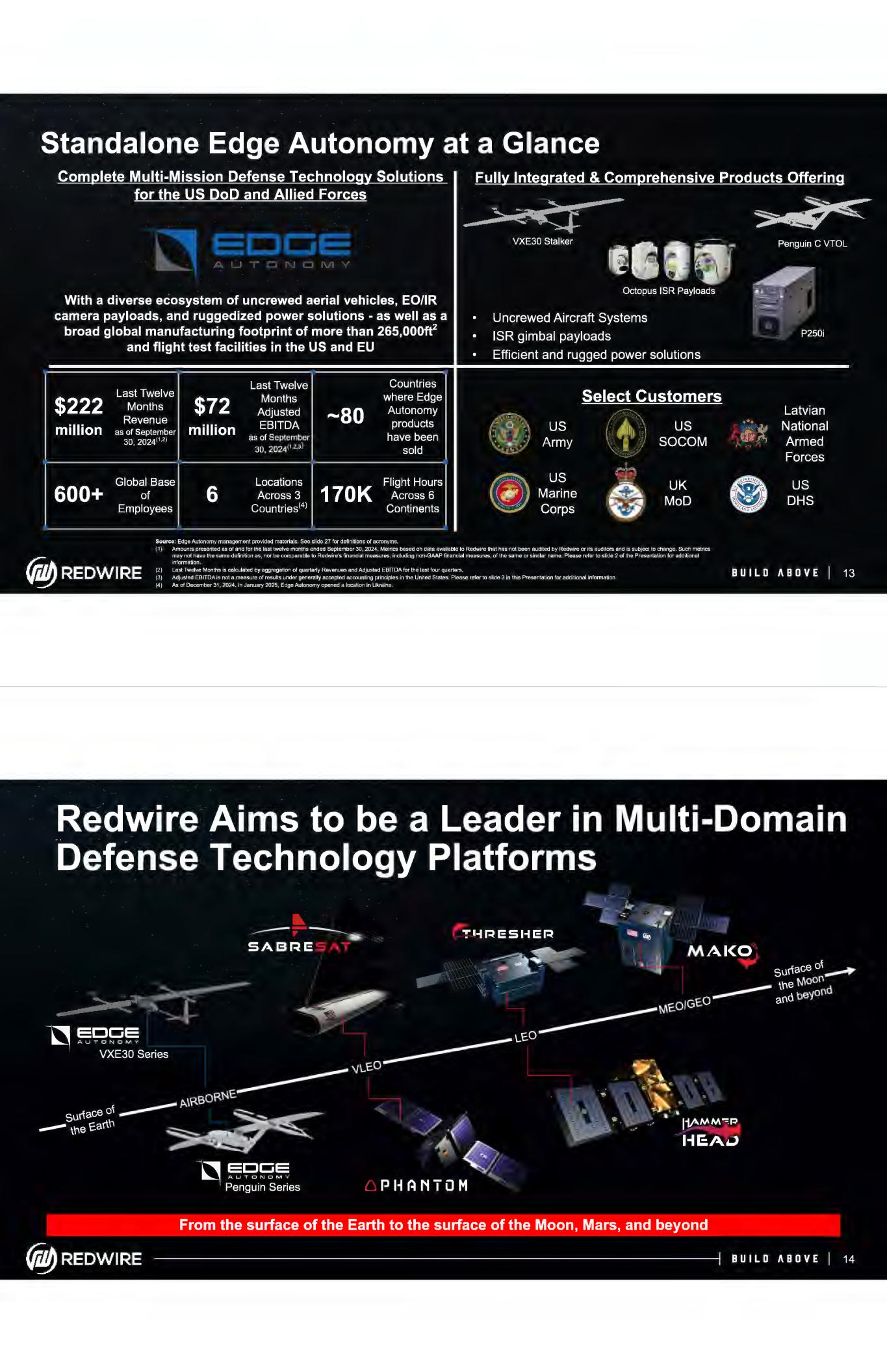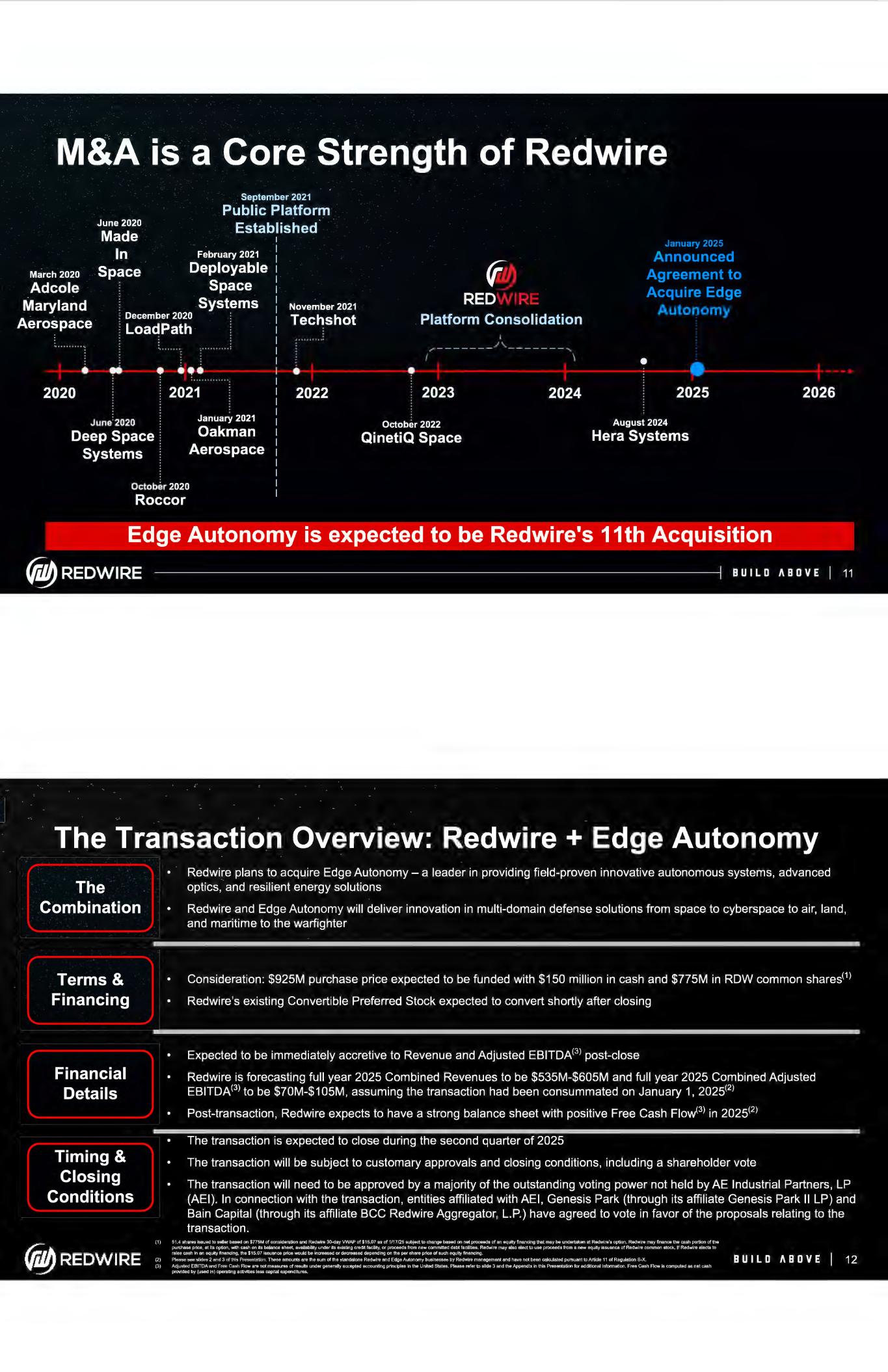 Cautionary Statement Regarding Forward-Looking Statements Readers are cautioned that the statements contained in this Presentation regarding expectations of our performance or other matters that may affect our or the combined company's business, results of operations, or financial condition are "forward-looking statements" as defined by the "safe harbor" provisions in the Private Securities Litigation Reform Act of 1995. Such statements are made in reliance on the safe harbor provisions of Section 27 A of the Securities Act of 1933 and Section 21 E of the Securities Exchange Act of 1934. All statements, other than statements of historical fact, included or incorporated in this Presentation, including statements regarding our or the combined company's strategy, financial position, guidance, including the prospective financial information provided in this Presentation, funding for continued operations, cash reserves, liquidity, projected costs, plans, projects, awards and contracts, and objectives of management, the entry into the potential business combination, the expected benefits from the proposed business combination, the expected performance of the combined company, the expectations regarding financing the proposed business combination, among others, are forward-looking statements. Words such as "expect," "anticipate," "should," "believe," "hope," "target," "continued," "project," "plan," "goals," "opportunity," "appeal," "estimate," "potential," "predict," "demonstrates," "may," "will," "might," "could," "intend," "shall," "possible," "forecast," "trends," "contemplate," "would," "approximately," "likely," "outlook," "schedule," "on track," "poised," "pipeline," and variations of these terms or the negative of these terms and similar expressions are intended to identify these forward-looking statements, but the absence of these words does not mean that a statement is not forward-looking. These forward-looking statements are not guarantees of future performance, conditions or results. Forward-looking statements are subject to a number of risks and uncertainties, many of which involve factors or circumstances that are beyond our control. These factors and circumstances include, but are not limited to: (1) risks associated with the continued economic uncertainty, including high inflation, supply chain challenges, labor shortages, increased labor costs, high interest rates, foreign currency exchange volatility, concerns of economic slowdown or recession and reduced spending or suspension of investment in new or enhanced projects; (2) the failure of financial institutions or transactional counterparties; (3) the Company's limited operating history and history of losses to date; (4) the inability to successfully integrate recently completed and future acquisitions, including the proposed business combination with Edge Autonomy, as well as the failure to realize the anticipated benefits of the transaction or to realize estimated projected combined company results; (5) the development and continued refinement of many of the Company's and the combined company's proprietary technologies, products and service offerings; (6) competition with new or existing companies; (7) the possibility that the Company's forecasts, expectations and assumptions relating to future results and projections with respect to Redwire or Edge Autonomy may prove incorrect; (8) adverse publicity stemming from any incident or perceived risk involving Redwire, Edge Autonomy, the combined company, or their competitors; (9) unsatisfactory performance of our and the combined company's products resulting from challenges in the space environment, extreme space weather events, the environments in which drones operate, including in combat or other areas where hostilities may occur, or otherwise; (10) the emerging nature of the market for in-space infrastructure services and the market for drones and related services; (11) inability to realize benefits from new offerings or the application of our or the combined company's technologies; (12) the inability to convert orders in backlog into revenue; (13) our and the combined company's dependence on U.S. and foreign government contracts, which are only partially funded and subject to immediate termination, which may be affected by changes in government program requirements, spending priorities, or budgetary constraints, including government shutdowns, or which may be influenced by the level of military activities and related spending with respect to ongoing or future conflicts, including the war in Ukraine; (14) the fact that we are and the combined company will be subject to stringent economic sanctions, and trade control laws and regulations; (15) the need for substantial additional funding to finance our and the combined company's operations, which may not be available when needed, on acceptable terms or at all; (16) the dilution of existing holders of our common stock that will result from the issuance of additional shares of common stock as consideration for the acquisition of Edge Autonomy, as well as the issuance of common stock in any offering that may be undertaken in connection with such acquisition; (17) the fact that the issuance and sale of shares of our Series A Convertible Preferred Stock has reduced the relative voting power of holders of our common stock and diluted the ownership of holders of our capital stock; (18) the ability to achieve the conditions to cause, or timing of, any mandatory conversion of the Series A Convertible Preferred stock into common stock; (19) the fact that AE Industrial Partners and Bain Capital have significant influence over us, which could limit your ability to influence the outcome of key transactions; (20) provisions in our Certificate of Designation with respect to our Series A Convertible Preferred Stock may delay or prevent our acquisition by a third party, which could also reduce the market price of our capital stock; (21) the fact