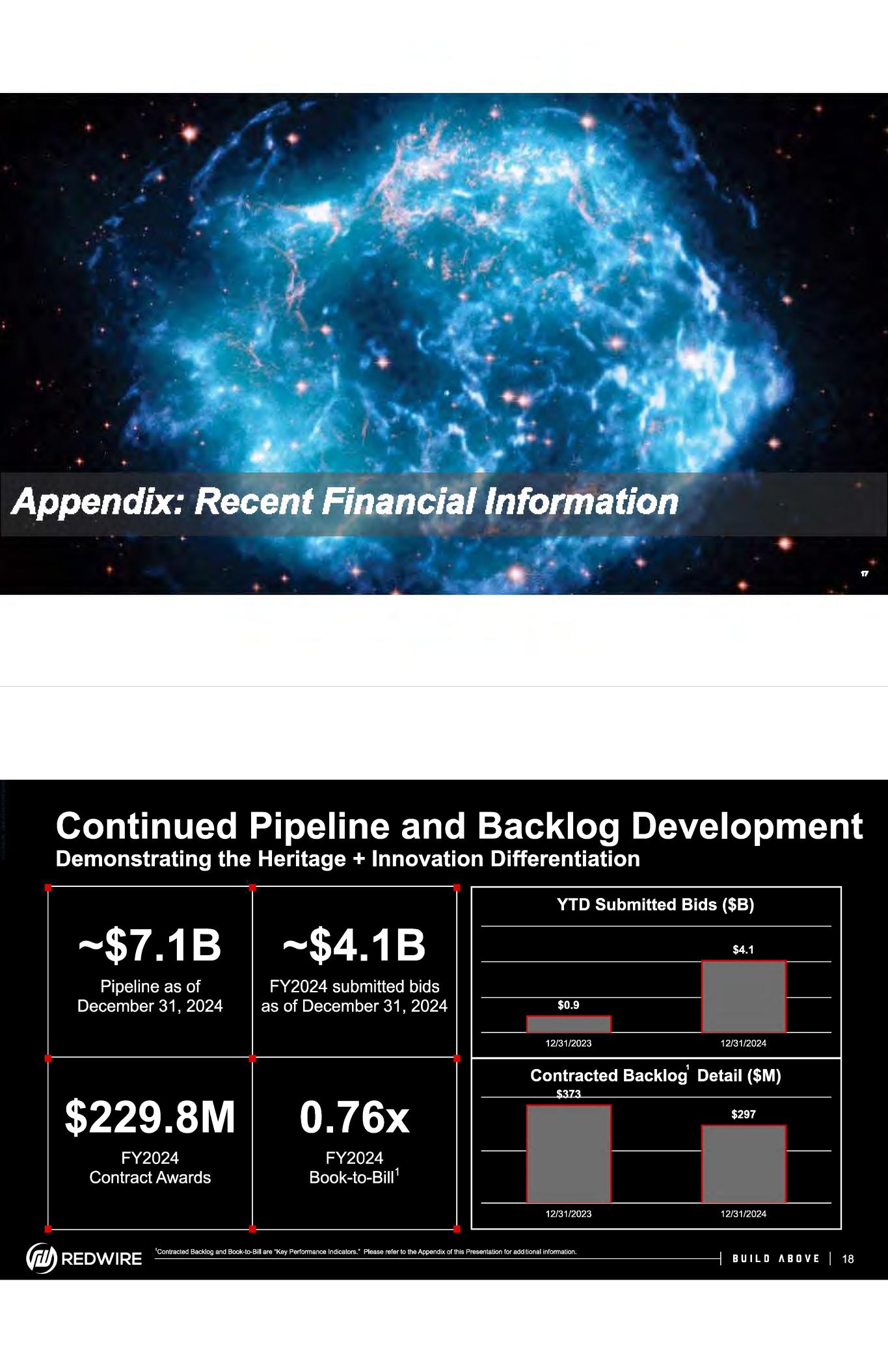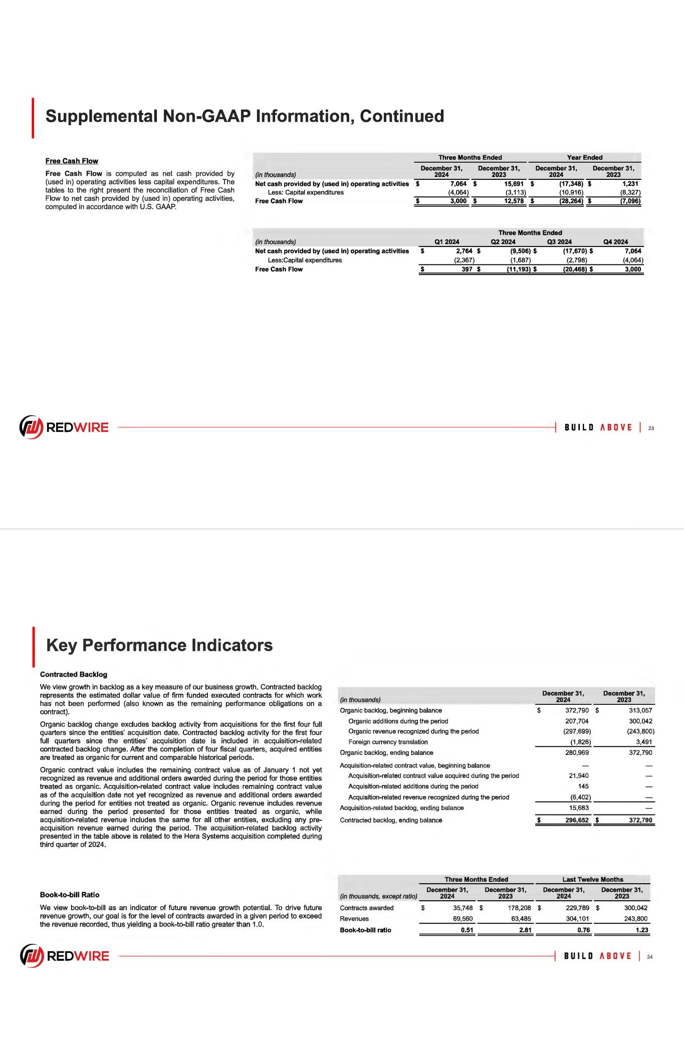 Supplemental Non-GAAP Information, Continued Free Cash Flow Free Cash Flow is computed as net cash provided by (used in) operating activities less capital expenditures. The tables to the right present the reconciliation of Free Cash Flow to net cash provided by (used in) operating activities, computed in accordance with U.S. GAAP. ~ REDWIRE (in thousands) Net cash provided by (used in) operating activities Less: Capital expenditures Free Cash Flow (in thousands) Net cash provided by (used in) operating activities Less:Capital expenditures Free Cash Flow $ $ Three Months Ended Year Ended December 31, December 31, December 31, December 31, 2024 7,064 $ (4,064) 3,000 $ Q1 2024 $ 2,764 $ (2,367) $ 397 $ 2023 2024 15,691 $ (17,348) $ (3,113) (10,916) 12,578 $ (28,264) $ Three Months Ended Q2 2024 Q3 2024 (9,506) $ (17,670) $ (1,687) (2,798) (11,193) $ (20,468) $ 2023 1,231 (8,327) (7,096) Q42024 7,064 (4,064) 3,000 BUILD ABOVE I 23 Key Performance Indicators Contracted Backlog We view growth in backlog as a key measure of our business growth. Contracted backlog represents the estimated dollar value of firm funded executed contracts for which work has not been performed (also known as the remaining performance obligations on a contract). Organic backlog change excludes backlog activity from acquisitions for the first four full quarters since the entities' acquisition date. Contracted backlog activity for the first four full quarters since the entities' acquisition date is included in acquisition-related contracted backlog change. After the completion of four fiscal quarters, acquired entities are treated as organic for current and comparable historical periods. Organic contract value includes the remaining contract value as of January 1 not yet recognized as revenue and additional orders awarded during the period for those entities treated as organic. Acquisition-related contract value includes remaining contract value as of the acquisition date not yet recognized as revenue and additional orders awarded during the period for entities not treated as organic. Organic revenue includes revenue earned during the period presented for those entities treated as organic, while acquisition-related revenue includes the same for all other entities, excluding any pre­ acquisition revenue earned during the period. The acquisition-related backlog activity presented in the table above is related to the Hera Systems acquisition completed during third quarter of 2024. Book-to-bill Ratio We view book-to-bill as an indicator of future revenue growth potential. To drive future revenue growth, our goal is for the level of contracts awarded in a given period to exceed the revenue recorded, thus yielding a book-to-bill ratio greater than 1.0. vf!!J REDWIRE (in thousands) Organic backlog, beginning balance Organic additions during the period Organic revenue recognized during the period Foreign currency translation Organic backlog, ending balance Acquisition-related contract value, beginning balance Acquisition-related contract value acquired during the period Acquisition-related additions during the period Acquisition-related revenue recognized during the period Acquisition-related backlog, ending balance Contracted backlog, ending balance Three Months Ended December 31, December 31, (in thousands, except ratio) 2024 2023 Contracts awarded $ 35,748 $ 178,208 Revenues 69,560 63,485 Book-to-bill ratio 0.51 2.81 December 31, December 31, 2024 2023 $ 372,790 $ 313,057 207,704 300,042 (297,699) (243,800) (1,826) 3,491 280,969 372,790 21,940 145 (6,402) 15,683 $ 296,652 $ 372,790 Last Twelve Months December 31, December 31, 2024 2023 $ 229,789 $ 300,042 304,101 243,800 0.76 1.23 BUILD ABOVE I 24