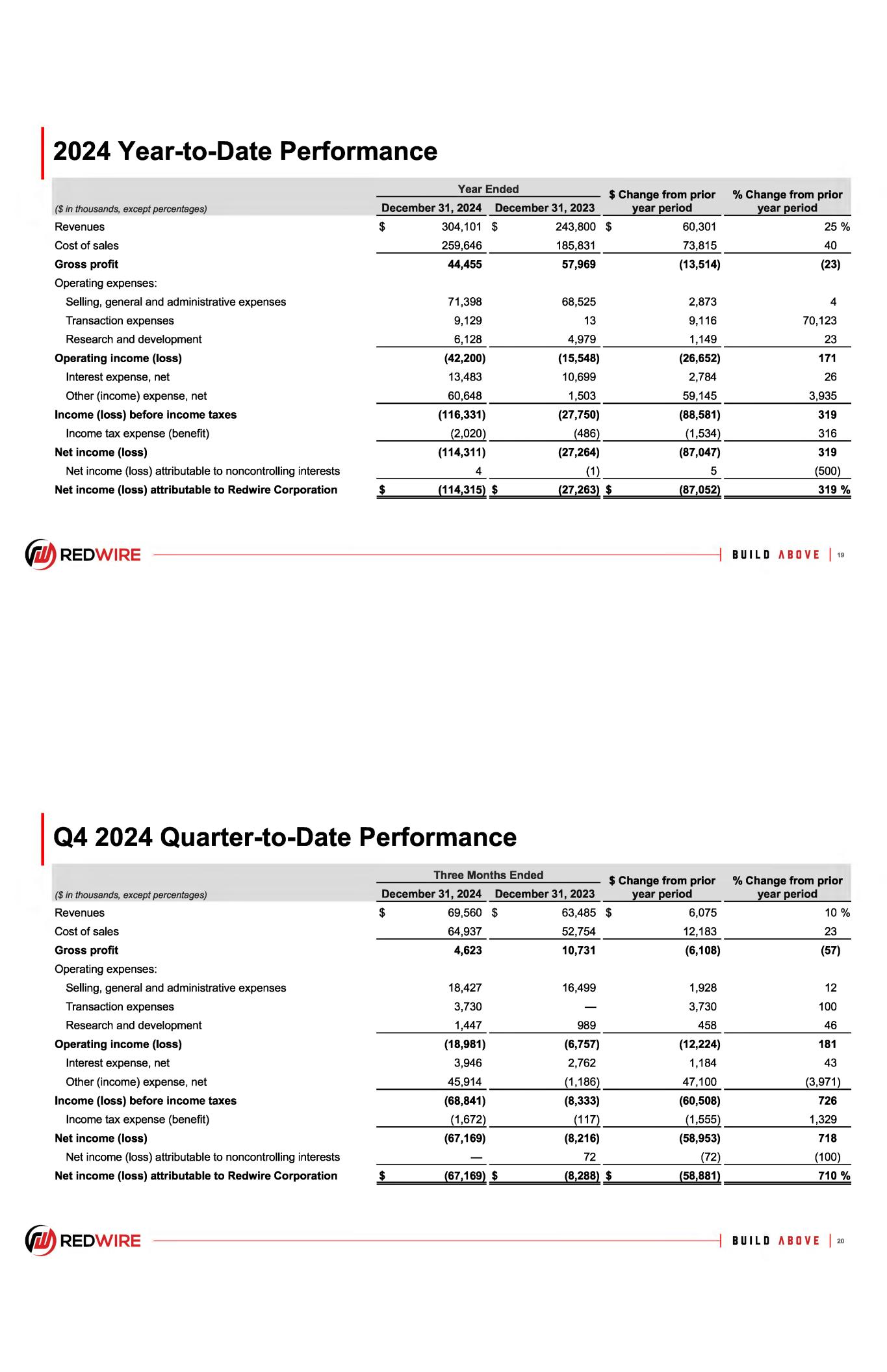 2024 Year-to-Date Performance Year Ended $ Change from prior ($ in thousands, except percentages) Revenues December 31, 2024 December 31, 2023 year period Cost of sales Gross profit Operating expenses: Selling, general and administrative expenses Transaction expenses Research and development Operating income (loss) Interest expense, net Other (income) expense, net Income (loss) before income taxes Income tax expense (benefit) Net income (loss) Net income (loss) attributable to noncontrolling interests Net income (loss) attributable to Redwire Corporation ~ REDWIRE $ $ 304,101 $ 259,646 44,455 71,398 9,129 6,128 (42,200) 13,483 60,648 (116,331) (2,020) (114,311) 4 {114,315} $ 243,800 $ 60,301 185,831 73,815 57,969 (13,514) 68,525 2,873 13 9,116 4,979 1,149 (15,548) (26,652) 10,699 2,784 1,503 59,145 (27,750) (88,581) (486) (1,534) (27,264) (87,047) (1) 5 {27,263} $ {87,052} % Change from prior year period 25 % 40 (23) 4 70,123 23 171 26 3,935 319 316 319 (500) 319 % 8 U I L O A 8 0 V E I 19 Q4 2024 Quarter-to-Date Performance Three Months Ended $ Change from prior ($ in thousands, except percentages) Revenues December 31, 2024 December 31, 2023 year period Cost of sales Gross profit Operating expenses: Selling, general and administrative expenses Transaction expenses Research and development Operating income (loss) Interest expense, net Other (income) expense, net Income (loss) before income taxes Income tax expense (benefit) Net income (loss) Net income (loss) attributable to noncontrolling interests Net income (loss) attributable to Redwire Corporation ~ REDWIRE $ 69,560 $ 64,937 4,623 18,427 3,730 1,447 (18,981) 3,946 45,914 (68,841) (1,672) (67,169) $ (67,169} $ 63,485 $ 6,075 52,754 12,183 10,731 (6,108) 16,499 1,928 3,730 989 458 (6,757) (12,224) 2,762 1,184 (1,186) 47,100 (8,333) (60,508) (117) (1,555) (8,216) (58,953) 72 (72) (8,288} $ (58,881} % Change from prior year period 10 % 23 (57) 12 100 46 181 43 (3,971) 726 1,329 718 (100) 710 % BUILD ABOVE I 20