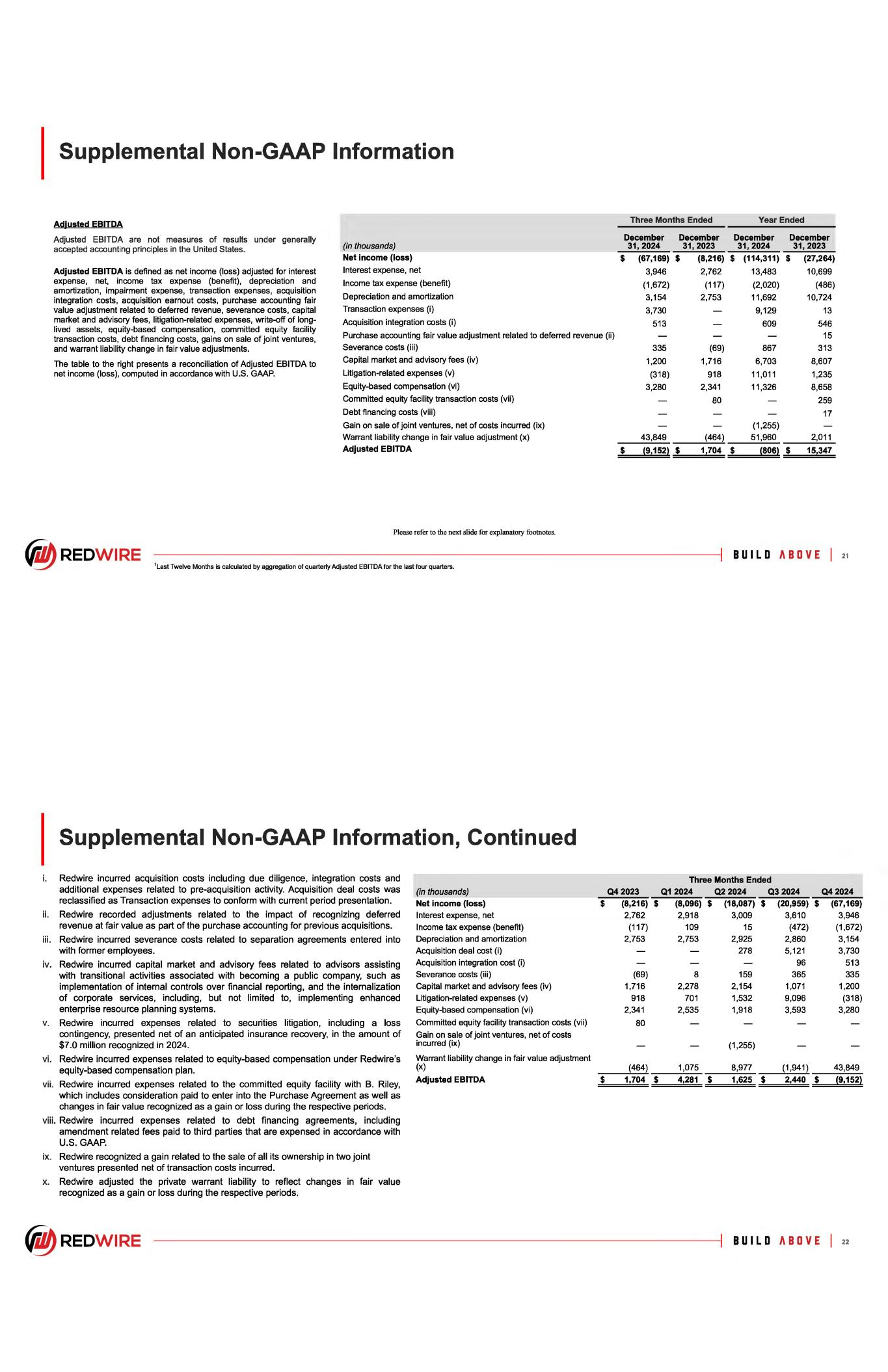 Supplemental Non-GAAP Information Adjusted EBITDA Adjusted EBITDA are not measures of results under generally accepted accounting principles in the United States. Adjusted EBITDA is defined as net income (loss) adjusted for interest expense, net, income tax expense (benefit), depreciation and amortization, impairment expense, transaction expenses, acquisition integration costs, acquisition earnout costs, purchase accounting fair value adjustment related to deferred revenue, severance costs, capital market and advisory fees, litigation-related expenses, write-off of long­ lived assets, equity-based compensation, committed equity facility transaction costs, debt financing costs, gains on sale of joint ventures, and warrant liability change in fair value adjustments. The table to the right presents a reconciliation of Adjusted EBITDA to net income (loss), computed in accordance with U.S. GAAP. (in thousands) Net income (loss) Interest expense, net Income tax expense (benefit) Depreciation and amortization Transaction expenses (i) Acquisition integration costs (i) Purchase accounting fair value adjustment related to deferred revenue (ii) Severance costs (iii) Capital market and advisory fees (iv) Litigation-related expenses (v) Equity-based compensation (vi) Committed equity facility transaction costs (vii) Debt financing costs (viii) Gain on sale of joint ventures, net of costs incurred (ix) Warrant liability change in fair value adjustment (x) Adjusted EBITDA Please refer to the next slide for explanatory footnotes. ~ REDWIRE 1Last Twelve Months is calculated by aggregation of quarterly Adjusted EBITDA for the last four quarters. Three Months Ended Year Ended December December December December 31,2024 31,2023 31,2024 31,2023 $ (67,169) $ (8,216) $ (114,311) $ (27,264) 3,946 2,762 13,483 10,699 (1,672) (117) (2,020) (486) 3,154 2,753 11,692 10,724 3,730 9,129 13 513 609 546 15 335 (69) 867 313 1,200 1,716 6,703 8,607 (318) 918 11,011 1,235 3,280 2,341 11,326 8,658 80 259 17 (1,255) 43,849 (464) 51,960 2,011 $ {9,152} $ 1,704 $ {806} $ 15,347 8 U I L O A 8 0 V E I 21 Supplemental Non-GAAP Information, Continued i. Redwire incurred acquisition costs including due diligence, integration costs and additional expenses related to pre-acquisition activity. Acquisition deal costs was reclassified as Transaction expenses to conform with current period presentation. ii. Redwire recorded adjustments related to the impact of recognizing deferred revenue at fair value as part of the purchase accounting for previous acquisitions. iii. Redwire incurred severance costs related to separation agreements entered into with former employees. iv. Redwire incurred capital market and advisory fees related to advisors assisting with transitional activities associated with becoming a public company, such as implementation of internal controls over financial reporting, and the internalization of corporate services, including, but not limited to, implementing enhanced enterprise resource planning systems. v. Redwire incurred expenses related to securities litigation, including a loss contingency, presented net of an anticipated insurance recovery, in the amount of $7 .0 million recognized in 2024. vi. Redwire incurred expenses related to equity-based compensation under Redwire's equity-based compensation plan. vii. Redwire incurred expenses related to the committed equity facility with B. Riley, which includes consideration paid to enter into the Purchase Agreement as well as changes in fair value recognized as a gain or loss during the respective periods. viii. Redwire incurred expenses related to debt financing agreements, including amendment related fees paid to third parties that are expensed in accordance with U.S.GMP. ix. Redwire recognized a gain related to the sale of all its ownership in two joint ventures presented net of transaction costs incurred. x. Redwire adjusted the private warrant liability to reflect changes in fair value recognized as a gain or loss during the respective periods. ~ REDWIRE (in thousands) Net income (loss) Interest expense, net Income tax expense (benefit) Depreciation and amortization Acquisition deal cost (i) Acquisition integration cost (i) Severance costs (iii) Capital market and advisory fees (iv) Litigation-related expenses (v) Equity-based compensation (vi) Committed equity facility transaction costs (vii) Gain on sale of joint ventures, net of costs incurred (ix) Warrant liability change in fair value adjustment (x) Adjusted EBITDA Q4 2023 $ (8,216) $ 2,762 (117) 2,753 (69) 1,716 918 2,341 80 (464) $ 1,704 $ Three Months Ended Q1 2024 Q2 2024 Q3 2024 Q4 2024 (8,096) $ (18,087) $ (20,959) $ (67,169) 2,918 3,009 3,610 3,946 109 15 (472) (1,672) 2,753 2,925 2,860 3,154 278 5,121 3,730 96 513 8 159 365 335 2,278 2,154 1,071 1,200 701 1,532 9,096 (318) 2,535 1,918 3,593 3,280 (1,255) 1,075 8,977 (1,941) 43,849 4,281 $ 1,625 $ 2,440 $ (9,152} BUILD ABOVE I 22