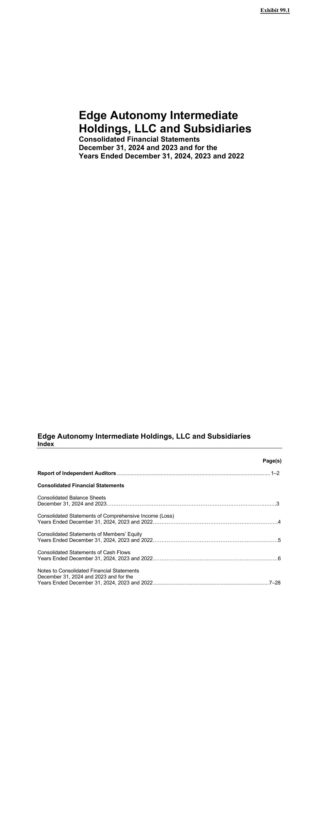 Edge Autonomy Intermediate Holdings, LLC and Subsidiaries Consolidated Financial Statements December 31, 2024 and 2023 and for the Years Ended December 31, 2024, 2023 and 2022 Exhibit 99.1 Edge Autonomy Intermediate Holdings, LLC and Subsidiaries Index Page(s) Report of Independent Auditors ...................................................................................................... 1–2 Consolidated Financial Statements Consolidated Balance Sheets December 31, 2024 and 2023……………………………………………………………………………….…….3 Consolidated Statements of Comprehensive Income (Loss) Years Ended December 31, 2024, 2023 and 2022………………………………………………………………4 Consolidated Statements of Members’ Equity Years Ended December 31, 2024, 2023 and 2022………………………………………………………………5 Consolidated Statements of Cash Flows Years Ended December 31, 2024, 2023 and 2022………………………………………………………………6 Notes to Consolidated Financial Statements December 31, 2024 and 2023 and for the Years Ended December 31, 2024, 2023 and 2022 ............................................................................. 7–28
