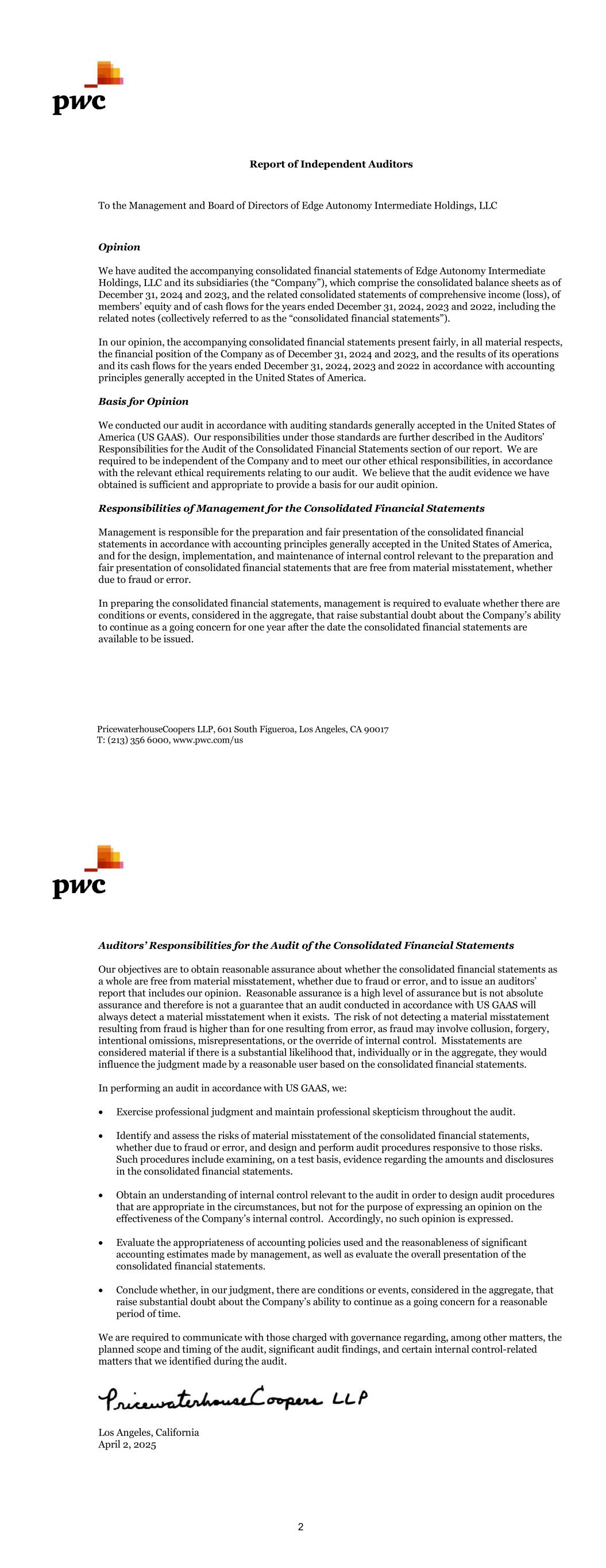 PricewaterhouseCoopers LLP, 601 South Figueroa, Los Angeles, CA 90017 T: (213) 356 6000, www.pwc.com/us Report of Independent Auditors To the Management and Board of Directors of Edge Autonomy Intermediate Holdings, LLC Opinion We have audited the accompanying consolidated financial statements of Edge Autonomy Intermediate Holdings, LLC and its subsidiaries (the “Company”), which comprise the consolidated balance sheets as of December 31, 2024 and 2023, and the related consolidated statements of comprehensive income (loss), of members’ equity and of cash flows for the years ended December 31, 2024, 2023 and 2022, including the related notes (collectively referred to as the “consolidated financial statements”). In our opinion, the accompanying consolidated financial statements present fairly, in all material respects, the financial position of the Company as of December 31, 2024 and 2023, and the results of its operations and its cash flows for the years ended December 31, 2024, 2023 and 2022 in accordance with accounting principles generally accepted in the United States of America. Basis for Opinion We conducted our audit in accordance with auditing standards generally accepted in the United States of America (US GAAS). Our responsibilities under those standards are further described in the Auditors’ Responsibilities for the Audit of the Consolidated Financial Statements section of our report. We are required to be independent of the Company and to meet our other ethical responsibilities, in accordance with the relevant ethical requirements relating to our audit. We believe that the audit evidence we have obtained is sufficient and appropriate to provide a basis for our audit opinion. Responsibilities of Management for the Consolidated Financial Statements Management is responsible for the preparation and fair presentation of the consolidated financial statements in accordance with accounting principles generally accepted in the United States of America, and for the design, implementation, and maintenance of internal control relevant to the preparation and fair presentation of consolidated financial statements that are free from material misstatement, whether due to fraud or error. In preparing the consolidated financial statements, management is required to evaluate whether there are conditions or events, considered in the aggregate, that raise substantial doubt about the Company’s ability to continue as a going concern for one year after the date the consolidated financial statements are available to be issued. 2 Auditors’ Responsibilities for the Audit of the Consolidated Financial Statements Our objectives are to obtain reasonable assurance about whether the consolidated financial statements as a whole are free from material misstatement, whether due to fraud or error, and to issue an auditors’ report that includes our opinion. Reasonable assurance is a high level of assurance but is not absolute assurance and therefore is not a guarantee that an audit conducted in accordance with US GAAS will always detect a material misstatement when it exists. The risk of not detecting a material misstatement resulting from fraud is higher than for one resulting from error, as fraud may involve collusion, forgery, intentional omissions, misrepresentations, or the override of internal control. Misstatements are considered material if there is a substantial likelihood that, individually or in the aggregate, they would influence the judgment made by a reasonable user based on the consolidated financial statements. In performing an audit in accordance with US GAAS, we: Exercise professional judgment and maintain professional skepticism throughout the audit. Identify and assess the risks of material misstatement of the consolidated financial statements, whether due to fraud or error, and design and perform audit procedures responsive to those risks. Such procedures include examining, on a test basis, evidence regarding the amounts and disclosures in the consolidated financial statements. Obtain an understanding of internal control relevant to the audit in order to design audit procedures that are appropriate in the circumstances, but not for the purpose of expressing an opinion on the effectiveness of the Company’s internal control. Accordingly, no such opinion is expressed. Evaluate the appropriateness of accounting policies used and the reasonableness of significant accounting estimates made by management, as well as evaluate the overall presentation of the consolidated financial statements. Conclude whether, in our judgment, there are conditions or events, considered in the aggregate, that raise substantial doubt about the Company’s ability to continue as a going concern for a reasonable period of time. We are required to communicate with those charged with governance regarding, among other matters, the planned scope and timing of the audit, significant audit findings, and certain internal control-related matters that we identified during the audit. Los Angeles, California April 2, 2025