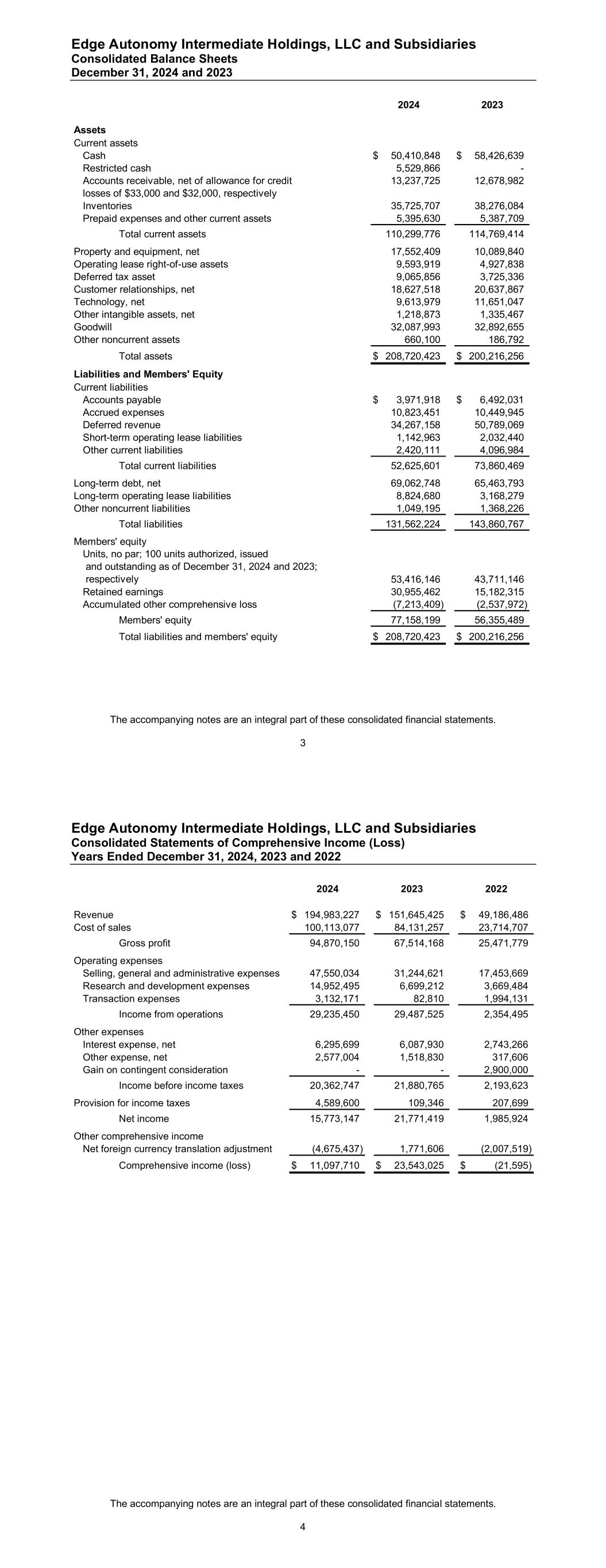 Edge Autonomy Intermediate Holdings, LLC and Subsidiaries Consolidated Balance Sheets December 31, 2024 and 2023 The accompanying notes are an integral part of these consolidated financial statements. 3 2024 2023 Assets Current assets Cash 50,410,848$ 58,426,639$ Restricted cash 5,529,866 - 13,237,725 12,678,982 losses of $33,000 and $32,000, respectively Inventories 35,725,707 38,276,084 Prepaid expenses and other current assets 5,395,630 5,387,709 Total current assets 110,299,776 114,769,414 Property and equipment, net 17,552,409 10,089,840 Operating lease right-of-use assets 9,593,919 4,927,838 Deferred tax asset 9,065,856 3,725,336 Customer relationships, net 18,627,518 20,637,867 Technology, net 9,613,979 11,651,047 Other intangible assets, net 1,218,873 1,335,467 Goodwill 32,087,993 32,892,655 Other noncurrent assets 660,100 186,792 Total assets 208,720,423$ 200,216,256$ Liabilities and Members' Equity Current liabilities Accounts payable 3,971,918$ 6,492,031$ Accrued expenses 10,823,451 10,449,945 Deferred revenue 34,267,158 50,789,069 Short-term operating lease liabilities 1,142,963 2,032,440 Other current liabilities 2,420,111 4,096,984 Total current liabilities 52,625,601 73,860,469 Long-term debt, net 69,062,748 65,463,793 Long-term operating lease liabilities 8,824,680 3,168,279 Other noncurrent liabilities 1,049,195 1,368,226 Total liabilities 131,562,224 143,860,767 Members' equity Units, no par; 100 units authorized, issued and outstanding as of December 31, 2024 and 2023; respectively 53,416,146 43,711,146 Retained earnings 30,955,462 15,182,315 Accumulated other comprehensive loss (7,213,409) (2,537,972) Members' equity 77,158,199 56,355,489 Total liabilities and members' equity 208,720,423$ 200,216,256$ Accounts receivable, net of allowance for credit Edge Autonomy Intermediate Holdings, LLC and Subsidiaries Consolidated Statements of Comprehensive Income (Loss) Years Ended December 31, 2024, 2023 and 2022 The accompanying notes are an integral part of these consolidated financial statements. 4 2024 2023 2022 Revenue 194,983,227$ 151,645,425$ 49,186,486$ Cost of sales 100,113,077 84,131,257 23,714,707 Gross profit 94,870,150 67,514,168 25,471,779 Operating expenses Selling, general and administrative expenses 47,550,034 31,244,621 17,453,669 Research and development expenses 14,952,495 6,699,212 3,669,484 Transaction expenses 3,132,171 82,810 1,994,131 Income from operations 29,235,450 29,487,525 2,354,495 Other expenses Interest expense, net 6,295,699 6,087,930 2,743,266 Other expense, net 2,577,004 1,518,830 317,606 Gain on contingent consideration - - 2,900,000 Income before income taxes 20,362,747 21,880,765 2,193,623 Provision for income taxes 4,589,600 109,346 207,699 Net income 15,773,147 21,771,419 1,985,924 Other comprehensive income Net foreign currency translation adjustment (4,675,437) 1,771,606 (2,007,519) Comprehensive income (loss) 11,097,710$ 23,543,025$ (21,595)$