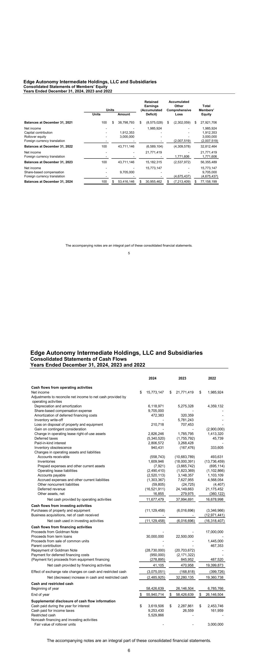 Edge Autonomy Intermediate Holdings, LLC and Subsidiaries Consolidated Statements of Members’ Equity Years Ended December 31, 2024, 2023 and 2022 The accompanying notes are an integral part of these consolidated financial statements. 5 Retained Accumulated Earnings Other Total (Accumulated Comprehensive Members' Units Amount Deficit) Loss Equity Balances at December 31, 2021 100 38,798,793$ (8,575,028)$ (2,302,059)$ 27,921,706$ Net income - - 1,985,924 - 1,985,924 Capital contribution - 1,912,353 - - 1,912,353 Rollover equity - 3,000,000 - - 3,000,000 Foreign currency translation - - - (2,007,519) (2,007,519) Balances at December 31, 2022 100 43,711,146 (6,589,104) (4,309,578) 32,812,464 Net income - - 21,771,419 - 21,771,419 Foreign currency translation - - - 1,771,606 1,771,606 Balances at December 31, 2023 100 43,711,146 15,182,315 (2,537,972) 56,355,489 Net income - - 15,773,147 - 15,773,147 Share-based compensation - 9,705,000 - - 9,705,000 Foreign currency translation - - - (4,675,437) (4,675,437) Balances at December 31, 2024 100 53,416,146$ 30,955,462$ (7,213,409)$ 77,158,199$ Units Edge Autonomy Intermediate Holdings, LLC and Subsidiaries Consolidated Statements of Cash Flows Years Ended December 31, 2024, 2023 and 2022 The accompanying notes are an integral part of these consolidated financial statements. 6 2024 2023 2022 Cash flows from operating activities Net income 15,773,147$ 21,771,419$ 1,985,924$ Adjustments to reconcile net income to net cash provided by operating activities Depreciation and amortization 6,118,971 5,275,328 4,359,132 Share-based compensation expense 9,705,000 - - Amortization of deferred financing costs 472,383 320,359 - Inventory write-off - 5,781,243 - Loss on disposal of property and equipment 210,718 707,453 - Gain on contingent consideration - - (2,900,000) Change in operating lease right-of-use assets 2,826,246 1,785,795 1,413,320 Deferred taxes (5,340,520) (1,755,792) 45,739 Paid-in-kind interest 2,806,572 3,268,428 - Inventory obsolescence 940,431 (167,476) 333,605 Changes in operating assets and liabilities Accounts receivable (558,743) (10,683,789) 493,631 Inventories 1,609,946 (18,000,391) (13,736,459) Prepaid expenses and other current assets (7,921) (3,665,742) (695,114) Operating lease liabilities (2,490,410) (1,823,369) (1,102,866) Accounts payable (2,520,113) 3,148,357 1,103,109 Accrued expenses and other current liabilities (1,303,367) 7,627,955 4,568,054 Other noncurrent liabilities (59,805) (24,725) (4,407) Deferred revenue (16,521,911) 24,149,663 21,175,452 Other assets, net 16,855 279,975 (360,122) Net cash provided by operating activities 11,677,479 37,994,691 16,678,998 Cash flows from investing activities Purchases of property and equipment (11,129,458) (6,016,696) (3,346,966) Business acquisitions, net of cash received - - (12,971,441) Net cash used in investing activities (11,129,458) (6,016,696) (16,318,407) Cash flows from financing activities Proceeds from Goldman Note - - 17,000,000 Proceeds from term loans 30,000,000 22,500,000 - Proceeds from sale of common units - - 1,445,000 Parent contribution - - 467,353 Repayment of Goldman Note (28,730,000) (20,703,672) - Payment for deferred financing costs (950,000) (2,171,322) - (Payment for) proceeds from equipment financing (278,895) 845,952 487,520 Net cash provided by financing activities 41,105 470,958 19,399,873 Effect of exchange rate changes on cash and restricted cash (3,075,051) (168,818) (399,726) Net (decrease) increase in cash and restricted cash (2,485,925) 32,280,135 19,360,738 Cash and restricted cash Beginning of year 58,426,639 26,146,504 6,785,766 End of year 55,940,714$ 58,426,639$ 26,146,504$ Supplemental disclosure of cash flow information Cash paid during the year for interest 3,619,506$ 2,287,861$ 2,453,746$ Cash paid for income taxes 9,253,430 26,559 161,959 Restricted cash 5,529,866 - - Noncash financing and investing activities Fair value of rollover units - - 3,000,000