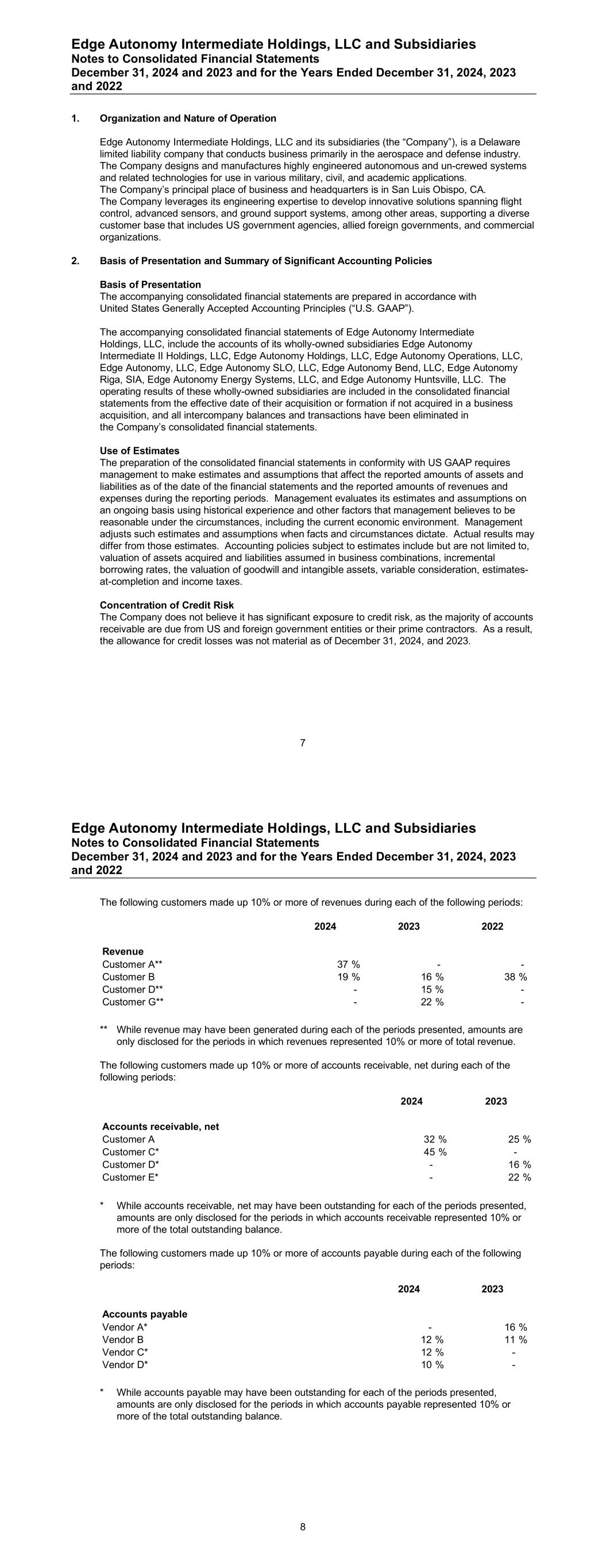 Edge Autonomy Intermediate Holdings, LLC and Subsidiaries Notes to Consolidated Financial Statements December 31, 2024 and 2023 and for the Years Ended December 31, 2024, 2023 and 2022 7 1. Organization and Nature of Operation Edge Autonomy Intermediate Holdings, LLC and its subsidiaries (the “Company”), is a Delaware limited liability company that conducts business primarily in the aerospace and defense industry. The Company designs and manufactures highly engineered autonomous and un-crewed systems and related technologies for use in various military, civil, and academic applications. The Company’s principal place of business and headquarters is in San Luis Obispo, CA. The Company leverages its engineering expertise to develop innovative solutions spanning flight control, advanced sensors, and ground support systems, among other areas, supporting a diverse customer base that includes US government agencies, allied foreign governments, and commercial organizations. 2. Basis of Presentation and Summary of Significant Accounting Policies Basis of Presentation The accompanying consolidated financial statements are prepared in accordance with United States Generally Accepted Accounting Principles (“U.S. GAAP”). The accompanying consolidated financial statements of Edge Autonomy Intermediate Holdings, LLC, include the accounts of its wholly-owned subsidiaries Edge Autonomy Intermediate II Holdings, LLC, Edge Autonomy Holdings, LLC, Edge Autonomy Operations, LLC, Edge Autonomy, LLC, Edge Autonomy SLO, LLC, Edge Autonomy Bend, LLC, Edge Autonomy Riga, SIA, Edge Autonomy Energy Systems, LLC, and Edge Autonomy Huntsville, LLC. The operating results of these wholly-owned subsidiaries are included in the consolidated financial statements from the effective date of their acquisition or formation if not acquired in a business acquisition, and all intercompany balances and transactions have been eliminated in the Company’s consolidated financial statements. Use of Estimates The preparation of the consolidated financial statements in conformity with US GAAP requires management to make estimates and assumptions that affect the reported amounts of assets and liabilities as of the date of the financial statements and the reported amounts of revenues and expenses during the reporting periods. Management evaluates its estimates and assumptions on an ongoing basis using historical experience and other factors that management believes to be reasonable under the circumstances, including the current economic environment. Management adjusts such estimates and assumptions when facts and circumstances dictate. Actual results may differ from those estimates. Accounting policies subject to estimates include but are not limited to, valuation of assets acquired and liabilities assumed in business combinations, incremental borrowing rates, the valuation of goodwill and intangible assets, variable consideration, estimates- at-completion and income taxes. Concentration of Credit Risk The Company does not believe it has significant exposure to credit risk, as the majority of accounts receivable are due from US and foreign government entities or their prime contractors. As a result, the allowance for credit losses was not material as of December 31, 2024, and 2023. Edge Autonomy Intermediate Holdings, LLC and Subsidiaries Notes to Consolidated Financial Statements December 31, 2024 and 2023 and for the Years Ended December 31, 2024, 2023 and 2022 8 The following customers made up 10% or more of revenues during each of the following periods: 2024 2023 2022 Revenue Customer A** 37 % - - Customer B 19 % 16 % 38 % Customer D** - 15 % - Customer G** - 22 % - ** While revenue may have been generated during each of the periods presented, amounts are only disclosed for the periods in which revenues represented 10% or more of total revenue. The following customers made up 10% or more of accounts receivable, net during each of the following periods: 2024 2023 Accounts receivable, net Customer A 32 % 25 % Customer C* 45 % - Customer D* - 16 % Customer E* - 22 % * While accounts receivable, net may have been outstanding for each of the periods presented, amounts are only disclosed for the periods in which accounts receivable represented 10% or more of the total outstanding balance. The following customers made up 10% or more of accounts payable during each of the following periods: 2024 2023 Accounts payable Vendor A* - 16 % Vendor B 12 % 11 % Vendor C* 12 % - Vendor D* 10 % - * While accounts payable may have been outstanding for each of the periods presented, amounts are only disclosed for the periods in which accounts payable represented 10% or more of the total outstanding balance.