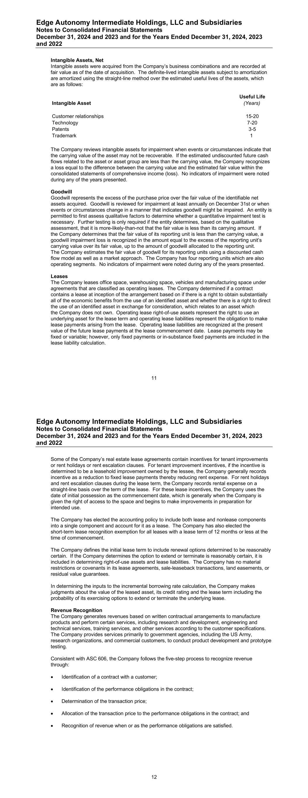 Edge Autonomy Intermediate Holdings, LLC and Subsidiaries Notes to Consolidated Financial Statements December 31, 2024 and 2023 and for the Years Ended December 31, 2024, 2023 and 2022 11 Intangible Assets, Net Intangible assets were acquired from the Company’s business combinations and are recorded at fair value as of the date of acquisition. The definite-lived intangible assets subject to amortization are amortized using the straight-line method over the estimated useful lives of the assets, which are as follows: Useful Life Intangible Asset (Years) Customer relationships 15-20 Technology 7-20 Patents 3-5 Trademark 1 The Company reviews intangible assets for impairment when events or circumstances indicate that the carrying value of the asset may not be recoverable. If the estimated undiscounted future cash flows related to the asset or asset group are less than the carrying value, the Company recognizes a loss equal to the difference between the carrying value and the estimated fair value within the consolidated statements of comprehensive income (loss). No indicators of impairment were noted during any of the years presented. Goodwill Goodwill represents the excess of the purchase price over the fair value of the identifiable net assets acquired. Goodwill is reviewed for impairment at least annually on December 31st or when events or circumstances change in a manner that indicates goodwill might be impaired. An entity is permitted to first assess qualitative factors to determine whether a quantitative impairment test is necessary. Further testing is only required if the entity determines, based on the qualitative assessment, that it is more-likely-than-not that the fair value is less than its carrying amount. If the Company determines that the fair value of its reporting unit is less than the carrying value, a goodwill impairment loss is recognized in the amount equal to the excess of the reporting unit’s carrying value over its fair value, up to the amount of goodwill allocated to the reporting unit. The Company estimates the fair value of goodwill for its reporting units using a discounted cash flow model as well as a market approach. The Company has four reporting units which are also operating segments. No indicators of impairment were noted during any of the years presented. Leases The Company leases office space, warehousing space, vehicles and manufacturing space under agreements that are classified as operating leases. The Company determined if a contract contains a lease at inception of the arrangement based on if there is a right to obtain substantially all of the economic benefits from the use of an identified asset and whether there is a right to direct the use of an identified asset in exchange for consideration, which relates to an asset which the Company does not own. Operating lease right-of-use assets represent the right to use an underlying asset for the lease term and operating lease liabilities represent the obligation to make lease payments arising from the lease. Operating lease liabilities are recognized at the present value of the future lease payments at the lease commencement date. Lease payments may be fixed or variable; however, only fixed payments or in-substance fixed payments are included in the lease liability calculation. Edge Autonomy Intermediate Holdings, LLC and Subsidiaries Notes to Consolidated Financial Statements December 31, 2024 and 2023 and for the Years Ended December 31, 2024, 2023 and 2022 12 Some of the Company’s real estate lease agreements contain incentives for tenant improvements or rent holidays or rent escalation clauses. For tenant improvement incentives, if the incentive is determined to be a leasehold improvement owned by the lessee, the Company generally records incentive as a reduction to fixed lease payments thereby reducing rent expense. For rent holidays and rent escalation clauses during the lease term, the Company records rental expense on a straight-line basis over the term of the lease. For these lease incentives, the Company uses the date of initial possession as the commencement date, which is generally when the Company is given the right of access to the space and begins to make improvements in preparation for intended use. The Company has elected the accounting policy to include both lease and nonlease components into a single component and account for it as a lease. The Company has also elected the short-term lease recognition exemption for all leases with a lease term of 12 months or less at the time of commencement. The Company defines the initial lease term to include renewal options determined to be reasonably certain. If the Company determines the option to extend or terminate is reasonably certain, it is included in determining right-of-use assets and lease liabilities. The Company has no material restrictions or covenants in its lease agreements, sale-leaseback transactions, land easements, or residual value guarantees. In determining the inputs to the incremental borrowing rate calculation, the Company makes judgments about the value of the leased asset, its credit rating and the lease term including the probability of its exercising options to extend or terminate the underlying lease. Revenue Recognition The Company generates revenues based on written contractual arrangements to manufacture products and perform certain services, including research and development, engineering and technical services, training services, and other services according to the customer specifications. The Company provides services primarily to government agencies, including the US Army, research organizations, and commercial customers, to conduct product development and prototype testing. Consistent with ASC 606, the Company follows the five-step process to recognize revenue through: Identification of a contract with a customer; Identification of the performance obligations in the contract; Determination of the transaction