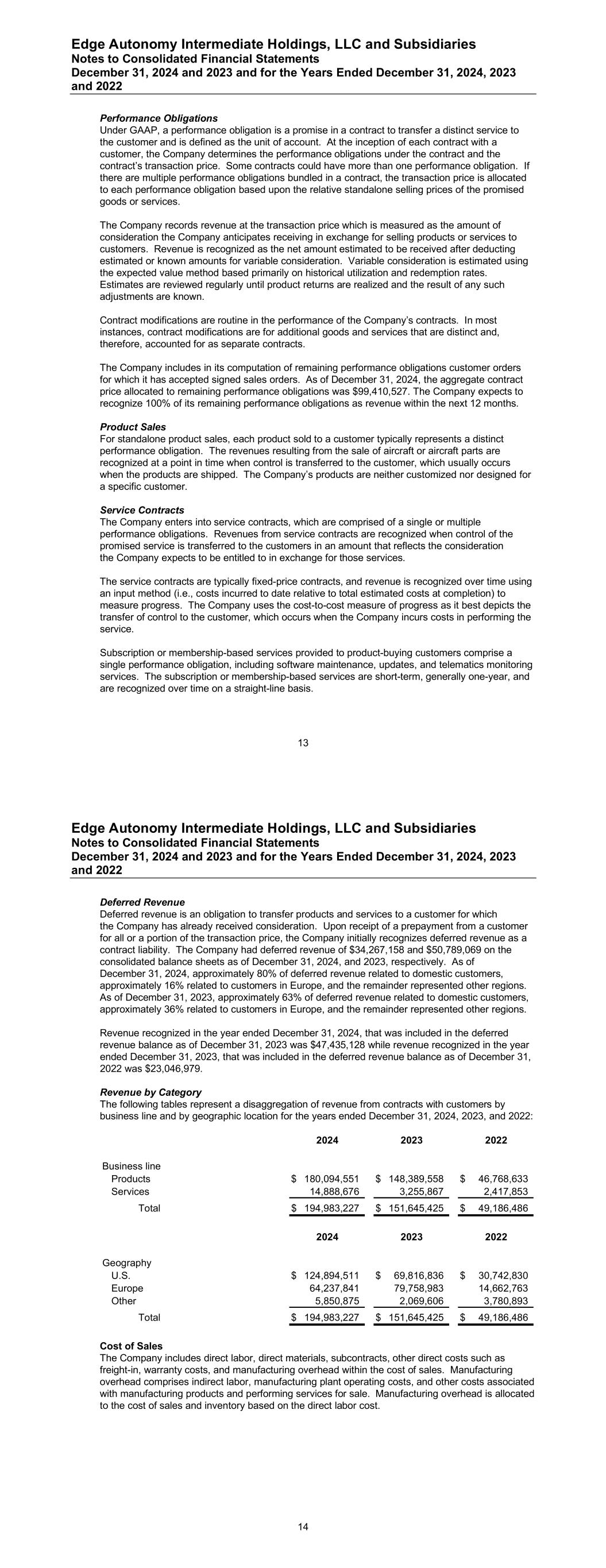 Edge Autonomy Intermediate Holdings, LLC and Subsidiaries Notes to Consolidated Financial Statements December 31, 2024 and 2023 and for the Years Ended December 31, 2024, 2023 and 2022 13 Performance Obligations Under GAAP, a performance obligation is a promise in a contract to transfer a distinct service to the customer and is defined as the unit of account. At the inception of each contract with a customer, the Company determines the performance obligations under the contract and the contract’s transaction price. Some contracts could have more than one performance obligation. If there are multiple performance obligations bundled in a contract, the transaction price is allocated to each performance obligation based upon the relative standalone selling prices of the promised goods or services. The Company records revenue at the transaction price which is measured as the amount of consideration the Company anticipates receiving in exchange for selling products or services to customers. Revenue is recognized as the net amount estimated to be received after deducting estimated or known amounts for variable consideration. Variable consideration is estimated using the expected value method based primarily on historical utilization and redemption rates. Estimates are reviewed regularly until product returns are realized and the result of any such adjustments are known. Contract modifications are routine in the performance of the Company’s contracts. In most instances, contract modifications are for additional goods and services that are distinct and, therefore, accounted for as separate contracts. The Company includes in its computation of remaining performance obligations customer orders for which it has accepted signed sales orders. As of December 31, 2024, the aggregate contract price allocated to remaining performance obligations was $99,410,527. The Company expects to recognize 100% of its remaining performance obligations as revenue within the next 12 months. Product Sales For standalone product sales, each product sold to a customer typically represents a distinct performance obligation. The revenues resulting from the sale of aircraft or aircraft parts are recognized at a point in time when control is transferred to the customer, which usually occurs when the products are shipped. The Company’s products are neither customized nor designed for a specific customer. Service Contracts The Company enters into service contracts, which are comprised of a single or multiple performance obligations. Revenues from service contracts are recognized when control of the promised service is transferred to the customers in an amount that reflects the consideration the Company expects to be entitled to in exchange for those services. The service contracts are typically fixed-price contracts, and revenue is recognized over time using an input method (i.e., costs incurred to date relative to total estimated costs at completion) to measure progress. The Company uses the cost-to-cost measure of progress as it best depicts the transfer of control to the customer, which occurs when the Company incurs costs in performing the service. Subscription or membership-based services provided to product-buying customers comprise a single performance obligation, including software maintenance, updates, and telematics monitoring services. The subscription or membership-based services are short-term, generally one-year, and are recognized over time on a straight-line basis. Edge Autonomy Intermediate Holdings, LLC and Subsidiaries Notes to Consolidated Financial Statements December 31, 2024 and 2023 and for the Years Ended December 31, 2024, 2023 and 2022 14 Deferred Revenue Deferred revenue is an obligation to transfer products and services to a customer for which the Company has already received consideration. Upon receipt of a prepayment from a customer for all or a portion of the transaction price, the Company initially recognizes deferred revenue as a contract liability. The Company had deferred revenue of $34,267,158 and $50,789,069 on the consolidated balance sheets as of December 31, 2024, and 2023, respectively. As of December 31, 2024, approximately 80% of deferred revenue related to domestic customers, approximately 16% related to customers in Europe, and the remainder represented other regions. As of December 31, 2023, approximately 63% of deferred revenue related to domestic customers, approximately 36% related to customers in Europe, and the remainder represented other regions. Revenue recognized in the year ended December 31, 2024, that was included in the deferred revenue balance as of December 31, 2023 was $47,435,128 while revenue recognized in the year ended December 31, 2023, that was included in the deferred revenue balance as of December 31, 2022 was $23,046,979. Revenue by Category The following tables represent a disaggregation of revenue from contracts with customers by business line and by geographic location for the years ended December 31, 2024, 2023, and 2022: 2024 2023 2022 Business line Products 180,094,551$ 148,389,558$ 46,768,633$ Services 14,888,676 3,255,867 2,417,853 Total 194,983,227$ 151,645,425$ 49,186,486$ 2024 2023 2022 Geography U.S. 124,894,511$ 69,816,836$ 30,742,830$ Europe 64,237,841 79,758,983 14,662,763 Other 5,850,875 2,069,606 3,780,893 Total 194,983,227$ 151,645,425$ 49,186,486$ Cost of Sales The Company includes direct labor, direct materials, subcontracts, other direct costs such as freight-in, warranty costs, and manufacturing overhead within the cost of sales. Manufacturing overhead comprises indirect labor, manufacturing plant operating costs, and other costs associated with manufacturing products and performing services for sale. Manufacturing overhead is allocated to the cost of sales and inventory based on the direct labor cost.
