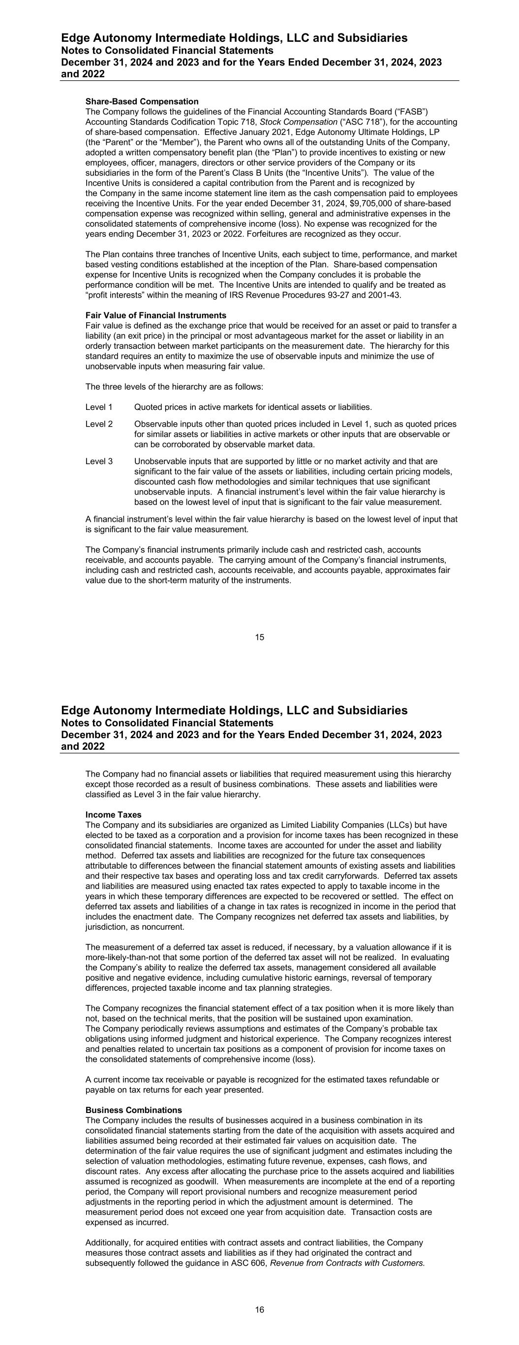 Edge Autonomy Intermediate Holdings, LLC and Subsidiaries Notes to Consolidated Financial Statements December 31, 2024 and 2023 and for the Years Ended December 31, 2024, 2023 and 2022 15 Share-Based Compensation The Company follows the guidelines of the Financial Accounting Standards Board (“FASB”) Accounting Standards Codification Topic 718, Stock Compensation (“ASC 718”), for the accounting of share-based compensation. Effective January 2021, Edge Autonomy Ultimate Holdings, LP (the “Parent” or the “Member”), the Parent who owns all of the outstanding Units of the Company, adopted a written compensatory benefit plan (the “Plan”) to provide incentives to existing or new employees, officer, managers, directors or other service providers of the Company or its subsidiaries in the form of the Parent’s Class B Units (the “Incentive Units”). The value of the Incentive Units is considered a capital contribution from the Parent and is recognized by the Company in the same income statement line item as the cash compensation paid to employees receiving the Incentive Units. For the year ended December 31, 2024, $9,705,000 of share-based compensation expense was recognized within selling, general and administrative expenses in the consolidated statements of comprehensive income (loss). No expense was recognized for the years ending December 31, 2023 or 2022. Forfeitures are recognized as they occur. The Plan contains three tranches of Incentive Units, each subject to time, performance, and market based vesting conditions established at the inception of the Plan. Share-based compensation expense for Incentive Units is recognized when the Company concludes it is probable the performance condition will be met. The Incentive Units are intended to qualify and be treated as “profit interests” within the meaning of IRS Revenue Procedures 93-27 and 2001-43. Fair Value of Financial Instruments Fair value is defined as the exchange price that would be received for an asset or paid to transfer a liability (an exit price) in the principal or most advantageous market for the asset or liability in an orderly transaction between market participants on the measurement date. The hierarchy for this standard requires an entity to maximize the use of observable inputs and minimize the use of unobservable inputs when measuring fair value. The three levels of the hierarchy are as follows: Level 1 Quoted prices in active markets for identical assets or liabilities. Level 2 Observable inputs other than quoted prices included in Level 1, such as quoted prices for similar assets or liabilities in active markets or other inputs that are observable or can be corroborated by observable market data. Level 3 Unobservable inputs that are supported by little or no market activity and that are significant to the fair value of the assets or liabilities, including certain pricing models, discounted cash flow methodologies and similar techniques that use significant unobservable inputs. A financial instrument’s level within the fair value hierarchy is based on the lowest level of input that is significant to the fair value measurement. A financial instrument’s level within the fair value hierarchy is based on the lowest level of input that is significant to the fair value measurement. The Company’s financial instruments primarily include cash and restricted cash, accounts receivable, and accounts payable. The carrying amount of the Company’s financial instruments, including cash and restricted cash, accounts receivable, and accounts payable, approximates fair value due to the short-term maturity of the instruments. Edge Autonomy Intermediate Holdings, LLC and Subsidiaries Notes to Consolidated Financial Statements December 31, 2024 and 2023 and for the Years Ended December 31, 2024, 2023 and 2022 16 The Company had no financial assets or liabilities that required measurement using this hierarchy except those recorded as a result of business combinations. These assets and liabilities were classified as Level 3 in the fair value hierarchy. Income Taxes The Company and its subsidiaries are organized as Limited Liability Companies (LLCs) but have elected to be taxed as a corporation and a provision for income taxes has been recognized in these consolidated financial statements. Income taxes are accounted for under the asset and liability method. Deferred tax assets and liabilities are recognized for the future tax consequences attributable to differences between the financial statement amounts of existing assets and liabilities and their respective tax bases and operating loss and tax credit carryforwards. Deferred tax assets and liabilities are measured using enacted tax rates expected to apply to taxable income in the years in which these temporary differences are expected to be recovered or settled. The effect on deferred tax assets and liabilities of a change in tax rates is recognized in income in the period that includes the enactment date. The Company recognizes net deferred tax assets and liabilities, by jurisdiction, as noncurrent. The measurement of a deferred tax asset is reduced, if necessary, by a valuation allowance if it is more-likely-than-not that some portion of the deferred tax asset will not be realized. In evaluating the Company’s ability to realize the deferred tax assets, management considered all available positive and negative evidence, including cumulative historic earnings, reversal of temporary differences, projected taxable income and tax planning strategies. The Company recognizes the financial statement effect of a tax position when it is more likely than not, based on the technical merits, that the position will be sustained upon examination. The Company periodically reviews assumptions and estimates of the Company’s probable tax obligations using informed judgment and historical experience. The Company recognizes interest and penalties related to uncertain tax pos