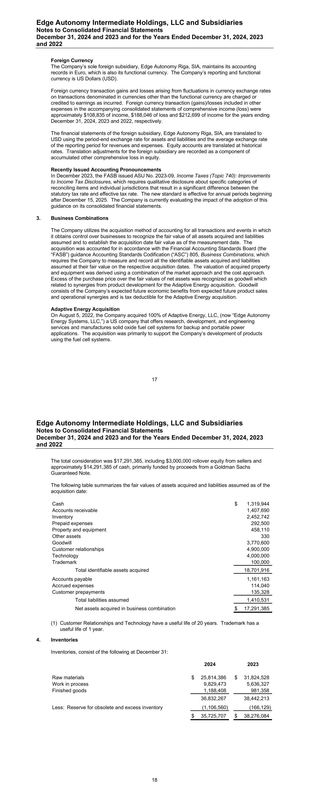 Edge Autonomy Intermediate Holdings, LLC and Subsidiaries Notes to Consolidated Financial Statements December 31, 2024 and 2023 and for the Years Ended December 31, 2024, 2023 and 2022 17 Foreign Currency The Company’s sole foreign subsidiary, Edge Autonomy Riga, SIA, maintains its accounting records in Euro, which is also its functional currency. The Company’s reporting and functional currency is US Dollars (USD). Foreign currency transaction gains and losses arising from fluctuations in currency exchange rates on transactions denominated in currencies other than the functional currency are charged or credited to earnings as incurred. Foreign currency transaction (gains)/losses included in other expenses in the accompanying consolidated statements of comprehensive income (loss) were approximately $108,835 of income, $188,046 of loss and $212,699 of income for the years ending December 31, 2024, 2023 and 2022, respectively. The financial statements of the foreign subsidiary, Edge Autonomy Riga, SIA, are translated to USD using the period-end exchange rate for assets and liabilities and the average exchange rate of the reporting period for revenues and expenses. Equity accounts are translated at historical rates. Translation adjustments for the foreign subsidiary are recorded as a component of accumulated other comprehensive loss in equity. Recently Issued Accounting Pronouncements In December 2023, the FASB issued ASU No. 2023-09, Income Taxes (Topic 740): Improvements to Income Tax Disclosures, which requires qualitative disclosure about specific categories of reconciling items and individual jurisdictions that result in a significant difference between the statutory tax rate and effective tax rate. The new standard is effective for annual periods beginning after December 15, 2025. The Company is currently evaluating the impact of the adoption of this guidance on its consolidated financial statements. 3. Business Combinations The Company utilizes the acquisition method of accounting for all transactions and events in which it obtains control over businesses to recognize the fair value of all assets acquired and liabilities assumed and to establish the acquisition date fair value as of the measurement date. The acquisition was accounted for in accordance with the Financial Accounting Standards Board (the “FASB”) guidance Accounting Standards Codification (“ASC”) 805, Business Combinations, which requires the Company to measure and record all the identifiable assets acquired and liabilities assumed at their fair value on the respective acquisition dates. The valuation of acquired property and equipment was derived using a combination of the market approach and the cost approach. Excess of the purchase price over the fair values of net assets was recognized as goodwill which related to synergies from product development for the Adaptive Energy acquisition. Goodwill consists of the Company’s expected future economic benefits from expected future product sales and operational synergies and is tax deductible for the Adaptive Energy acquisition. Adaptive Energy Acquisition On August 5, 2022, the Company acquired 100% of Adaptive Energy, LLC, (now “Edge Autonomy Energy Systems, LLC,”) a US company that offers research, development, and engineering services and manufactures solid oxide fuel cell systems for backup and portable power applications. The acquisition was primarily to support the Company’s development of products using the fuel cell systems. Edge Autonomy Intermediate Holdings, LLC and Subsidiaries Notes to Consolidated Financial Statements December 31, 2024 and 2023 and for the Years Ended December 31, 2024, 2023 and 2022 18 The total consideration was $17,291,385, including $3,000,000 rollover equity from sellers and approximately $14,291,385 of cash, primarily funded by proceeds from a Goldman Sachs Guaranteed Note. The following table summarizes the fair values of assets acquired and liabilities assumed as of the acquisition date: Cash 1,319,944$ Accounts receivable 1,407,690 Inventory 2,452,742 Prepaid expenses 292,500 Property and equipment 458,110 Other assets 330 Goodwill 3,770,600 Customer relationships 4,900,000 Technology 4,000,000 Trademark 100,000 Total identifiable assets acquired 18,701,916 Accounts payable 1,161,163 Accrued expenses 114,040 Customer prepayments 135,328 Total liabilities assumed 1,410,531 Net assets acquired in business combination 17,291,385$ (1) Customer Relationships and Technology have a useful life of 20 years. Trademark has a useful life of 1 year. 4. Inventories Inventories, consist of the following at December 31: 2024 2023 Raw materials 25,814,386$ 31,824,528$ Work in process 9,829,473 5,636,327 Finished goods 1,188,408 981,358 36,832,267 38,442,213 Less: Reserve for obsolete and excess inventory (1,106,560) (166,129) 35,725,707$ 38,276,084$