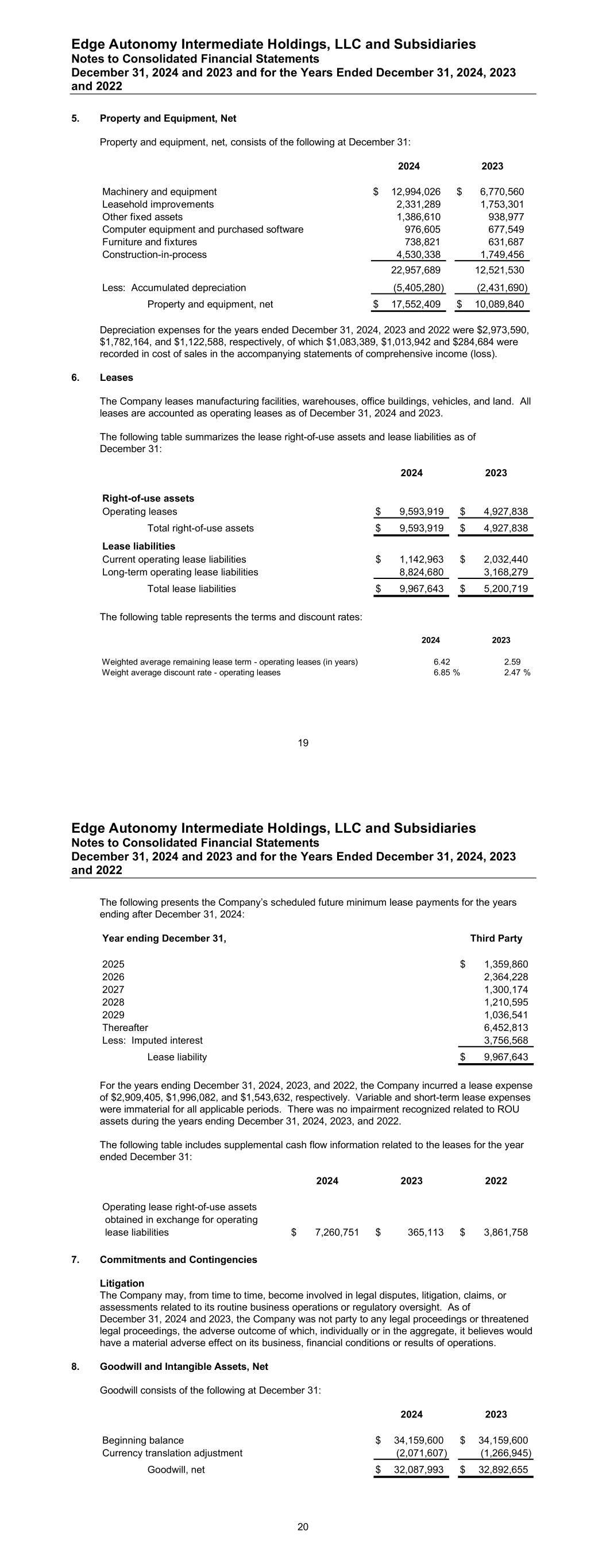 Edge Autonomy Intermediate Holdings, LLC and Subsidiaries Notes to Consolidated Financial Statements December 31, 2024 and 2023 and for the Years Ended December 31, 2024, 2023 and 2022 19 5. Property and Equipment, Net Property and equipment, net, consists of the following at December 31: 2024 2023 Machinery and equipment 12,994,026$ 6,770,560$ Leasehold improvements 2,331,289 1,753,301 Other fixed assets 1,386,610 938,977 Computer equipment and purchased software 976,605 677,549 Furniture and fixtures 738,821 631,687 Construction-in-process 4,530,338 1,749,456 22,957,689 12,521,530 Less: Accumulated depreciation (5,405,280) (2,431,690) Property and equipment, net 17,552,409$ 10,089,840$ Depreciation expenses for the years ended December 31, 2024, 2023 and 2022 were $2,973,590, $1,782,164, and $1,122,588, respectively, of which $1,083,389, $1,013,942 and $284,684 were recorded in cost of sales in the accompanying statements of comprehensive income (loss). 6. Leases The Company leases manufacturing facilities, warehouses, office buildings, vehicles, and land. All leases are accounted as operating leases as of December 31, 2024 and 2023. The following table summarizes the lease right-of-use assets and lease liabilities as of December 31: 2024 2023 Right-of-use assets Operating leases 9,593,919$ 4,927,838$ Total right-of-use assets 9,593,919$ 4,927,838$ Lease liabilities Current operating lease liabilities 1,142,963$ 2,032,440$ Long-term operating lease liabilities 8,824,680 3,168,279 Total lease liabilities 9,967,643$ 5,200,719$ The following table represents the terms and discount rates: 2024 2023 Weighted average remaining lease term - operating leases (in years) 6.42 2.59 Weight average discount rate - operating leases 6.85 % 2.47 % Edge Autonomy Intermediate Holdings, LLC and Subsidiaries Notes to Consolidated Financial Statements December 31, 2024 and 2023 and for the Years Ended December 31, 2024, 2023 and 2022 20 The following presents the Company’s scheduled future minimum lease payments for the years ending after December 31, 2024: Year ending December 31, Third Party 2025 1,359,860$ 2026 2,364,228 2027 1,300,174 2028 1,210,595 2029 1,036,541 Thereafter 6,452,813 Less: Imputed interest 3,756,568 Lease liability 9,967,643$ For the years ending December 31, 2024, 2023, and 2022, the Company incurred a lease expense of $2,909,405, $1,996,082, and $1,543,632, respectively. Variable and short-term lease expenses were immaterial for all applicable periods. There was no impairment recognized related to ROU assets during the years ending December 31, 2024, 2023, and 2022. The following table includes supplemental cash flow information related to the leases for the year ended December 31: 2024 2023 2022 Operating lease right-of-use assets obtained in exchange for operating lease liabilities 7,260,751$ 365,113$ 3,861,758$ 7. Commitments and Contingencies Litigation The Company may, from time to time, become involved in legal disputes, litigation, claims, or assessments related to its routine business operations or regulatory oversight. As of December 31, 2024 and 2023, the Company was not party to any legal proceedings or threatened legal proceedings, the adverse outcome of which, individually or in the aggregate, it believes would have a material adverse effect on its business, financial conditions or results of operations. 8. Goodwill and Intangible Assets, Net Goodwill consists of the following at December 31: 2024 2023 Beginning balance 34,159,600$ 34,159,600$ Currency translation adjustment (2,071,607) (1,266,945) Goodwill, net 32,087,993$ 32,892,655$