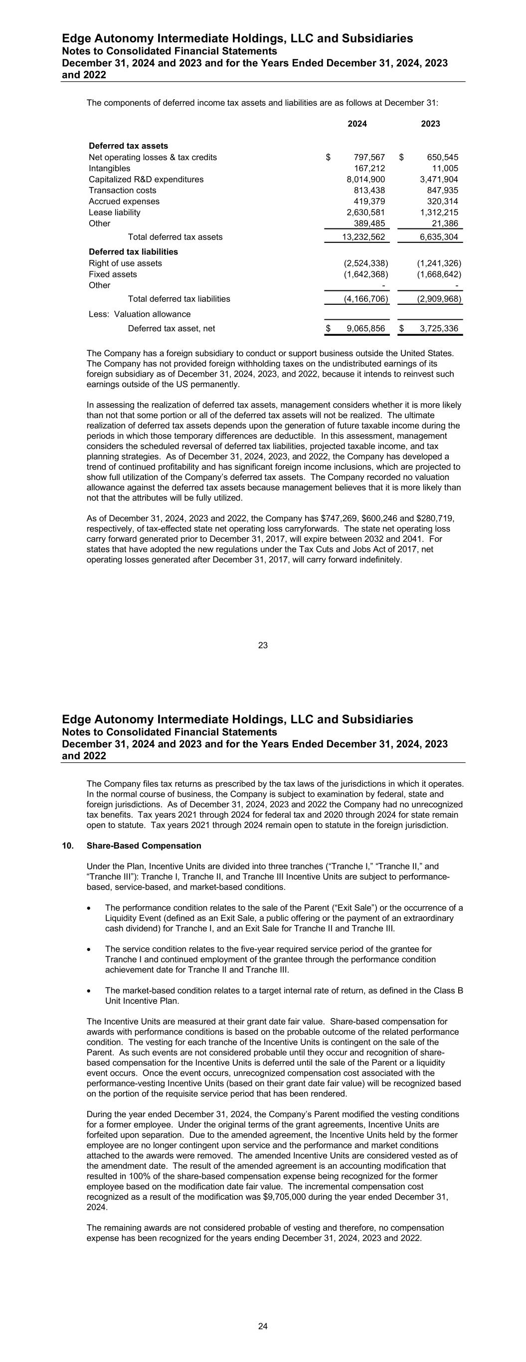 Edge Autonomy Intermediate Holdings, LLC and Subsidiaries Notes to Consolidated Financial Statements December 31, 2024 and 2023 and for the Years Ended December 31, 2024, 2023 and 2022 23 The components of deferred income tax assets and liabilities are as follows at December 31: 2024 2023 Deferred tax assets Net operating losses & tax credits 797,567$ 650,545$ Intangibles 167,212 11,005 Capitalized R&D expenditures 8,014,900 3,471,904 Transaction costs 813,438 847,935 Accrued expenses 419,379 320,314 Lease liability 2,630,581 1,312,215 Other 389,485 21,386 Total deferred tax assets 13,232,562 6,635,304 Deferred tax liabilities Right of use assets (2,524,338) (1,241,326) Fixed assets (1,642,368) (1,668,642) Other - - Total deferred tax liabilities (4,166,706) (2,909,968) Less: Valuation allowance Deferred tax asset, net 9,065,856$ 3,725,336$ The Company has a foreign subsidiary to conduct or support business outside the United States. The Company has not provided foreign withholding taxes on the undistributed earnings of its foreign subsidiary as of December 31, 2024, 2023, and 2022, because it intends to reinvest such earnings outside of the US permanently. In assessing the realization of deferred tax assets, management considers whether it is more likely than not that some portion or all of the deferred tax assets will not be realized. The ultimate realization of deferred tax assets depends upon the generation of future taxable income during the periods in which those temporary differences are deductible. In this assessment, management considers the scheduled reversal of deferred tax liabilities, projected taxable income, and tax planning strategies. As of December 31, 2024, 2023, and 2022, the Company has developed a trend of continued profitability and has significant foreign income inclusions, which are projected to show full utilization of the Company’s deferred tax assets. The Company recorded no valuation allowance against the deferred tax assets because management believes that it is more likely than not that the attributes will be fully utilized. As of December 31, 2024, 2023 and 2022, the Company has $747,269, $600,246 and $280,719, respectively, of tax-effected state net operating loss carryforwards. The state net operating loss carry forward generated prior to December 31, 2017, will expire between 2032 and 2041. For states that have adopted the new regulations under the Tax Cuts and Jobs Act of 2017, net operating losses generated after December 31, 2017, will carry forward indefinitely. Edge Autonomy Intermediate Holdings, LLC and Subsidiaries Notes to Consolidated Financial Statements December 31, 2024 and 2023 and for the Years Ended December 31, 2024, 2023 and 2022 24 The Company files tax returns as prescribed by the tax laws of the jurisdictions in which it operates. In the normal course of business, the Company is subject to examination by federal, state and foreign jurisdictions. As of December 31, 2024, 2023 and 2022 the Company had no unrecognized tax benefits. Tax years 2021 through 2024 for federal tax and 2020 through 2024 for state remain open to statute. Tax years 2021 through 2024 remain open to statute in the foreign jurisdiction. 10. Share-Based Compensation Under the Plan, Incentive Units are divided into three tranches (“Tranche I,” “Tranche II,” and “Tranche III”): Tranche I, Tranche II, and Tranche III Incentive Units are subject to performance- based, service-based, and market-based conditions. The performance condition relates to the sale of the Parent (“Exit Sale”) or the occurrence of a Liquidity Event (defined as an Exit Sale, a public offering or the payment of an extraordinary cash dividend) for Tranche I, and an Exit Sale for Tranche II and Tranche III. The service condition relates to the five-year required service period of the grantee for Tranche I and continued employment of the grantee through the performance condition achievement date for Tranche II and Tranche III. The market-based condition relates to a target internal rate of return, as defined in the Class B Unit Incentive Plan. The Incentive Units are measured at their grant date fair value. Share-based compensation for awards with performance conditions is based on the probable outcome of the related performance condition. The vesting for each tranche of the Incentive Units is contingent on the sale of the Parent. As such events are not considered probable until they occur and recognition of share- based compensation for the Incentive Units is deferred until the sale of the Parent or a liquidity event occurs. Once the event occurs, unrecognized compensation cost associated with the performance-vesting Incentive Units (based on their grant date fair value) will be recognized based on the portion of the requisite service period that has been rendered. During the year ended December 31, 2024, the Company’s Parent modified the vesting conditions for a former employee. Under the original terms of the grant agreements, Incentive Units are forfeited upon separation. Due to the amended agreement, the Incentive Units held by the former employee are no longer contingent upon service and the performance and market conditions attached to the awards were removed. The amended Incentive Units are considered vested as of the amendment date. The result of the amended agreement is an accounting modification that resulted in 100% of the share-based compensation expense being recognized for the former employee based on the modification date fair value. The incremental compensation cost recognized as a result of the modification was $9,705,000 during the year ended December 31, 2024. The remaining awards are not considered probable of vesting and therefore, no compensation expense has been recognized for the years ending December 31, 2024, 2023 and 2022.