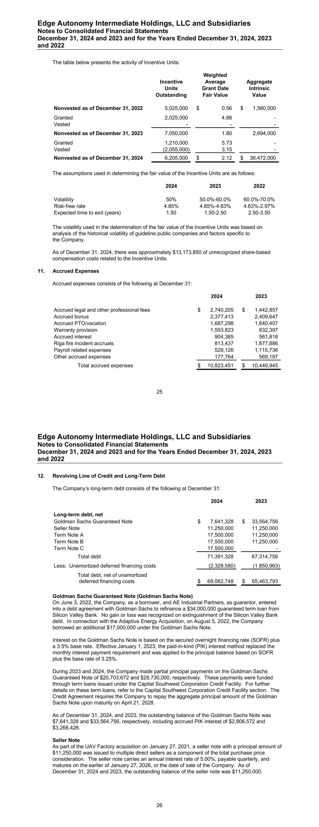 Edge Autonomy Intermediate Holdings, LLC and Subsidiaries Notes to Consolidated Financial Statements December 31, 2024 and 2023 and for the Years Ended December 31, 2024, 2023 and 2022 25 The table below presents the activity of Incentive Units: Weighted Incentive Average Aggregate Units Grant Date Intrinsic Outstanding Fair Value Value Nonvested as of December 31, 2022 5,025,000 0.56$ 1,560,000$ Granted 2,025,000 4.88 - Vested - - - Nonvested as of December 31, 2023 7,050,000 1.80 2,694,000 Granted 1,210,000 5.73 - Vested (2,055,000) 3.15 - Nonvested as of December 31, 2024 6,205,000 2.12$ 36,472,000$ The assumptions used in determining the fair value of the Incentive Units are as follows: 2024 2023 2022 Volatility 50% 50.0%-60.0% 60.0%-70.0% Risk-free rate 4.85% 4.85%-4.63% 4.63%-2.97% Expected time to exit (years) 1.50 1.50-2.50 2.50-3.50 The volatility used in the determination of the fair value of the Incentive Units was based on analysis of the historical volatility of guideline public companies and factors specific to the Company. As of December 31, 2024, there was approximately $13,173,850 of unrecognized share-based compensation costs related to the Incentive Units. 11. Accrued Expenses Accrued expenses consists of the following at December 31: 2024 2023 Accrued legal and other professional fees 2,740,205$ 1,442,857$ Accrued bonus 2,377,413 2,409,647 Accrued PTO/vacation 1,687,298 1,640,407 Warranty provision 1,593,823 832,397 Accrued interest 904,385 561,818 Riga fire incident accruals 813,437 1,877,886 Payroll related expenses 529,126 1,115,736 Other accrued expenses 177,764 569,197 Total accrued expenses 10,823,451$ 10,449,945$ Edge Autonomy Intermediate Holdings, LLC and Subsidiaries Notes to Consolidated Financial Statements December 31, 2024 and 2023 and for the Years Ended December 31, 2024, 2023 and 2022 26 12. Revolving Line of Credit and Long-Term Debt The Company’s long-term debt consists of the following at December 31: 2024 2023 Long-term debt, net Goldman Sachs Guaranteed Note 7,641,328$ 33,564,756$ Seller Note 11,250,000 11,250,000 Term Note A 17,500,000 11,250,000 Term Note B 17,500,000 11,250,000 Term Note C 17,500,000 - Total debt 71,391,328 67,314,756 Less: Unamortized deferred financing costs (2,328,580) (1,850,963) Total debt, net of unamortized deferred financing costs 69,062,748$ 65,463,793$ Goldman Sachs Guaranteed Note (Goldman Sachs Note) On June 3, 2022, the Company, as a borrower, and AE Industrial Partners, as guarantor, entered into a debt agreement with Goldman Sachs to refinance a $34,000,000 guaranteed term loan from Silicon Valley Bank. No gain or loss was recognized on extinguishment of the Silicon Valley Bank debt. In connection with the Adaptive Energy Acquisition, on August 5, 2022, the Company borrowed an additional $17,000,000 under the Goldman Sachs Note. Interest on the Goldman Sachs Note is based on the secured overnight financing rate (SOFR) plus a 3.5% base rate. Effective January 1, 2023, the paid-in-kind (PIK) interest method replaced the monthly interest payment requirement and was applied to the principal balance based on SOFR plus the base rate of 3.25%. During 2023 and 2024, the Company made partial principal payments on the Goldman Sachs Guaranteed Note of $20,703,672 and $28,730,000, respectively. These payments were funded through term loans issued under the Capital Southwest Corporation Credit Facility. For further details on these term loans, refer to the Capital Southwest Corporation Credit Facility section. The Credit Agreement requires the Company to repay the aggregate principal amount of the Goldman Sachs Note upon maturity on April 21, 2028. As of December 31, 2024, and 2023, the outstanding balance of the Goldman Sachs Note was $7,641,328 and $33,564,756, respectively, including accrued PIK interest of $2,806,572 and $3,268,428. Seller Note As part of the UAV Factory acquisition on January 27, 2021, a seller note with a principal amount of $11,250,000 was issued to multiple direct sellers as a component of the total purchase price consideration. The seller note carries an annual interest rate of 5.00%, payable quarterly, and matures on the earlier of January 27, 2026, or the date of sale of the Company. As of December 31, 2024 and 2023, the outstanding balance of the seller note was $11,250,000.