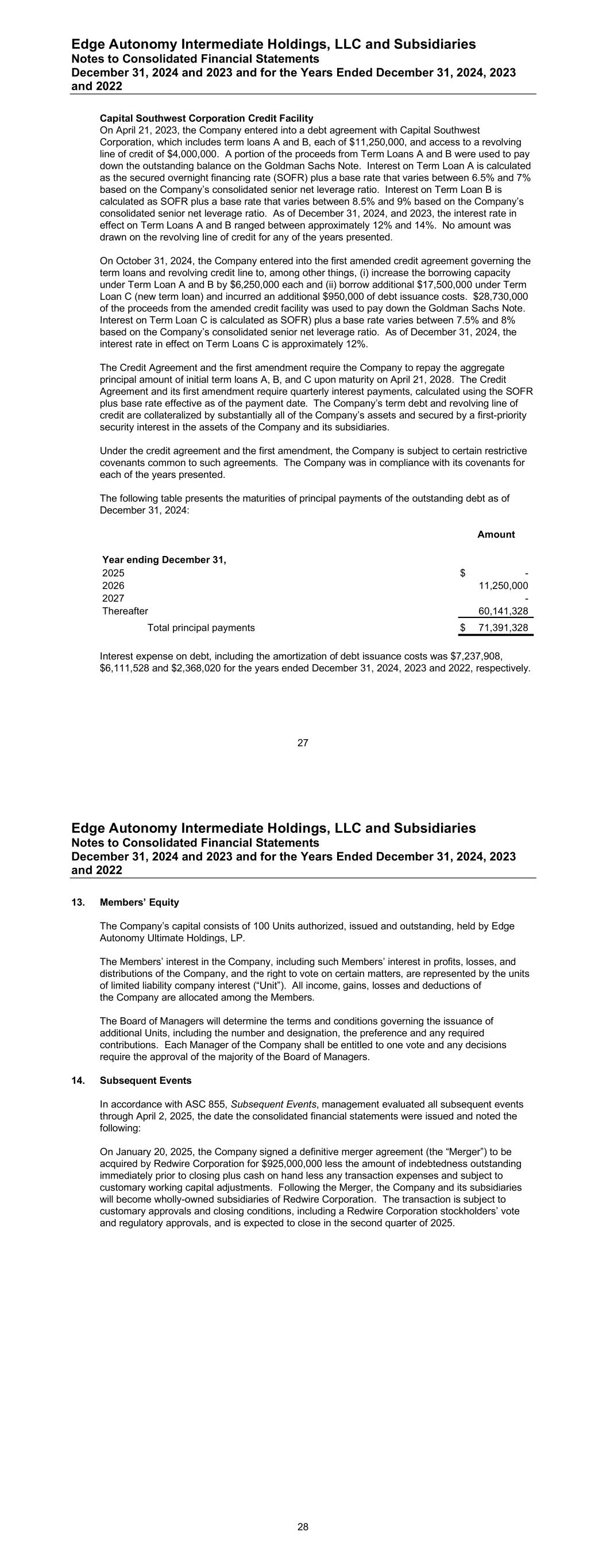 Edge Autonomy Intermediate Holdings, LLC and Subsidiaries Notes to Consolidated Financial Statements December 31, 2024 and 2023 and for the Years Ended December 31, 2024, 2023 and 2022 27 Capital Southwest Corporation Credit Facility On April 21, 2023, the Company entered into a debt agreement with Capital Southwest Corporation, which includes term loans A and B, each of $11,250,000, and access to a revolving line of credit of $4,000,000. A portion of the proceeds from Term Loans A and B were used to pay down the outstanding balance on the Goldman Sachs Note. Interest on Term Loan A is calculated as the secured overnight financing rate (SOFR) plus a base rate that varies between 6.5% and 7% based on the Company’s consolidated senior net leverage ratio. Interest on Term Loan B is calculated as SOFR plus a base rate that varies between 8.5% and 9% based on the Company’s consolidated senior net leverage ratio. As of December 31, 2024, and 2023, the interest rate in effect on Term Loans A and B ranged between approximately 12% and 14%. No amount was drawn on the revolving line of credit for any of the years presented. On October 31, 2024, the Company entered into the first amended credit agreement governing the term loans and revolving credit line to, among other things, (i) increase the borrowing capacity under Term Loan A and B by $6,250,000 each and (ii) borrow additional $17,500,000 under Term Loan C (new term loan) and incurred an additional $950,000 of debt issuance costs. $28,730,000 of the proceeds from the amended credit facility was used to pay down the Goldman Sachs Note. Interest on Term Loan C is calculated as SOFR) plus a base rate varies between 7.5% and 8% based on the Company’s consolidated senior net leverage ratio. As of December 31, 2024, the interest rate in effect on Term Loans C is approximately 12%. The Credit Agreement and the first amendment require the Company to repay the aggregate principal amount of initial term loans A, B, and C upon maturity on April 21, 2028. The Credit Agreement and its first amendment require quarterly interest payments, calculated using the SOFR plus base rate effective as of the payment date. The Company’s term debt and revolving line of credit are collateralized by substantially all of the Company’s assets and secured by a first-priority security interest in the assets of the Company and its subsidiaries. Under the credit agreement and the first amendment, the Company is subject to certain restrictive covenants common to such agreements. The Company was in compliance with its covenants for each of the years presented. The following table presents the maturities of principal payments of the outstanding debt as of December 31, 2024: Amount Year ending December 31, 2025 -$ 2026 11,250,000 2027 - Thereafter 60,141,328 Total principal payments 71,391,328$ Interest expense on debt, including the amortization of debt issuance costs was $7,237,908, $6,111,528 and $2,368,020 for the years ended December 31, 2024, 2023 and 2022, respectively. Edge Autonomy Intermediate Holdings, LLC and Subsidiaries Notes to Consolidated Financial Statements December 31, 2024 and 2023 and for the Years Ended December 31, 2024, 2023 and 2022 28 13. Members’ Equity The Company’s capital consists of 100 Units authorized, issued and outstanding, held by Edge Autonomy Ultimate Holdings, LP. The Members’ interest in the Company, including such Members’ interest in profits, losses, and distributions of the Company, and the right to vote on certain matters, are represented by the units of limited liability company interest (“Unit”). All income, gains, losses and deductions of the Company are allocated among the Members. The Board of Managers will determine the terms and conditions governing the issuance of additional Units, including the number and designation, the preference and any required contributions. Each Manager of the Company shall be entitled to one vote and any decisions require the approval of the majority of the Board of Managers. 14. Subsequent Events In accordance with ASC 855, Subsequent Events, management evaluated all subsequent events through April 2, 2025, the date the consolidated financial statements were issued and noted the following: On January 20, 2025, the Company signed a definitive merger agreement (the “Merger”) to be acquired by Redwire Corporation for $925,000,000 less the amount of indebtedness outstanding immediately prior to closing plus cash on hand less any transaction expenses and subject to customary working capital adjustments. Following the Merger, the Company and its subsidiaries will become wholly-owned subsidiaries of Redwire Corporation. The transaction is subject to customary approvals and closing conditions, including a Redwire Corporation stockholders’ vote and regulatory approvals, and is expected to close in the second quarter of 2025.