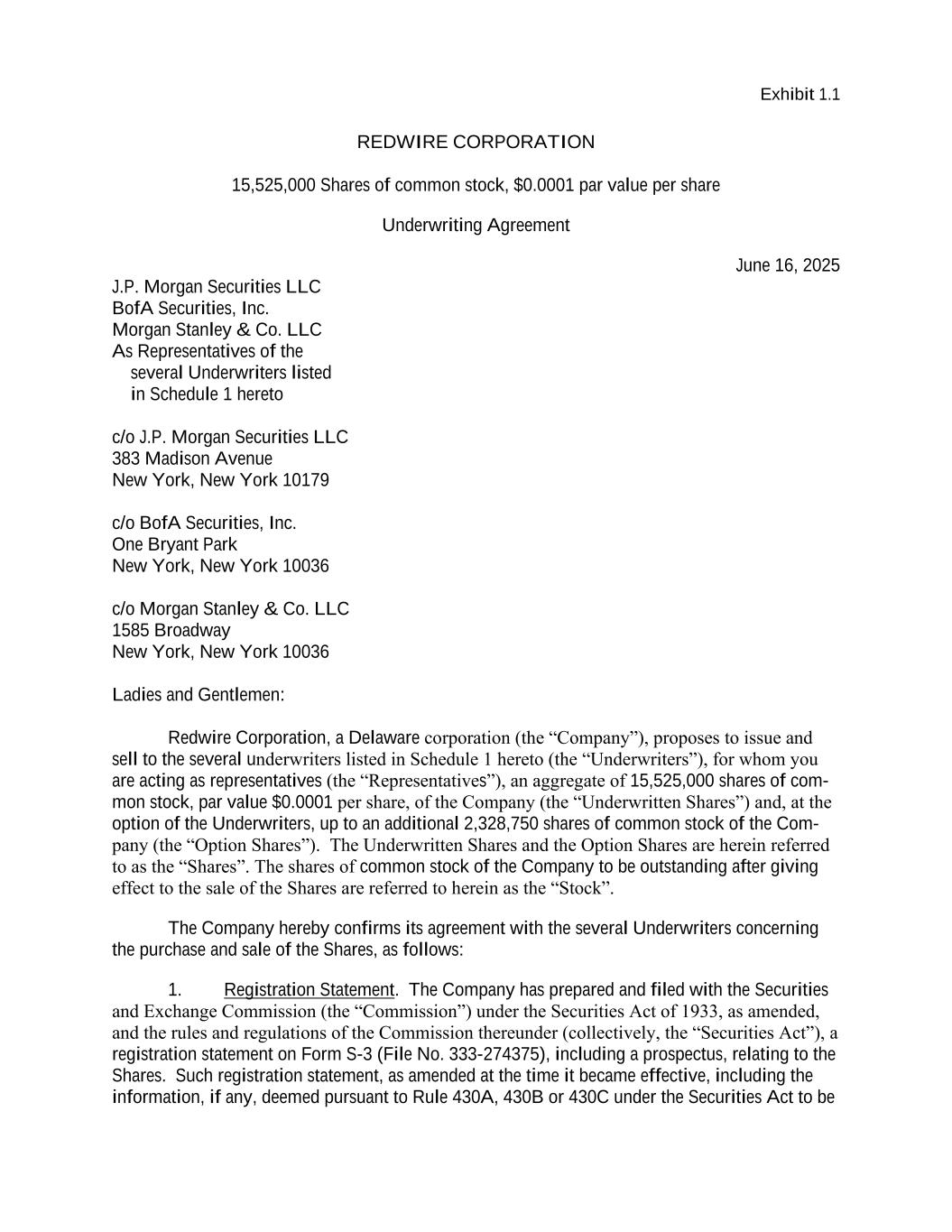 Exhibit 1.1 REDWIRE CORPORATION 15,525,000 Shares of common stock, $0.0001 par value per share Underwriting Agreement June 16, 2025 J.P. Morgan Securities LLC BofA Securities, Inc. Morgan Stanley & Co. LLC As Representatives of the several Underwriters listed in Schedule 1 hereto c/o J.P. Morgan Securities LLC 383 Madison Avenue New York, New York 10179 c/o BofA Securities, Inc. One Bryant Park New York, New York 10036 c/o Morgan Stanley & Co. LLC 1585 Broadway New York, New York 10036 Ladies and Gentlemen: Redwire Corporation, a Delaware corporation (the “Company”), proposes to issue and sell to the several underwriters listed in Schedule 1 hereto (the “Underwriters”), for whom you are acting as representatives (the “Representatives”), an aggregate of 15,525,000 shares of com- mon stock, par value $0.0001 per share, of the Company (the “Underwritten Shares”) and, at the option of the Underwriters, up to an additional 2,328,750 shares of common stock of the Com- pany (the “Option Shares”). The Underwritten Shares and the Option Shares are herein referred to as the “Shares”. The shares of common stock of the Company to be outstanding after giving effect to the sale of the Shares are referred to herein as the “Stock”. The Company hereby confirms its agreement with the several Underwriters concerning the purchase and sale of the Shares, as follows: 1. Registration Statement. The Company has prepared and filed with the Securities and Exchange Commission (the “Commission”) under the Securities Act of 1933, as amended, and the rules and regulations of the Commission thereunder (collectively, the “Securities Act”), a registration statement on Form S-3 (File No. 333-274375), including a prospectus, relating to the Shares. Such registration statement, as amended at the time it became effective, including the information, if any, deemed pursuant to Rule 430A, 430B or 430C under the Securities Act to be