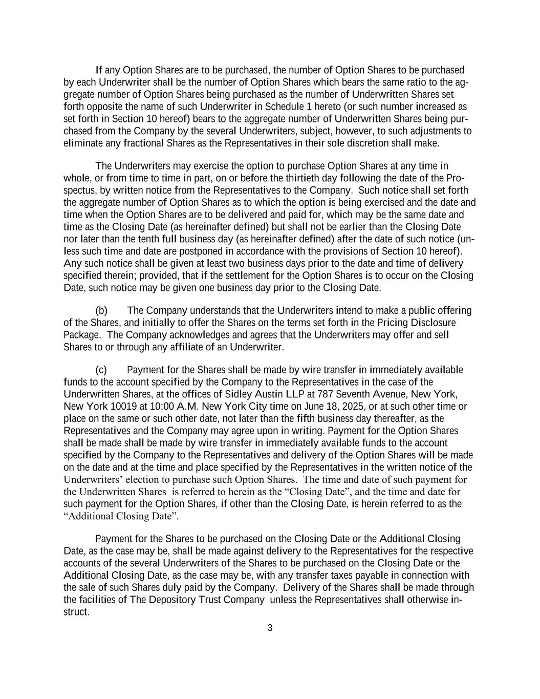 3 If any Option Shares are to be purchased, the number of Option Shares to be purchased by each Underwriter shall be the number of Option Shares which bears the same ratio to the ag- gregate number of Option Shares being purchased as the number of Underwritten Shares set forth opposite the name of such Underwriter in Schedule 1 hereto (or such number increased as set forth in Section 10 hereof) bears to the aggregate number of Underwritten Shares being pur- chased from the Company by the several Underwriters, subject, however, to such adjustments to eliminate any fractional Shares as the Representatives in their sole discretion shall make. The Underwriters may exercise the option to purchase Option Shares at any time in whole, or from time to time in part, on or before the thirtieth day following the date of the Pro- spectus, by written notice from the Representatives to the Company. Such notice shall set forth the aggregate number of Option Shares as to which the option is being exercised and the date and time when the Option Shares are to be delivered and paid for, which may be the same date and time as the Closing Date (as hereinafter defined) but shall not be earlier than the Closing Date nor later than the tenth full business day (as hereinafter defined) after the date of such notice (un- less such time and date are postponed in accordance with the provisions of Section 10 hereof). Any such notice shall be given at least two business days prior to the date and time of delivery specified therein; provided, that if the settlement for the Option Shares is to occur on the Closing Date, such notice may be given one business day prior to the Closing Date. (b) The Company understands that the Underwriters intend to make a public offering of the Shares, and initially to offer the Shares on the terms set forth in the Pricing Disclosure Package. The Company acknowledges and agrees that the Underwriters may offer and sell Shares to or through any affiliate of an Underwriter. (c) Payment for the Shares shall be made by wire transfer in immediately available funds to the account specified by the Company to the Representatives in the case of the Underwritten Shares, at the offices of Sidley Austin LLP at 787 Seventh Avenue, New York, New York 10019 at 10:00 A.M. New York City time on June 18, 2025, or at such other time or place on the same or such other date, not later than the fifth business day thereafter, as the Representatives and the Company may agree upon in writing. Payment for the Option Shares shall be made shall be made by wire transfer in immediately available funds to the account specified by the Company to the Representatives and delivery of the Option Shares will be made on the date and at the time and place specified by the Representatives in the written notice of the Underwriters’ election to purchase such Option Shares. The time and date of such payment for the Underwritten Shares is referred to herein as the “Closing Date”, and the time and date for such payment for the Option Shares, if other than the Closing Date, is herein referred to as the “Additional Closing Date”. Payment for the Shares to be purchased on the Closing Date or the Additional Closing Date, as the case may be, shall be made against delivery to the Representatives for the respective accounts of the several Underwriters of the Shares to be purchased on the Closing Date or the Additional Closing Date, as the case may be, with any transfer taxes payable in connection with the sale of such Shares duly paid by the Company. Delivery of the Shares shall be made through the facilities of The Depository Trust Company unless the Representatives shall otherwise in- struct.