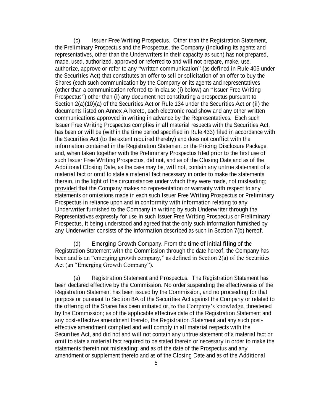 5 (c) Issuer Free Writing Prospectus. Other than the Registration Statement, the Preliminary Prospectus and the Prospectus, the Company (including its agents and representatives, other than the Underwriters in their capacity as such) has not prepared, made, used, authorized, approved or referred to and will not prepare, make, use, authorize, approve or refer to any “written communication” (as defined in Rule 405 under the Securities Act) that constitutes an offer to sell or solicitation of an offer to buy the Shares (each such communication by the Company or its agents and representatives (other than a communication referred to in clause (i) below) an “Issuer Free Writing Prospectus”) other than (i) any document not constituting a prospectus pursuant to Section 2(a)(10)(a) of the Securities Act or Rule 134 under the Securities Act or (ii) the documents listed on Annex A hereto, each electronic road show and any other written communications approved in writing in advance by the Representatives. Each such Issuer Free Writing Prospectus complies in all material respects with the Securities Act, has been or will be (within the time period specified in Rule 433) filed in accordance with the Securities Act (to the extent required thereby) and does not conflict with the information contained in the Registration Statement or the Pricing Disclosure Package, and, when taken together with the Preliminary Prospectus filed prior to the first use of such Issuer Free Writing Prospectus, did not, and as of the Closing Date and as of the Additional Closing Date, as the case may be, will not, contain any untrue statement of a material fact or omit to state a material fact necessary in order to make the statements therein, in the light of the circumstances under which they were made, not misleading; provided that the Company makes no representation or warranty with respect to any statements or omissions made in each such Issuer Free Writing Prospectus or Preliminary Prospectus in reliance upon and in conformity with information relating to any Underwriter furnished to the Company in writing by such Underwriter through the Representatives expressly for use in such Issuer Free Writing Prospectus or Preliminary Prospectus, it being understood and agreed that the only such information furnished by any Underwriter consists of the information described as such in Section 7(b) hereof. (d) Emerging Growth Company. From the time of initial filing of the Registration Statement with the Commission through the date hereof, the Company has been and is an “emerging growth company,” as defined in Section 2(a) of the Securities Act (an “Emerging Growth Company”). (e) Registration Statement and Prospectus. The Registration Statement has been declared effective by the Commission. No order suspending the effectiveness of the Registration Statement has been issued by the Commission, and no proceeding for that purpose or pursuant to Section 8A of the Securities Act against the Company or related to the offering of the Shares has been initiated or, to the Company’s knowledge, threatened by the Commission; as of the applicable effective date of the Registration Statement and any post-effective amendment thereto, the Registration Statement and any such post- effective amendment complied and will comply in all material respects with the Securities Act, and did not and will not contain any untrue statement of a material fact or omit to state a material fact required to be stated therein or necessary in order to make the statements therein not misleading; and as of the date of the Prospectus and any amendment or supplement thereto and as of the Closing Date and as of the Additional