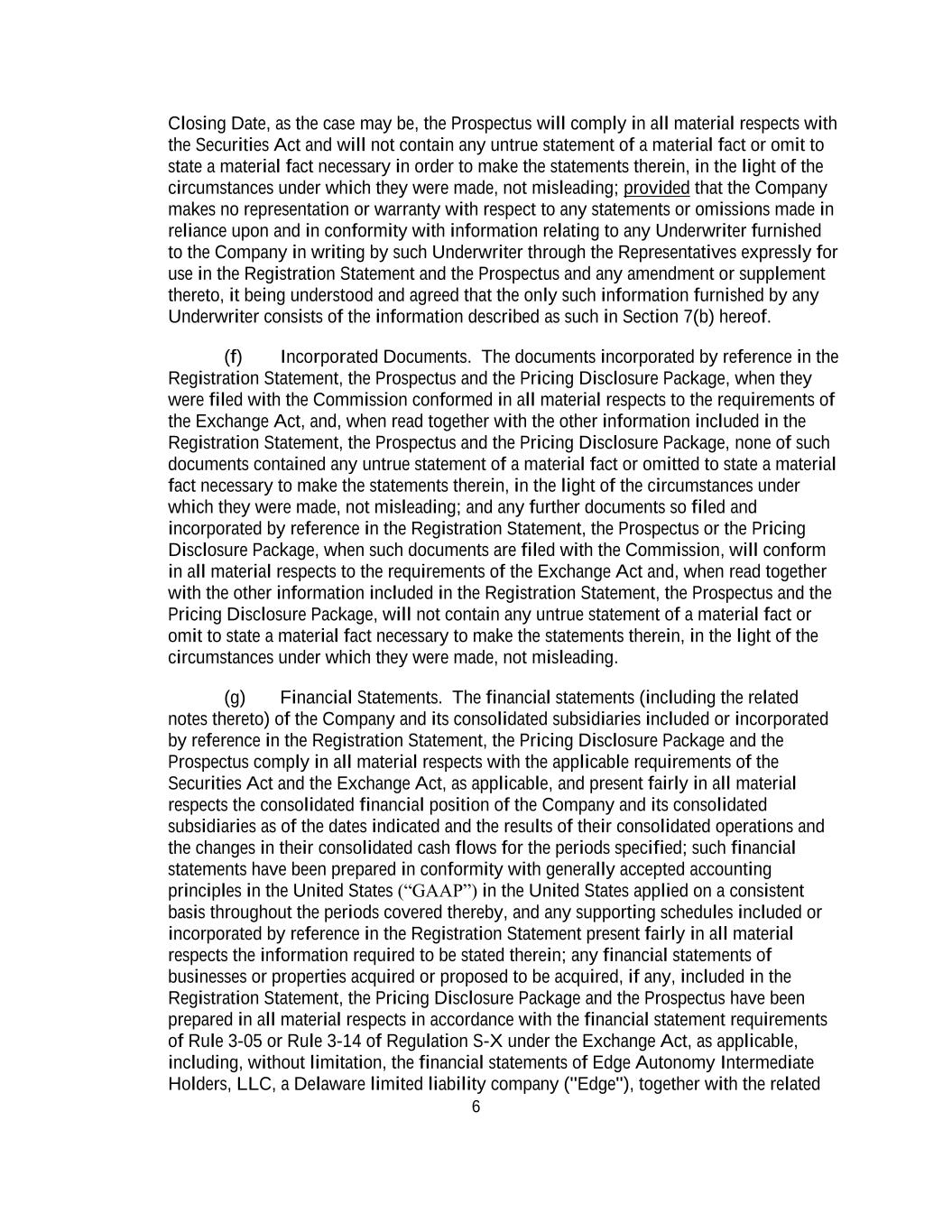 6 Closing Date, as the case may be, the Prospectus will comply in all material respects with the Securities Act and will not contain any untrue statement of a material fact or omit to state a material fact necessary in order to make the statements therein, in the light of the circumstances under which they were made, not misleading; provided that the Company makes no representation or warranty with respect to any statements or omissions made in reliance upon and in conformity with information relating to any Underwriter furnished to the Company in writing by such Underwriter through the Representatives expressly for use in the Registration Statement and the Prospectus and any amendment or supplement thereto, it being understood and agreed that the only such information furnished by any Underwriter consists of the information described as such in Section 7(b) hereof. (f) Incorporated Documents. The documents incorporated by reference in the Registration Statement, the Prospectus and the Pricing Disclosure Package, when they were filed with the Commission conformed in all material respects to the requirements of the Exchange Act, and, when read together with the other information included in the Registration Statement, the Prospectus and the Pricing Disclosure Package, none of such documents contained any untrue statement of a material fact or omitted to state a material fact necessary to make the statements therein, in the light of the circumstances under which they were made, not misleading; and any further documents so filed and incorporated by reference in the Registration Statement, the Prospectus or the Pricing Disclosure Package, when such documents are filed with the Commission, will conform in all material respects to the requirements of the Exchange Act and, when read together with the other information included in the Registration Statement, the Prospectus and the Pricing Disclosure Package, will not contain any untrue statement of a material fact or omit to state a material fact necessary to make the statements therein, in the light of the circumstances under which they were made, not misleading. (g) Financial Statements. The financial statements (including the related notes thereto) of the Company and its consolidated subsidiaries included or incorporated by reference in the Registration Statement, the Pricing Disclosure Package and the Prospectus comply in all material respects with the applicable requirements of the Securities Act and the Exchange Act, as applicable, and present fairly in all material respects the consolidated financial position of the Company and its consolidated subsidiaries as of the dates indicated and the results of their consolidated operations and the changes in their consolidated cash flows for the periods specified; such financial statements have been prepared in conformity with generally accepted accounting principles in the United States (“GAAP”) in the United States applied on a consistent basis throughout the periods covered thereby, and any supporting schedules included or incorporated by reference in the Registration Statement present fairly in all material respects the information required to be stated therein; any financial statements of businesses or properties acquired or proposed to be acquired, if any, included in the Registration Statement, the Pricing Disclosure Package and the Prospectus have been prepared in all material respects in accordance with the financial statement requirements of Rule 3-05 or Rule 3-14 of Regulation S-X under the Exchange Act, as applicable, including, without limitation, the financial statements of Edge Autonomy Intermediate Holders, LLC, a Delaware limited liability company ("Edge"), together with the related