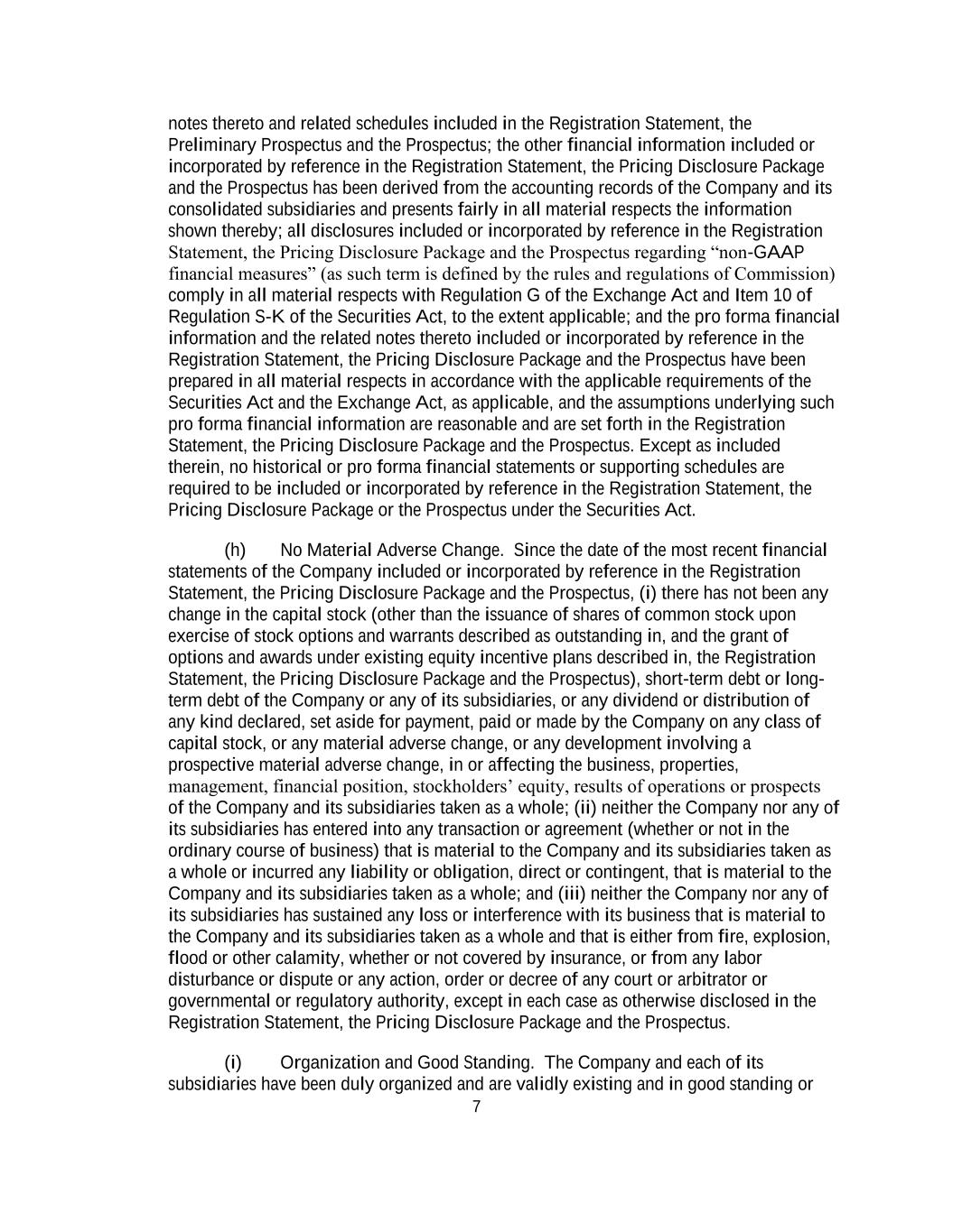 7 notes thereto and related schedules included in the Registration Statement, the Preliminary Prospectus and the Prospectus; the other financial information included or incorporated by reference in the Registration Statement, the Pricing Disclosure Package and the Prospectus has been derived from the accounting records of the Company and its consolidated subsidiaries and presents fairly in all material respects the information shown thereby; all disclosures included or incorporated by reference in the Registration Statement, the Pricing Disclosure Package and the Prospectus regarding “non-GAAP financial measures” (as such term is defined by the rules and regulations of Commission) comply in all material respects with Regulation G of the Exchange Act and Item 10 of Regulation S-K of the Securities Act, to the extent applicable; and the pro forma financial information and the related notes thereto included or incorporated by reference in the Registration Statement, the Pricing Disclosure Package and the Prospectus have been prepared in all material respects in accordance with the applicable requirements of the Securities Act and the Exchange Act, as applicable, and the assumptions underlying such pro forma financial information are reasonable and are set forth in the Registration Statement, the Pricing Disclosure Package and the Prospectus. Except as included therein, no historical or pro forma financial statements or supporting schedules are required to be included or incorporated by reference in the Registration Statement, the Pricing Disclosure Package or the Prospectus under the Securities Act. (h) No Material Adverse Change. Since the date of the most recent financial statements of the Company included or incorporated by reference in the Registration Statement, the Pricing Disclosure Package and the Prospectus, (i) there has not been any change in the capital stock (other than the issuance of shares of common stock upon exercise of stock options and warrants described as outstanding in, and the grant of options and awards under existing equity incentive plans described in, the Registration Statement, the Pricing Disclosure Package and the Prospectus), short-term debt or long- term debt of the Company or any of its subsidiaries, or any dividend or distribution of any kind declared, set aside for payment, paid or made by the Company on any class of capital stock, or any material adverse change, or any development involving a prospective material adverse change, in or affecting the business, properties, management, financial position, stockholders’ equity, results of operations or prospects of the Company and its subsidiaries taken as a whole; (ii) neither the Company nor any of its subsidiaries has entered into any transaction or agreement (whether or not in the ordinary course of business) that is material to the Company and its subsidiaries taken as a whole or incurred any liability or obligation, direct or contingent, that is material to the Company and its subsidiaries taken as a whole; and (iii) neither the Company nor any of its subsidiaries has sustained any loss or interference with its business that is material to the Company and its subsidiaries taken as a whole and that is either from fire, explosion, flood or other calamity, whether or not covered by insurance, or from any labor disturbance or dispute or any action, order or decree of any court or arbitrator or governmental or regulatory authority, except in each case as otherwise disclosed in the Registration Statement, the Pricing Disclosure Package and the Prospectus. (i) Organization and Good Standing. The Company and each of its subsidiaries have been duly organized and are validly existing and in good standing or