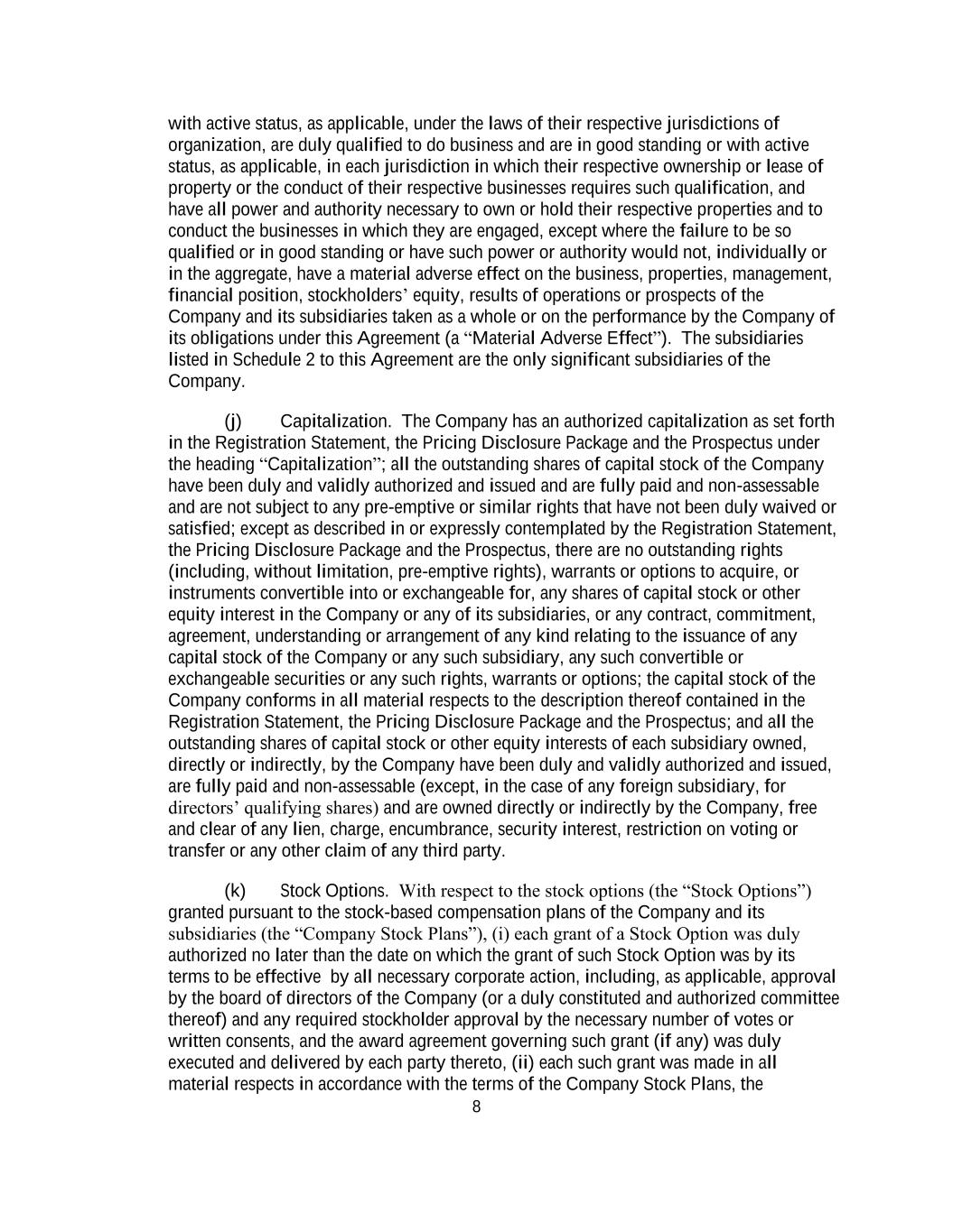 8 with active status, as applicable, under the laws of their respective jurisdictions of organization, are duly qualified to do business and are in good standing or with active status, as applicable, in each jurisdiction in which their respective ownership or lease of property or the conduct of their respective businesses requires such qualification, and have all power and authority necessary to own or hold their respective properties and to conduct the businesses in which they are engaged, except where the failure to be so qualified or in good standing or have such power or authority would not, individually or in the aggregate, have a material adverse effect on the business, properties, management, financial position, stockholders’ equity, results of operations or prospects of the Company and its subsidiaries taken as a whole or on the performance by the Company of its obligations under this Agreement (a “Material Adverse Effect”). The subsidiaries listed in Schedule 2 to this Agreement are the only significant subsidiaries of the Company. (j) Capitalization. The Company has an authorized capitalization as set forth in the Registration Statement, the Pricing Disclosure Package and the Prospectus under the heading “Capitalization”; all the outstanding shares of capital stock of the Company have been duly and validly authorized and issued and are fully paid and non-assessable and are not subject to any pre-emptive or similar rights that have not been duly waived or satisfied; except as described in or expressly contemplated by the Registration Statement, the Pricing Disclosure Package and the Prospectus, there are no outstanding rights (including, without limitation, pre-emptive rights), warrants or options to acquire, or instruments convertible into or exchangeable for, any shares of capital stock or other equity interest in the Company or any of its subsidiaries, or any contract, commitment, agreement, understanding or arrangement of any kind relating to the issuance of any capital stock of the Company or any such subsidiary, any such convertible or exchangeable securities or any such rights, warrants or options; the capital stock of the Company conforms in all material respects to the description thereof contained in the Registration Statement, the Pricing Disclosure Package and the Prospectus; and all the outstanding shares of capital stock or other equity interests of each subsidiary owned, directly or indirectly, by the Company have been duly and validly authorized and issued, are fully paid and non-assessable (except, in the case of any foreign subsidiary, for directors’ qualifying shares) and are owned directly or indirectly by the Company, free and clear of any lien, charge, encumbrance, security interest, restriction on voting or transfer or any other claim of any third party. (k) Stock Options. With respect to the stock options (the “Stock Options”) granted pursuant to the stock-based compensation plans of the Company and its subsidiaries (the “Company Stock Plans”), (i) each grant of a Stock Option was duly authorized no later than the date on which the grant of such Stock Option was by its terms to be effective by all necessary corporate action, including, as applicable, approval by the board of directors of the Company (or a duly constituted and authorized committee thereof) and any required stockholder approval by the necessary number of votes or written consents, and the award agreement governing such grant (if any) was duly executed and delivered by each party thereto, (ii) each such grant was made in all material respects in accordance with the terms of the Company Stock Plans, the