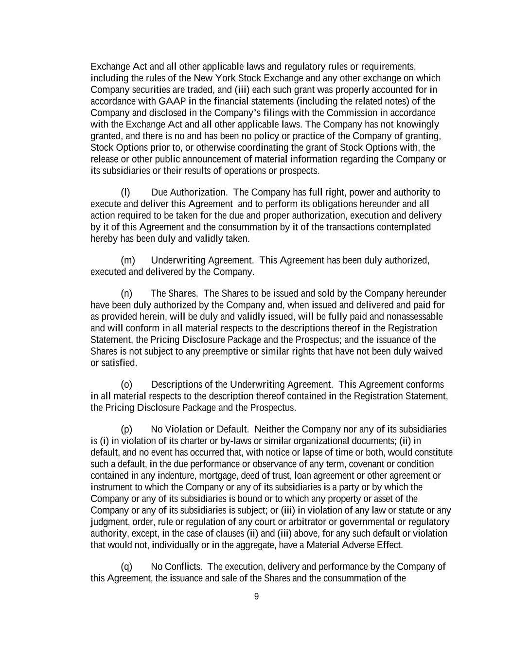 9 Exchange Act and all other applicable laws and regulatory rules or requirements, including the rules of the New York Stock Exchange and any other exchange on which Company securities are traded, and (iii) each such grant was properly accounted for in accordance with GAAP in the financial statements (including the related notes) of the Company and disclosed in the Company’s filings with the Commission in accordance with the Exchange Act and all other applicable laws. The Company has not knowingly granted, and there is no and has been no policy or practice of the Company of granting, Stock Options prior to, or otherwise coordinating the grant of Stock Options with, the release or other public announcement of material information regarding the Company or its subsidiaries or their results of operations or prospects. (l) Due Authorization. The Company has full right, power and authority to execute and deliver this Agreement and to perform its obligations hereunder and all action required to be taken for the due and proper authorization, execution and delivery by it of this Agreement and the consummation by it of the transactions contemplated hereby has been duly and validly taken. (m) Underwriting Agreement. This Agreement has been duly authorized, executed and delivered by the Company. (n) The Shares. The Shares to be issued and sold by the Company hereunder have been duly authorized by the Company and, when issued and delivered and paid for as provided herein, will be duly and validly issued, will be fully paid and nonassessable and will conform in all material respects to the descriptions thereof in the Registration Statement, the Pricing Disclosure Package and the Prospectus; and the issuance of the Shares is not subject to any preemptive or similar rights that have not been duly waived or satisfied. (o) Descriptions of the Underwriting Agreement. This Agreement conforms in all material respects to the description thereof contained in the Registration Statement, the Pricing Disclosure Package and the Prospectus. (p) No Violation or Default. Neither the Company nor any of its subsidiaries is (i) in violation of its charter or by-laws or similar organizational documents; (ii) in default, and no event has occurred that, with notice or lapse of time or both, would constitute such a default, in the due performance or observance of any term, covenant or condition contained in any indenture, mortgage, deed of trust, loan agreement or other agreement or instrument to which the Company or any of its subsidiaries is a party or by which the Company or any of its subsidiaries is bound or to which any property or asset of the Company or any of its subsidiaries is subject; or (iii) in violation of any law or statute or any judgment, order, rule or regulation of any court or arbitrator or governmental or regulatory authority, except, in the case of clauses (ii) and (iii) above, for any such default or violation that would not, individually or in the aggregate, have a Material Adverse Effect. (q) No Conflicts. The execution, delivery and performance by the Company of this Agreement, the issuance and sale of the Shares and the consummation of the