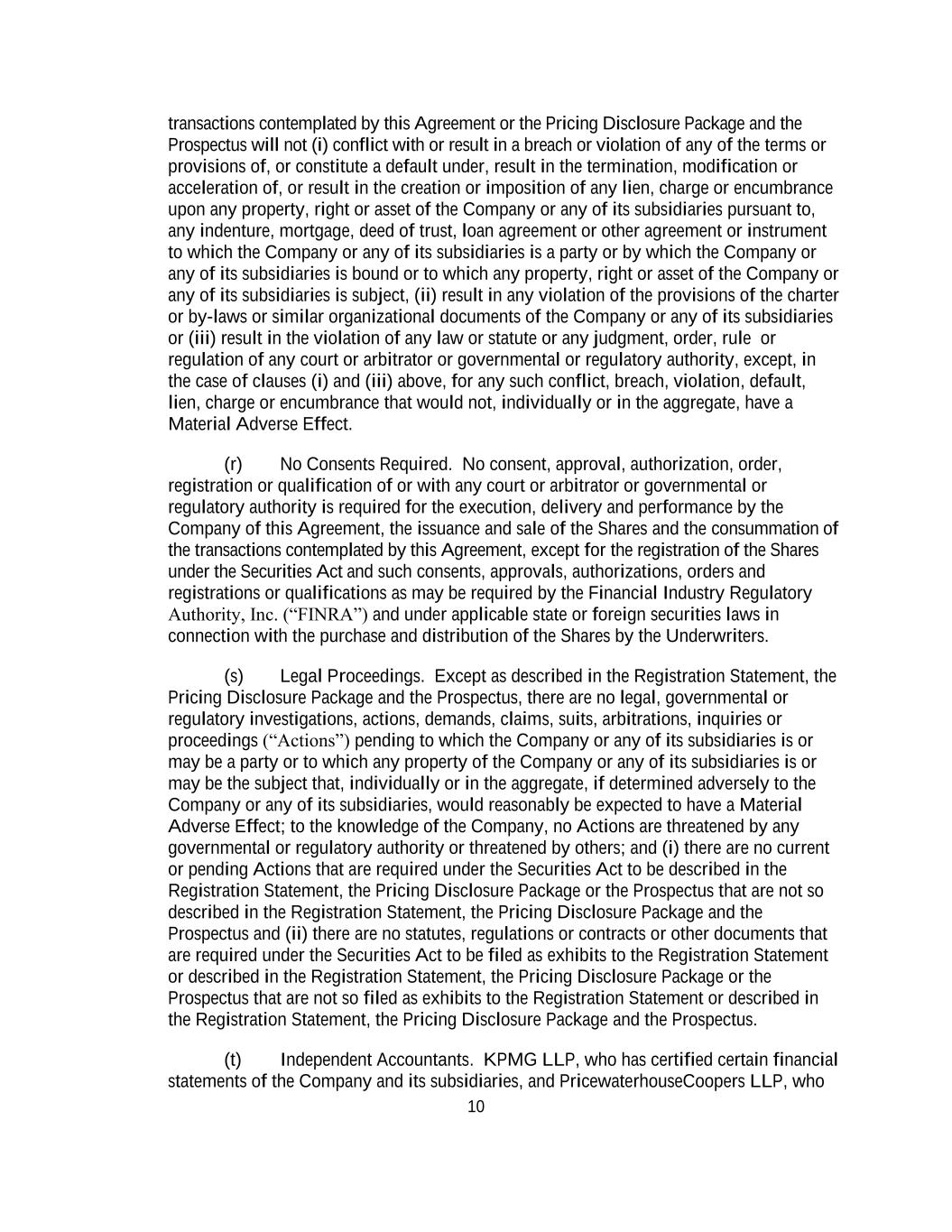 10 transactions contemplated by this Agreement or the Pricing Disclosure Package and the Prospectus will not (i) conflict with or result in a breach or violation of any of the terms or provisions of, or constitute a default under, result in the termination, modification or acceleration of, or result in the creation or imposition of any lien, charge or encumbrance upon any property, right or asset of the Company or any of its subsidiaries pursuant to, any indenture, mortgage, deed of trust, loan agreement or other agreement or instrument to which the Company or any of its subsidiaries is a party or by which the Company or any of its subsidiaries is bound or to which any property, right or asset of the Company or any of its subsidiaries is subject, (ii) result in any violation of the provisions of the charter or by-laws or similar organizational documents of the Company or any of its subsidiaries or (iii) result in the violation of any law or statute or any judgment, order, rule or regulation of any court or arbitrator or governmental or regulatory authority, except, in the case of clauses (i) and (iii) above, for any such conflict, breach, violation, default, lien, charge or encumbrance that would not, individually or in the aggregate, have a Material Adverse Effect. (r) No Consents Required. No consent, approval, authorization, order, registration or qualification of or with any court or arbitrator or governmental or regulatory authority is required for the execution, delivery and performance by the Company of this Agreement, the issuance and sale of the Shares and the consummation of the transactions contemplated by this Agreement, except for the registration of the Shares under the Securities Act and such consents, approvals, authorizations, orders and registrations or qualifications as may be required by the Financial Industry Regulatory Authority, Inc. (“FINRA”) and under applicable state or foreign securities laws in connection with the purchase and distribution of the Shares by the Underwriters. (s) Legal Proceedings. Except as described in the Registration Statement, the Pricing Disclosure Package and the Prospectus, there are no legal, governmental or regulatory investigations, actions, demands, claims, suits, arbitrations, inquiries or proceedings (“Actions”) pending to which the Company or any of its subsidiaries is or may be a party or to which any property of the Company or any of its subsidiaries is or may be the subject that, individually or in the aggregate, if determined adversely to the Company or any of its subsidiaries, would reasonably be expected to have a Material Adverse Effect; to the knowledge of the Company, no Actions are threatened by any governmental or regulatory authority or threatened by others; and (i) there are no current or pending Actions that are required under the Securities Act to be described in the Registration Statement, the Pricing Disclosure Package or the Prospectus that are not so described in the Registration Statement, the Pricing Disclosure Package and the Prospectus and (ii) there are no statutes, regulations or contracts or other documents that are required under the Securities Act to be filed as exhibits to the Registration Statement or described in the Registration Statement, the Pricing Disclosure Package or the Prospectus that are not so filed as exhibits to the Registration Statement or described in the Registration Statement, the Pricing Disclosure Package and the Prospectus. (t) Independent Accountants. KPMG LLP, who has certified certain financial statements of the Company and its subsidiaries, and PricewaterhouseCoopers LLP, who