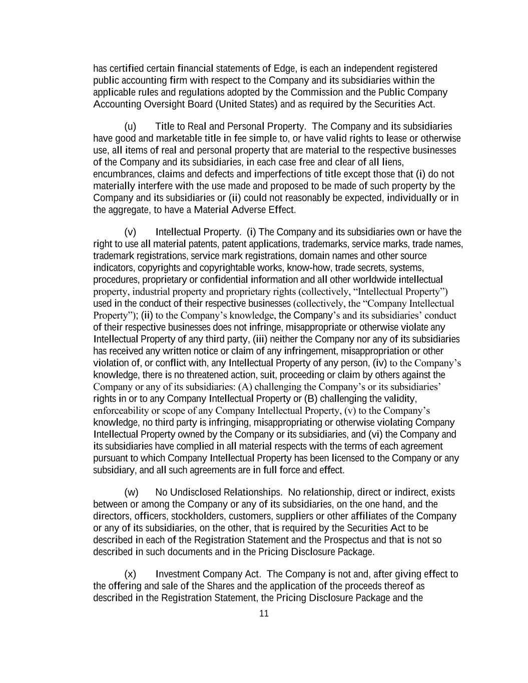 11 has certified certain financial statements of Edge, is each an independent registered public accounting firm with respect to the Company and its subsidiaries within the applicable rules and regulations adopted by the Commission and the Public Company Accounting Oversight Board (United States) and as required by the Securities Act. (u) Title to Real and Personal Property. The Company and its subsidiaries have good and marketable title in fee simple to, or have valid rights to lease or otherwise use, all items of real and personal property that are material to the respective businesses of the Company and its subsidiaries, in each case free and clear of all liens, encumbrances, claims and defects and imperfections of title except those that (i) do not materially interfere with the use made and proposed to be made of such property by the Company and its subsidiaries or (ii) could not reasonably be expected, individually or in the aggregate, to have a Material Adverse Effect. (v) Intellectual Property. (i) The Company and its subsidiaries own or have the right to use all material patents, patent applications, trademarks, service marks, trade names, trademark registrations, service mark registrations, domain names and other source indicators, copyrights and copyrightable works, know-how, trade secrets, systems, procedures, proprietary or confidential information and all other worldwide intellectual property, industrial property and proprietary rights (collectively, “Intellectual Property”) used in the conduct of their respective businesses (collectively, the “Company Intellectual Property”); (ii) to the Company’s knowledge, the Company’s and its subsidiaries’ conduct of their respective businesses does not infringe, misappropriate or otherwise violate any Intellectual Property of any third party, (iii) neither the Company nor any of its subsidiaries has received any written notice or claim of any infringement, misappropriation or other violation of, or conflict with, any Intellectual Property of any person, (iv) to the Company’s knowledge, there is no threatened action, suit, proceeding or claim by others against the Company or any of its subsidiaries: (A) challenging the Company’s or its subsidiaries’ rights in or to any Company Intellectual Property or (B) challenging the validity, enforceability or scope of any Company Intellectual Property, (v) to the Company’s knowledge, no third party is infringing, misappropriating or otherwise violating Company Intellectual Property owned by the Company or its subsidiaries, and (vi) the Company and its subsidiaries have complied in all material respects with the terms of each agreement pursuant to which Company Intellectual Property has been licensed to the Company or any subsidiary, and all such agreements are in full force and effect. (w) No Undisclosed Relationships. No relationship, direct or indirect, exists between or among the Company or any of its subsidiaries, on the one hand, and the directors, officers, stockholders, customers, suppliers or other affiliates of the Company or any of its subsidiaries, on the other, that is required by the Securities Act to be described in each of the Registration Statement and the Prospectus and that is not so described in such documents and in the Pricing Disclosure Package. (x) Investment Company Act. The Company is not and, after giving effect to the offering and sale of the Shares and the application of the proceeds thereof as described in the Registration Statement, the Pricing Disclosure Package and the