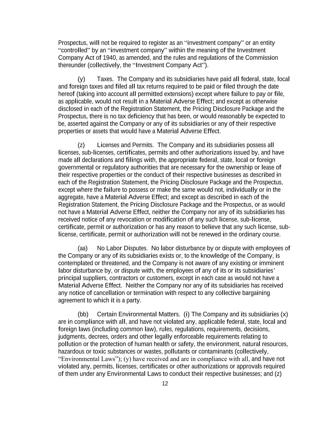 12 Prospectus, will not be required to register as an “investment company” or an entity “controlled” by an “investment company” within the meaning of the Investment Company Act of 1940, as amended, and the rules and regulations of the Commission thereunder (collectively, the “Investment Company Act”). (y) Taxes. The Company and its subsidiaries have paid all federal, state, local and foreign taxes and filed all tax returns required to be paid or filed through the date hereof (taking into account all permitted extensions) except where failure to pay or file, as applicable, would not result in a Material Adverse Effect; and except as otherwise disclosed in each of the Registration Statement, the Pricing Disclosure Package and the Prospectus, there is no tax deficiency that has been, or would reasonably be expected to be, asserted against the Company or any of its subsidiaries or any of their respective properties or assets that would have a Material Adverse Effect. (z) Licenses and Permits. The Company and its subsidiaries possess all licenses, sub-licenses, certificates, permits and other authorizations issued by, and have made all declarations and filings with, the appropriate federal, state, local or foreign governmental or regulatory authorities that are necessary for the ownership or lease of their respective properties or the conduct of their respective businesses as described in each of the Registration Statement, the Pricing Disclosure Package and the Prospectus, except where the failure to possess or make the same would not, individually or in the aggregate, have a Material Adverse Effect; and except as described in each of the Registration Statement, the Pricing Disclosure Package and the Prospectus, or as would not have a Material Adverse Effect, neither the Company nor any of its subsidiaries has received notice of any revocation or modification of any such license, sub-license, certificate, permit or authorization or has any reason to believe that any such license, sub- license, certificate, permit or authorization will not be renewed in the ordinary course. (aa) No Labor Disputes. No labor disturbance by or dispute with employees of the Company or any of its subsidiaries exists or, to the knowledge of the Company, is contemplated or threatened, and the Company is not aware of any existing or imminent labor disturbance by, or dispute with, the employees of any of its or its subsidiaries’ principal suppliers, contractors or customers, except in each case as would not have a Material Adverse Effect. Neither the Company nor any of its subsidiaries has received any notice of cancellation or termination with respect to any collective bargaining agreement to which it is a party. (bb) Certain Environmental Matters. (i) The Company and its subsidiaries (x) are in compliance with all, and have not violated any, applicable federal, state, local and foreign laws (including common law), rules, regulations, requirements, decisions, judgments, decrees, orders and other legally enforceable requirements relating to pollution or the protection of human health or safety, the environment, natural resources, hazardous or toxic substances or wastes, pollutants or contaminants (collectively, “Environmental Laws”); (y) have received and are in compliance with all, and have not violated any, permits, licenses, certificates or other authorizations or approvals required of them under any Environmental Laws to conduct their respective businesses; and (z)