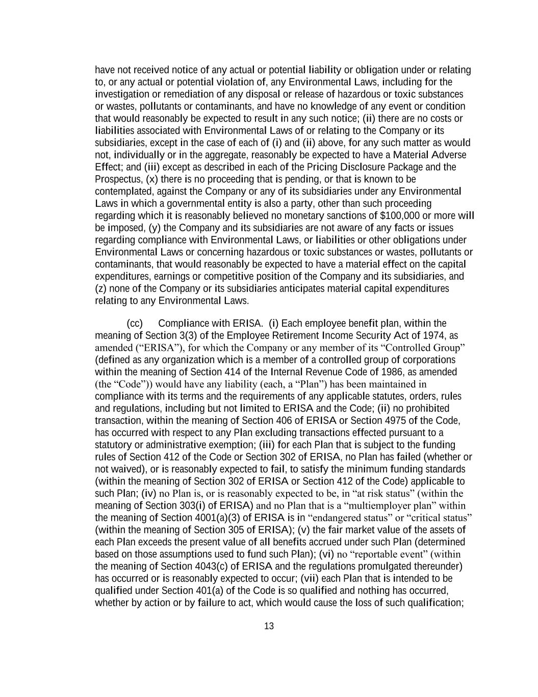 13 have not received notice of any actual or potential liability or obligation under or relating to, or any actual or potential violation of, any Environmental Laws, including for the investigation or remediation of any disposal or release of hazardous or toxic substances or wastes, pollutants or contaminants, and have no knowledge of any event or condition that would reasonably be expected to result in any such notice; (ii) there are no costs or liabilities associated with Environmental Laws of or relating to the Company or its subsidiaries, except in the case of each of (i) and (ii) above, for any such matter as would not, individually or in the aggregate, reasonably be expected to have a Material Adverse Effect; and (iii) except as described in each of the Pricing Disclosure Package and the Prospectus, (x) there is no proceeding that is pending, or that is known to be contemplated, against the Company or any of its subsidiaries under any Environmental Laws in which a governmental entity is also a party, other than such proceeding regarding which it is reasonably believed no monetary sanctions of $100,000 or more will be imposed, (y) the Company and its subsidiaries are not aware of any facts or issues regarding compliance with Environmental Laws, or liabilities or other obligations under Environmental Laws or concerning hazardous or toxic substances or wastes, pollutants or contaminants, that would reasonably be expected to have a material effect on the capital expenditures, earnings or competitive position of the Company and its subsidiaries, and (z) none of the Company or its subsidiaries anticipates material capital expenditures relating to any Environmental Laws. (cc) Compliance with ERISA. (i) Each employee benefit plan, within the meaning of Section 3(3) of the Employee Retirement Income Security Act of 1974, as amended (“ERISA”), for which the Company or any member of its “Controlled Group” (defined as any organization which is a member of a controlled group of corporations within the meaning of Section 414 of the Internal Revenue Code of 1986, as amended (the “Code”)) would have any liability (each, a “Plan”) has been maintained in compliance with its terms and the requirements of any applicable statutes, orders, rules and regulations, including but not limited to ERISA and the Code; (ii) no prohibited transaction, within the meaning of Section 406 of ERISA or Section 4975 of the Code, has occurred with respect to any Plan excluding transactions effected pursuant to a statutory or administrative exemption; (iii) for each Plan that is subject to the funding rules of Section 412 of the Code or Section 302 of ERISA, no Plan has failed (whether or not waived), or is reasonably expected to fail, to satisfy the minimum funding standards (within the meaning of Section 302 of ERISA or Section 412 of the Code) applicable to such Plan; (iv) no Plan is, or is reasonably expected to be, in “at risk status” (within the meaning of Section 303(i) of ERISA) and no Plan that is a “multiemployer plan” within the meaning of Section 4001(a)(3) of ERISA is in “endangered status” or “critical status” (within the meaning of Section 305 of ERISA); (v) the fair market value of the assets of each Plan exceeds the present value of all benefits accrued under such Plan (determined based on those assumptions used to fund such Plan); (vi) no “reportable event” (within the meaning of Section 4043(c) of ERISA and the regulations promulgated thereunder) has occurred or is reasonably expected to occur; (vii) each Plan that is intended to be qualified under Section 401(a) of the Code is so qualified and nothing has occurred, whether by action or by failure to act, which would cause the loss of such qualification;