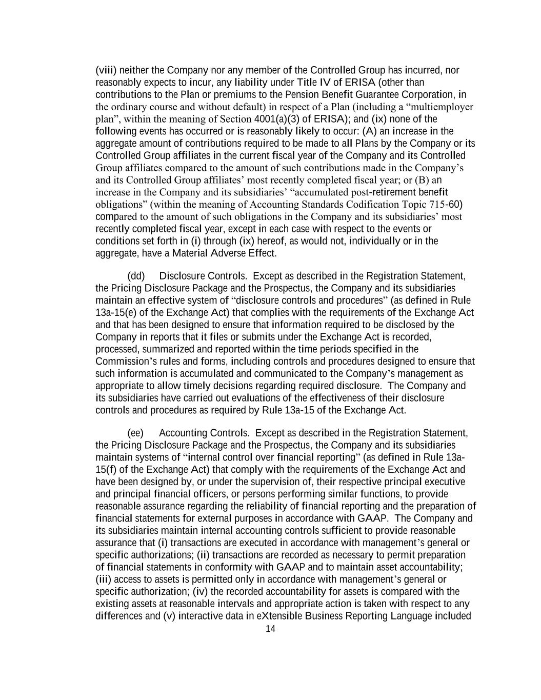 14 (viii) neither the Company nor any member of the Controlled Group has incurred, nor reasonably expects to incur, any liability under Title IV of ERISA (other than contributions to the Plan or premiums to the Pension Benefit Guarantee Corporation, in the ordinary course and without default) in respect of a Plan (including a “multiemployer plan”, within the meaning of Section 4001(a)(3) of ERISA); and (ix) none of the following events has occurred or is reasonably likely to occur: (A) an increase in the aggregate amount of contributions required to be made to all Plans by the Company or its Controlled Group affiliates in the current fiscal year of the Company and its Controlled Group affiliates compared to the amount of such contributions made in the Company’s and its Controlled Group affiliates’ most recently completed fiscal year; or (B) an increase in the Company and its subsidiaries’ “accumulated post-retirement benefit obligations” (within the meaning of Accounting Standards Codification Topic 715-60) compared to the amount of such obligations in the Company and its subsidiaries’ most recently completed fiscal year, except in each case with respect to the events or conditions set forth in (i) through (ix) hereof, as would not, individually or in the aggregate, have a Material Adverse Effect. (dd) Disclosure Controls. Except as described in the Registration Statement, the Pricing Disclosure Package and the Prospectus, the Company and its subsidiaries maintain an effective system of “disclosure controls and procedures” (as defined in Rule 13a-15(e) of the Exchange Act) that complies with the requirements of the Exchange Act and that has been designed to ensure that information required to be disclosed by the Company in reports that it files or submits under the Exchange Act is recorded, processed, summarized and reported within the time periods specified in the Commission’s rules and forms, including controls and procedures designed to ensure that such information is accumulated and communicated to the Company’s management as appropriate to allow timely decisions regarding required disclosure. The Company and its subsidiaries have carried out evaluations of the effectiveness of their disclosure controls and procedures as required by Rule 13a-15 of the Exchange Act. (ee) Accounting Controls. Except as described in the Registration Statement, the Pricing Disclosure Package and the Prospectus, the Company and its subsidiaries maintain systems of “internal control over financial reporting” (as defined in Rule 13a- 15(f) of the Exchange Act) that comply with the requirements of the Exchange Act and have been designed by, or under the supervision of, their respective principal executive and principal financial officers, or persons performing similar functions, to provide reasonable assurance regarding the reliability of financial reporting and the preparation of financial statements for external purposes in accordance with GAAP. The Company and its subsidiaries maintain internal accounting controls sufficient to provide reasonable assurance that (i) transactions are executed in accordance with management’s general or specific authorizations; (ii) transactions are recorded as necessary to permit preparation of financial statements in conformity with GAAP and to maintain asset accountability; (iii) access to assets is permitted only in accordance with management’s general or specific authorization; (iv) the recorded accountability for assets is compared with the existing assets at reasonable intervals and appropriate action is taken with respect to any differences and (v) interactive data in eXtensible Business Reporting Language included