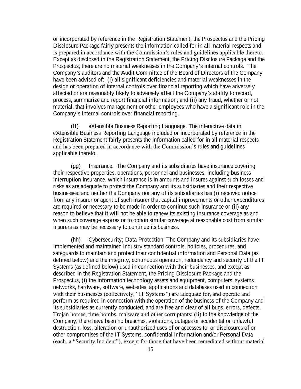 15 or incorporated by reference in the Registration Statement, the Prospectus and the Pricing Disclosure Package fairly presents the information called for in all material respects and is prepared in accordance with the Commission’s rules and guidelines applicable thereto. Except as disclosed in the Registration Statement, the Pricing Disclosure Package and the Prospectus, there are no material weaknesses in the Company’s internal controls. The Company’s auditors and the Audit Committee of the Board of Directors of the Company have been advised of: (i) all significant deficiencies and material weaknesses in the design or operation of internal controls over financial reporting which have adversely affected or are reasonably likely to adversely affect the Company’s ability to record, process, summarize and report financial information; and (ii) any fraud, whether or not material, that involves management or other employees who have a significant role in the Company’s internal controls over financial reporting. (ff) eXtensible Business Reporting Language. The interactive data in eXtensible Business Reporting Language included or incorporated by reference in the Registration Statement fairly presents the information called for in all material respects and has been prepared in accordance with the Commission’s rules and guidelines applicable thereto. (gg) Insurance. The Company and its subsidiaries have insurance covering their respective properties, operations, personnel and businesses, including business interruption insurance, which insurance is in amounts and insures against such losses and risks as are adequate to protect the Company and its subsidiaries and their respective businesses; and neither the Company nor any of its subsidiaries has (i) received notice from any insurer or agent of such insurer that capital improvements or other expenditures are required or necessary to be made in order to continue such insurance or (ii) any reason to believe that it will not be able to renew its existing insurance coverage as and when such coverage expires or to obtain similar coverage at reasonable cost from similar insurers as may be necessary to continue its business. (hh) Cybersecurity; Data Protection. The Company and its subsidiaries have implemented and maintained industry standard controls, policies, procedures, and safeguards to maintain and protect their confidential information and Personal Data (as defined below) and the integrity, continuous operation, redundancy and security of the IT Systems (as defined below) used in connection with their businesses, and except as described in the Registration Statement, the Pricing Disclosure Package and the Prospectus, (i) the information technology assets and equipment, computers, systems networks, hardware, software, websites, applications and databases used in connection with their businesses (collectively, “IT Systems”) are adequate for, and operate and perform as required in connection with the operation of the business of the Company and its subsidiaries as currently conducted, and are free and clear of all bugs, errors, defects, Trojan horses, time bombs, malware and other corruptants; (ii) to the knowledge of the Company, there have been no breaches, violations, outages or accidental or unlawful destruction, loss, alteration or unauthorized uses of or accesses to, or disclosures of or other compromises of the IT Systems, confidential information and/or Personal Data (each, a “Security Incident”), except for those that have been remediated without material