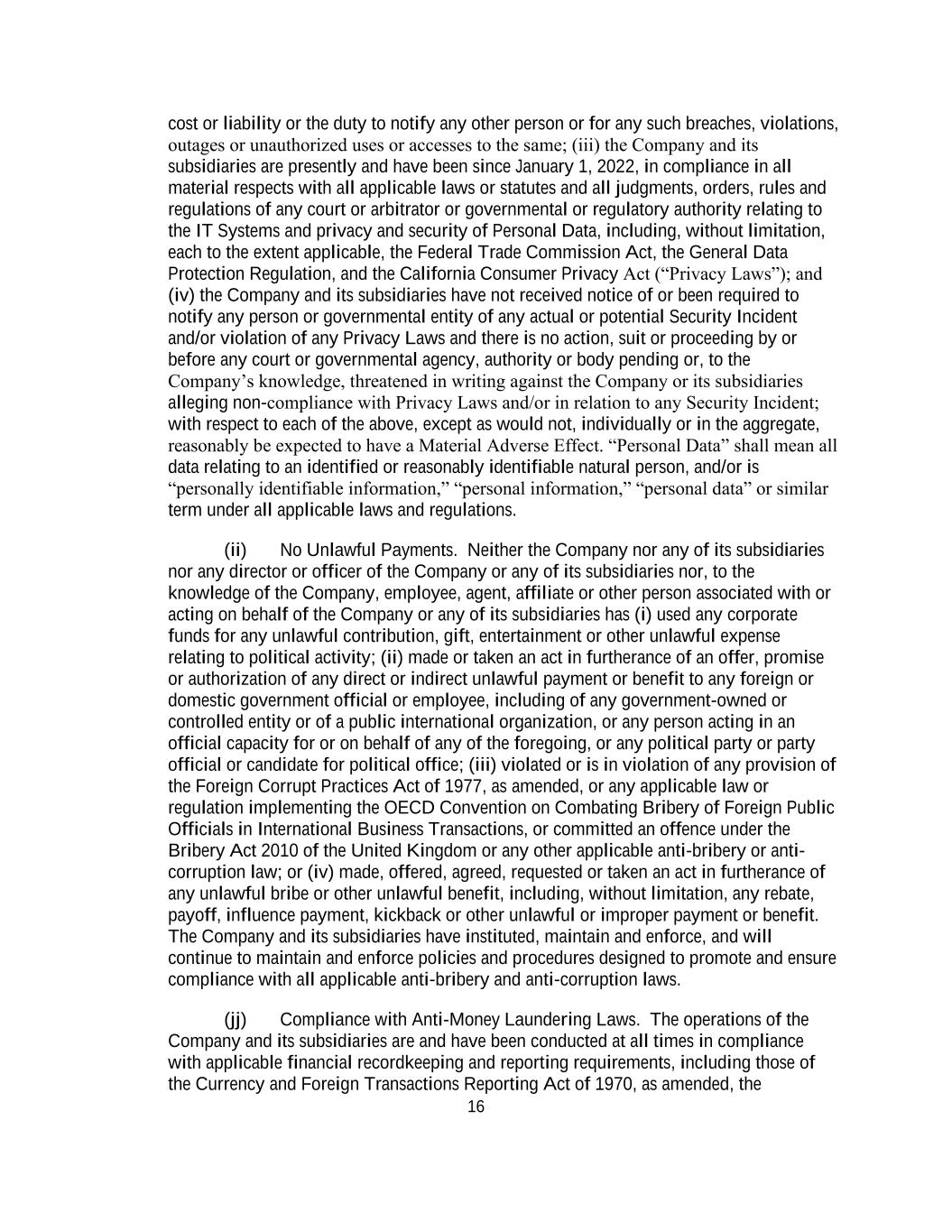 16 cost or liability or the duty to notify any other person or for any such breaches, violations, outages or unauthorized uses or accesses to the same; (iii) the Company and its subsidiaries are presently and have been since January 1, 2022, in compliance in all material respects with all applicable laws or statutes and all judgments, orders, rules and regulations of any court or arbitrator or governmental or regulatory authority relating to the IT Systems and privacy and security of Personal Data, including, without limitation, each to the extent applicable, the Federal Trade Commission Act, the General Data Protection Regulation, and the California Consumer Privacy Act (“Privacy Laws”); and (iv) the Company and its subsidiaries have not received notice of or been required to notify any person or governmental entity of any actual or potential Security Incident and/or violation of any Privacy Laws and there is no action, suit or proceeding by or before any court or governmental agency, authority or body pending or, to the Company’s knowledge, threatened in writing against the Company or its subsidiaries alleging non-compliance with Privacy Laws and/or in relation to any Security Incident; with respect to each of the above, except as would not, individually or in the aggregate, reasonably be expected to have a Material Adverse Effect. “Personal Data” shall mean all data relating to an identified or reasonably identifiable natural person, and/or is “personally identifiable information,” “personal information,” “personal data” or similar term under all applicable laws and regulations. (ii) No Unlawful Payments. Neither the Company nor any of its subsidiaries nor any director or officer of the Company or any of its subsidiaries nor, to the knowledge of the Company, employee, agent, affiliate or other person associated with or acting on behalf of the Company or any of its subsidiaries has (i) used any corporate funds for any unlawful contribution, gift, entertainment or other unlawful expense relating to political activity; (ii) made or taken an act in furtherance of an offer, promise or authorization of any direct or indirect unlawful payment or benefit to any foreign or domestic government official or employee, including of any government-owned or controlled entity or of a public international organization, or any person acting in an official capacity for or on behalf of any of the foregoing, or any political party or party official or candidate for political office; (iii) violated or is in violation of any provision of the Foreign Corrupt Practices Act of 1977, as amended, or any applicable law or regulation implementing the OECD Convention on Combating Bribery of Foreign Public Officials in International Business Transactions, or committed an offence under the Bribery Act 2010 of the United Kingdom or any other applicable anti-bribery or anti- corruption law; or (iv) made, offered, agreed, requested or taken an act in furtherance of any unlawful bribe or other unlawful benefit, including, without limitation, any rebate, payoff, influence payment, kickback or other unlawful or improper payment or benefit. The Company and its subsidiaries have instituted, maintain and enforce, and will continue to maintain and enforce policies and procedures designed to promote and ensure compliance with all applicable anti-bribery and anti-corruption laws. (jj) Compliance with Anti-Money Laundering Laws. The operations of the Company and its subsidiaries are and have been conducted at all times in compliance with applicable financial recordkeeping and reporting requirements, including those of the Currency and Foreign Transactions Reporting Act of 1970, as amended, the