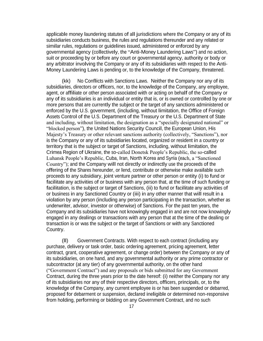 17 applicable money laundering statutes of all jurisdictions where the Company or any of its subsidiaries conducts business, the rules and regulations thereunder and any related or similar rules, regulations or guidelines issued, administered or enforced by any governmental agency (collectively, the “Anti-Money Laundering Laws”) and no action, suit or proceeding by or before any court or governmental agency, authority or body or any arbitrator involving the Company or any of its subsidiaries with respect to the Anti- Money Laundering Laws is pending or, to the knowledge of the Company, threatened. (kk) No Conflicts with Sanctions Laws. Neither the Company nor any of its subsidiaries, directors or officers, nor, to the knowledge of the Company, any employee, agent, or affiliate or other person associated with or acting on behalf of the Company or any of its subsidiaries is an individual or entity that is, or is owned or controlled by one or more persons that are currently the subject or the target of any sanctions administered or enforced by the U.S. government, (including, without limitation, the Office of Foreign Assets Control of the U.S. Department of the Treasury or the U.S. Department of State and including, without limitation, the designation as a “specially designated national” or “blocked person”), the United Nations Security Council, the European Union, His Majesty’s Treasury or other relevant sanctions authority (collectively, “Sanctions”), nor is the Company or any of its subsidiaries located, organized or resident in a country or territory that is the subject or target of Sanctions, including, without limitation, the Crimea Region of Ukraine, the so-called Donetsk People’s Republic, the so-called Luhansk People’s Republic, Cuba, Iran, North Korea and Syria (each, a “Sanctioned Country”); and the Company will not directly or indirectly use the proceeds of the offering of the Shares hereunder, or lend, contribute or otherwise make available such proceeds to any subsidiary, joint venture partner or other person or entity (i) to fund or facilitate any activities of or business with any person that, at the time of such funding or facilitation, is the subject or target of Sanctions, (ii) to fund or facilitate any activities of or business in any Sanctioned Country or (iii) in any other manner that will result in a violation by any person (including any person participating in the transaction, whether as underwriter, advisor, investor or otherwise) of Sanctions. For the past ten years, the Company and its subsidiaries have not knowingly engaged in and are not now knowingly engaged in any dealings or transactions with any person that at the time of the dealing or transaction is or was the subject or the target of Sanctions or with any Sanctioned Country. (ll) Government Contracts. With respect to each contract (including any purchase, delivery or task order, basic ordering agreement, pricing agreement, letter contract, grant, cooperative agreement, or change order) between the Company or any of its subsidiaries, on one hand, and any governmental authority or any prime contractor or subcontractor (at any tier) of any governmental authority, on the other hand (“Government Contract”) and any proposals or bids submitted for any Government Contract, during the three years prior to the date hereof: (i) neither the Company nor any of its subsidiaries nor any of their respective directors, officers, principals, or, to the knowledge of the Company, any current employee is or has been suspended or debarred, proposed for debarment or suspension, declared ineligible or determined non-responsive from holding, performing or bidding on any Government Contract, and no such