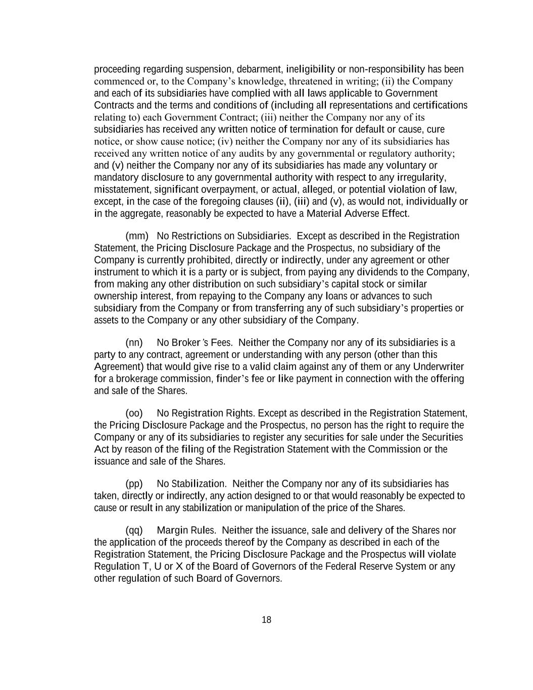 18 proceeding regarding suspension, debarment, ineligibility or non-responsibility has been commenced or, to the Company’s knowledge, threatened in writing; (ii) the Company and each of its subsidiaries have complied with all laws applicable to Government Contracts and the terms and conditions of (including all representations and certifications relating to) each Government Contract; (iii) neither the Company nor any of its subsidiaries has received any written notice of termination for default or cause, cure notice, or show cause notice; (iv) neither the Company nor any of its subsidiaries has received any written notice of any audits by any governmental or regulatory authority; and (v) neither the Company nor any of its subsidiaries has made any voluntary or mandatory disclosure to any governmental authority with respect to any irregularity, misstatement, significant overpayment, or actual, alleged, or potential violation of law, except, in the case of the foregoing clauses (ii), (iii) and (v), as would not, individually or in the aggregate, reasonably be expected to have a Material Adverse Effect. (mm) No Restrictions on Subsidiaries. Except as described in the Registration Statement, the Pricing Disclosure Package and the Prospectus, no subsidiary of the Company is currently prohibited, directly or indirectly, under any agreement or other instrument to which it is a party or is subject, from paying any dividends to the Company, from making any other distribution on such subsidiary’s capital stock or similar ownership interest, from repaying to the Company any loans or advances to such subsidiary from the Company or from transferring any of such subsidiary’s properties or assets to the Company or any other subsidiary of the Company. (nn) No Broker’s Fees. Neither the Company nor any of its subsidiaries is a party to any contract, agreement or understanding with any person (other than this Agreement) that would give rise to a valid claim against any of them or any Underwriter for a brokerage commission, finder’s fee or like payment in connection with the offering and sale of the Shares. (oo) No Registration Rights. Except as described in the Registration Statement, the Pricing Disclosure Package and the Prospectus, no person has the right to require the Company or any of its subsidiaries to register any securities for sale under the Securities Act by reason of the filing of the Registration Statement with the Commission or the issuance and sale of the Shares. (pp) No Stabilization. Neither the Company nor any of its subsidiaries has taken, directly or indirectly, any action designed to or that would reasonably be expected to cause or result in any stabilization or manipulation of the price of the Shares. (qq) Margin Rules. Neither the issuance, sale and delivery of the Shares nor the application of the proceeds thereof by the Company as described in each of the Registration Statement, the Pricing Disclosure Package and the Prospectus will violate Regulation T, U or X of the Board of Governors of the Federal Reserve System or any other regulation of such Board of Governors.
