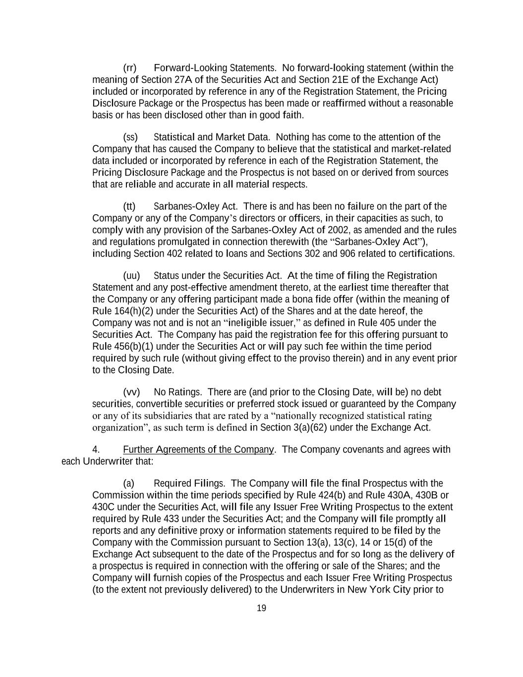 19 (rr) Forward-Looking Statements. No forward-looking statement (within the meaning of Section 27A of the Securities Act and Section 21E of the Exchange Act) included or incorporated by reference in any of the Registration Statement, the Pricing Disclosure Package or the Prospectus has been made or reaffirmed without a reasonable basis or has been disclosed other than in good faith. (ss) Statistical and Market Data. Nothing has come to the attention of the Company that has caused the Company to believe that the statistical and market-related data included or incorporated by reference in each of the Registration Statement, the Pricing Disclosure Package and the Prospectus is not based on or derived from sources that are reliable and accurate in all material respects. (tt) Sarbanes-Oxley Act. There is and has been no failure on the part of the Company or any of the Company’s directors or officers, in their capacities as such, to comply with any provision of the Sarbanes-Oxley Act of 2002, as amended and the rules and regulations promulgated in connection therewith (the “Sarbanes-Oxley Act”), including Section 402 related to loans and Sections 302 and 906 related to certifications. (uu) Status under the Securities Act. At the time of filing the Registration Statement and any post-effective amendment thereto, at the earliest time thereafter that the Company or any offering participant made a bona fide offer (within the meaning of Rule 164(h)(2) under the Securities Act) of the Shares and at the date hereof, the Company was not and is not an “ineligible issuer,” as defined in Rule 405 under the Securities Act. The Company has paid the registration fee for this offering pursuant to Rule 456(b)(1) under the Securities Act or will pay such fee within the time period required by such rule (without giving effect to the proviso therein) and in any event prior to the Closing Date. (vv) No Ratings. There are (and prior to the Closing Date, will be) no debt securities, convertible securities or preferred stock issued or guaranteed by the Company or any of its subsidiaries that are rated by a “nationally recognized statistical rating organization”, as such term is defined in Section 3(a)(62) under the Exchange Act. 4. Further Agreements of the Company. The Company covenants and agrees with each Underwriter that: (a) Required Filings. The Company will file the final Prospectus with the Commission within the time periods specified by Rule 424(b) and Rule 430A, 430B or 430C under the Securities Act, will file any Issuer Free Writing Prospectus to the extent required by Rule 433 under the Securities Act; and the Company will file promptly all reports and any definitive proxy or information statements required to be filed by the Company with the Commission pursuant to Section 13(a), 13(c), 14 or 15(d) of the Exchange Act subsequent to the date of the Prospectus and for so long as the delivery of a prospectus is required in connection with the offering or sale of the Shares; and the Company will furnish copies of the Prospectus and each Issuer Free Writing Prospectus (to the extent not previously delivered) to the Underwriters in New York City prior to