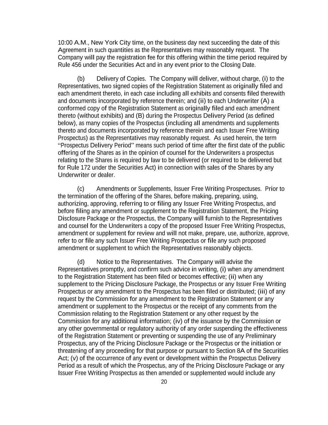 20 10:00 A.M., New York City time, on the business day next succeeding the date of this Agreement in such quantities as the Representatives may reasonably request. The Company will pay the registration fee for this offering within the time period required by Rule 456 under the Securities Act and in any event prior to the Closing Date. (b) Delivery of Copies. The Company will deliver, without charge, (i) to the Representatives, two signed copies of the Registration Statement as originally filed and each amendment thereto, in each case including all exhibits and consents filed therewith and documents incorporated by reference therein; and (ii) to each Underwriter (A) a conformed copy of the Registration Statement as originally filed and each amendment thereto (without exhibits) and (B) during the Prospectus Delivery Period (as defined below), as many copies of the Prospectus (including all amendments and supplements thereto and documents incorporated by reference therein and each Issuer Free Writing Prospectus) as the Representatives may reasonably request. As used herein, the term “Prospectus Delivery Period” means such period of time after the first date of the public offering of the Shares as in the opinion of counsel for the Underwriters a prospectus relating to the Shares is required by law to be delivered (or required to be delivered but for Rule 172 under the Securities Act) in connection with sales of the Shares by any Underwriter or dealer. (c) Amendments or Supplements, Issuer Free Writing Prospectuses. Prior to the termination of the offering of the Shares, before making, preparing, using, authorizing, approving, referring to or filing any Issuer Free Writing Prospectus, and before filing any amendment or supplement to the Registration Statement, the Pricing Disclosure Package or the Prospectus, the Company will furnish to the Representatives and counsel for the Underwriters a copy of the proposed Issuer Free Writing Prospectus, amendment or supplement for review and will not make, prepare, use, authorize, approve, refer to or file any such Issuer Free Writing Prospectus or file any such proposed amendment or supplement to which the Representatives reasonably objects. (d) Notice to the Representatives. The Company will advise the Representatives promptly, and confirm such advice in writing, (i) when any amendment to the Registration Statement has been filed or becomes effective; (ii) when any supplement to the Pricing Disclosure Package, the Prospectus or any Issuer Free Writing Prospectus or any amendment to the Prospectus has been filed or distributed; (iii) of any request by the Commission for any amendment to the Registration Statement or any amendment or supplement to the Prospectus or the receipt of any comments from the Commission relating to the Registration Statement or any other request by the Commission for any additional information; (iv) of the issuance by the Commission or any other governmental or regulatory authority of any order suspending the effectiveness of the Registration Statement or preventing or suspending the use of any Preliminary Prospectus, any of the Pricing Disclosure Package or the Prospectus or the initiation or threatening of any proceeding for that purpose or pursuant to Section 8A of the Securities Act; (v) of the occurrence of any event or development within the Prospectus Delivery Period as a result of which the Prospectus, any of the Pricing Disclosure Package or any Issuer Free Writing Prospectus as then amended or supplemented would include any