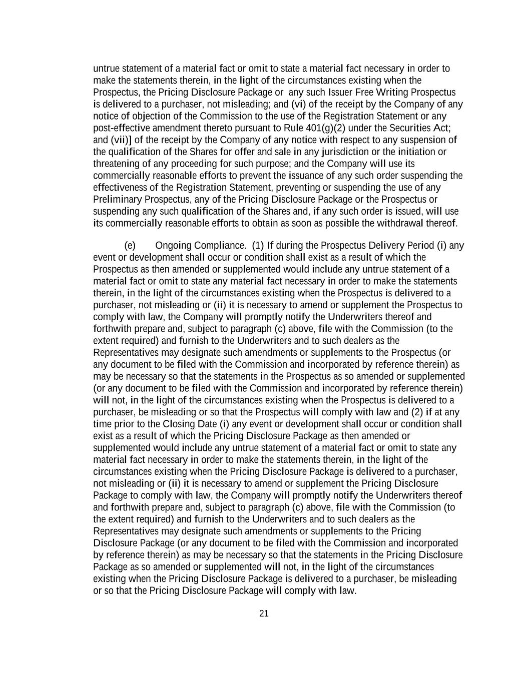21 untrue statement of a material fact or omit to state a material fact necessary in order to make the statements therein, in the light of the circumstances existing when the Prospectus, the Pricing Disclosure Package or any such Issuer Free Writing Prospectus is delivered to a purchaser, not misleading; and (vi) of the receipt by the Company of any notice of objection of the Commission to the use of the Registration Statement or any post-effective amendment thereto pursuant to Rule 401(g)(2) under the Securities Act; and (vii)] of the receipt by the Company of any notice with respect to any suspension of the qualification of the Shares for offer and sale in any jurisdiction or the initiation or threatening of any proceeding for such purpose; and the Company will use its commercially reasonable efforts to prevent the issuance of any such order suspending the effectiveness of the Registration Statement, preventing or suspending the use of any Preliminary Prospectus, any of the Pricing Disclosure Package or the Prospectus or suspending any such qualification of the Shares and, if any such order is issued, will use its commercially reasonable efforts to obtain as soon as possible the withdrawal thereof. (e) Ongoing Compliance. (1) If during the Prospectus Delivery Period (i) any event or development shall occur or condition shall exist as a result of which the Prospectus as then amended or supplemented would include any untrue statement of a material fact or omit to state any material fact necessary in order to make the statements therein, in the light of the circumstances existing when the Prospectus is delivered to a purchaser, not misleading or (ii) it is necessary to amend or supplement the Prospectus to comply with law, the Company will promptly notify the Underwriters thereof and forthwith prepare and, subject to paragraph (c) above, file with the Commission (to the extent required) and furnish to the Underwriters and to such dealers as the Representatives may designate such amendments or supplements to the Prospectus (or any document to be filed with the Commission and incorporated by reference therein) as may be necessary so that the statements in the Prospectus as so amended or supplemented (or any document to be filed with the Commission and incorporated by reference therein) will not, in the light of the circumstances existing when the Prospectus is delivered to a purchaser, be misleading or so that the Prospectus will comply with law and (2) if at any time prior to the Closing Date (i) any event or development shall occur or condition shall exist as a result of which the Pricing Disclosure Package as then amended or supplemented would include any untrue statement of a material fact or omit to state any material fact necessary in order to make the statements therein, in the light of the circumstances existing when the Pricing Disclosure Package is delivered to a purchaser, not misleading or (ii) it is necessary to amend or supplement the Pricing Disclosure Package to comply with law, the Company will promptly notify the Underwriters thereof and forthwith prepare and, subject to paragraph (c) above, file with the Commission (to the extent required) and furnish to the Underwriters and to such dealers as the Representatives may designate such amendments or supplements to the Pricing Disclosure Package (or any document to be filed with the Commission and incorporated by reference therein) as may be necessary so that the statements in the Pricing Disclosure Package as so amended or supplemented will not, in the light of the circumstances existing when the Pricing Disclosure Package is delivered to a purchaser, be misleading or so that the Pricing Disclosure Package will comply with law.