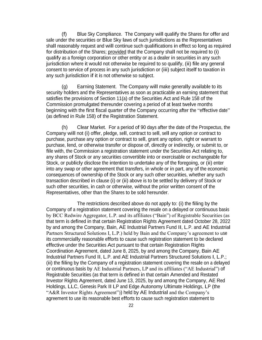 22 (f) Blue Sky Compliance. The Company will qualify the Shares for offer and sale under the securities or Blue Sky laws of such jurisdictions as the Representatives shall reasonably request and will continue such qualifications in effect so long as required for distribution of the Shares; provided that the Company shall not be required to (i) qualify as a foreign corporation or other entity or as a dealer in securities in any such jurisdiction where it would not otherwise be required to so qualify, (ii) file any general consent to service of process in any such jurisdiction or (iii) subject itself to taxation in any such jurisdiction if it is not otherwise so subject. (g) Earning Statement. The Company will make generally available to its security holders and the Representatives as soon as practicable an earning statement that satisfies the provisions of Section 11(a) of the Securities Act and Rule 158 of the Commission promulgated thereunder covering a period of at least twelve months beginning with the first fiscal quarter of the Company occurring after the “effective date” (as defined in Rule 158) of the Registration Statement. (h) Clear Market. For a period of 90 days after the date of the Prospectus, the Company will not (i) offer, pledge, sell, contract to sell, sell any option or contract to purchase, purchase any option or contract to sell, grant any option, right or warrant to purchase, lend, or otherwise transfer or dispose of, directly or indirectly, or submit to, or file with, the Commission a registration statement under the Securities Act relating to, any shares of Stock or any securities convertible into or exercisable or exchangeable for Stock, or publicly disclose the intention to undertake any of the foregoing, or (ii) enter into any swap or other agreement that transfers, in whole or in part, any of the economic consequences of ownership of the Stock or any such other securities, whether any such transaction described in clause (i) or (ii) above is to be settled by delivery of Stock or such other securities, in cash or otherwise, without the prior written consent of the Representatives, other than the Shares to be sold hereunder. The restrictions described above do not apply to: (i) the filing by the Company of a registration statement covering the resale on a delayed or continuous basis by BCC Redwire Aggregator, L.P. and its affiliates (“Bain”) of Registrable Securities (as that term is defined in that certain Registration Rights Agreement dated October 28, 2022 by and among the Company, Bain, AE Industrial Partners Fund II, L.P. and AE Industrial Partners Structured Solutions I, L.P.) held by Bain and the Company’s agreement to use its commercially reasonable efforts to cause such registration statement to be declared effective under the Securities Act pursuant to that certain Registration Rights Coordination Agreement, dated June 8, 2025, by and among the Company, Bain AE Industrial Partners Fund II, L.P. and AE Industrial Partners Structured Solutions I, L.P.; (ii) the filing by the Company of a registration statement covering the resale on a delayed or continuous basis by AE Industrial Partners, LP and its affiliates (“AE Industrial”) of Registrable Securities (as that term is defined in that certain Amended and Restated Investor Rights Agreement, dated June 13, 2025, by and among the Company, AE Red Holdings, LLC, Genesis Park II LP and Edge Autonomy Ultimate Holdings, LP (the “A&R Investor Rights Agreement”)) held by AE Industrial and the Company’s agreement to use its reasonable best efforts to cause such registration statement to