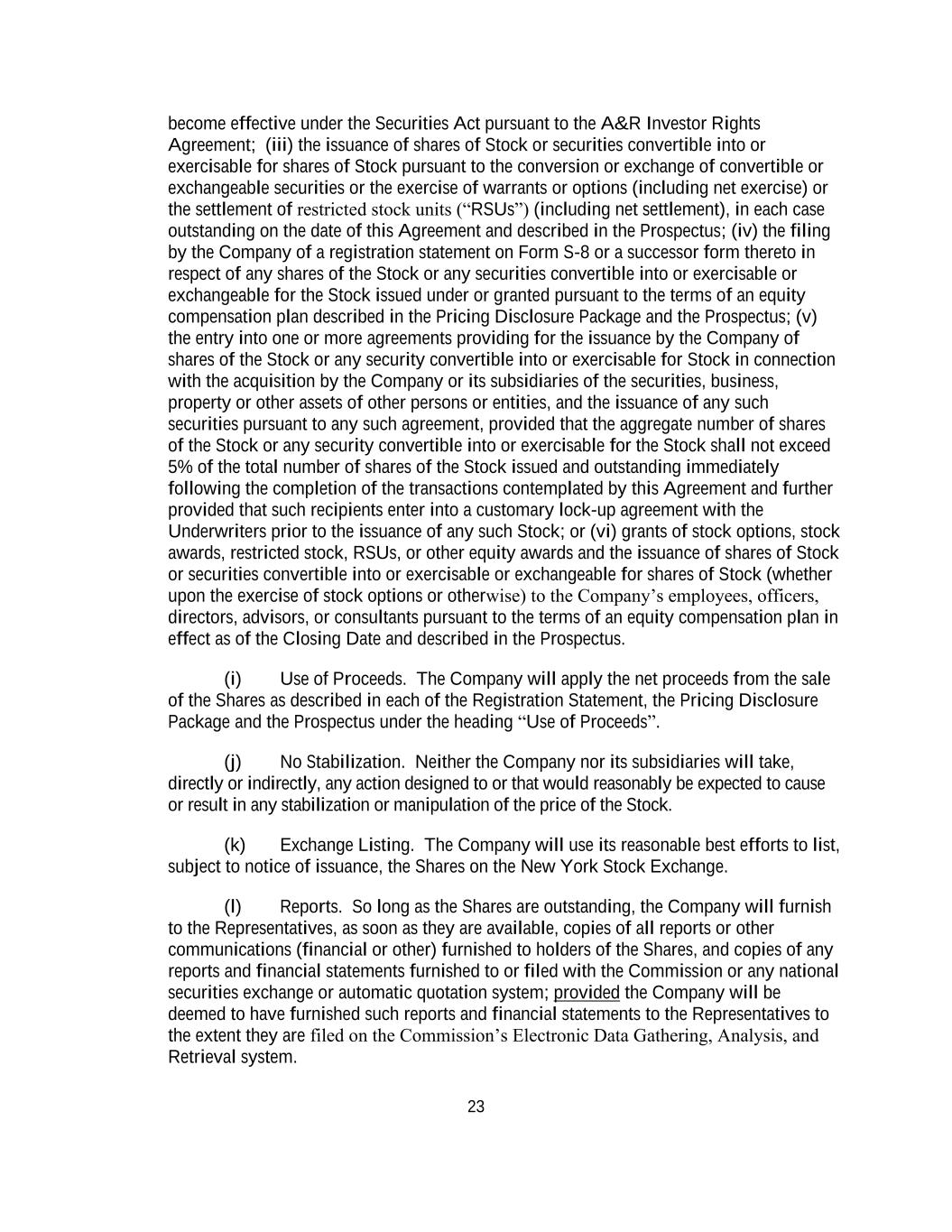 23 become effective under the Securities Act pursuant to the A&R Investor Rights Agreement; (iii) the issuance of shares of Stock or securities convertible into or exercisable for shares of Stock pursuant to the conversion or exchange of convertible or exchangeable securities or the exercise of warrants or options (including net exercise) or the settlement of restricted stock units (“RSUs”) (including net settlement), in each case outstanding on the date of this Agreement and described in the Prospectus; (iv) the filing by the Company of a registration statement on Form S-8 or a successor form thereto in respect of any shares of the Stock or any securities convertible into or exercisable or exchangeable for the Stock issued under or granted pursuant to the terms of an equity compensation plan described in the Pricing Disclosure Package and the Prospectus; (v) the entry into one or more agreements providing for the issuance by the Company of shares of the Stock or any security convertible into or exercisable for Stock in connection with the acquisition by the Company or its subsidiaries of the securities, business, property or other assets of other persons or entities, and the issuance of any such securities pursuant to any such agreement, provided that the aggregate number of shares of the Stock or any security convertible into or exercisable for the Stock shall not exceed 5% of the total number of shares of the Stock issued and outstanding immediately following the completion of the transactions contemplated by this Agreement and further provided that such recipients enter into a customary lock-up agreement with the Underwriters prior to the issuance of any such Stock; or (vi) grants of stock options, stock awards, restricted stock, RSUs, or other equity awards and the issuance of shares of Stock or securities convertible into or exercisable or exchangeable for shares of Stock (whether upon the exercise of stock options or otherwise) to the Company’s employees, officers, directors, advisors, or consultants pursuant to the terms of an equity compensation plan in effect as of the Closing Date and described in the Prospectus. (i) Use of Proceeds. The Company will apply the net proceeds from the sale of the Shares as described in each of the Registration Statement, the Pricing Disclosure Package and the Prospectus under the heading “Use of Proceeds”. (j) No Stabilization. Neither the Company nor its subsidiaries will take, directly or indirectly, any action designed to or that would reasonably be expected to cause or result in any stabilization or manipulation of the price of the Stock. (k) Exchange Listing. The Company will use its reasonable best efforts to list, subject to notice of issuance, the Shares on the New York Stock Exchange. (l) Reports. So long as the Shares are outstanding, the Company will furnish to the Representatives, as soon as they are available, copies of all reports or other communications (financial or other) furnished to holders of the Shares, and copies of any reports and financial statements furnished to or filed with the Commission or any national securities exchange or automatic quotation system; provided the Company will be deemed to have furnished such reports and financial statements to the Representatives to the extent they are filed on the Commission’s Electronic Data Gathering, Analysis, and Retrieval system.
