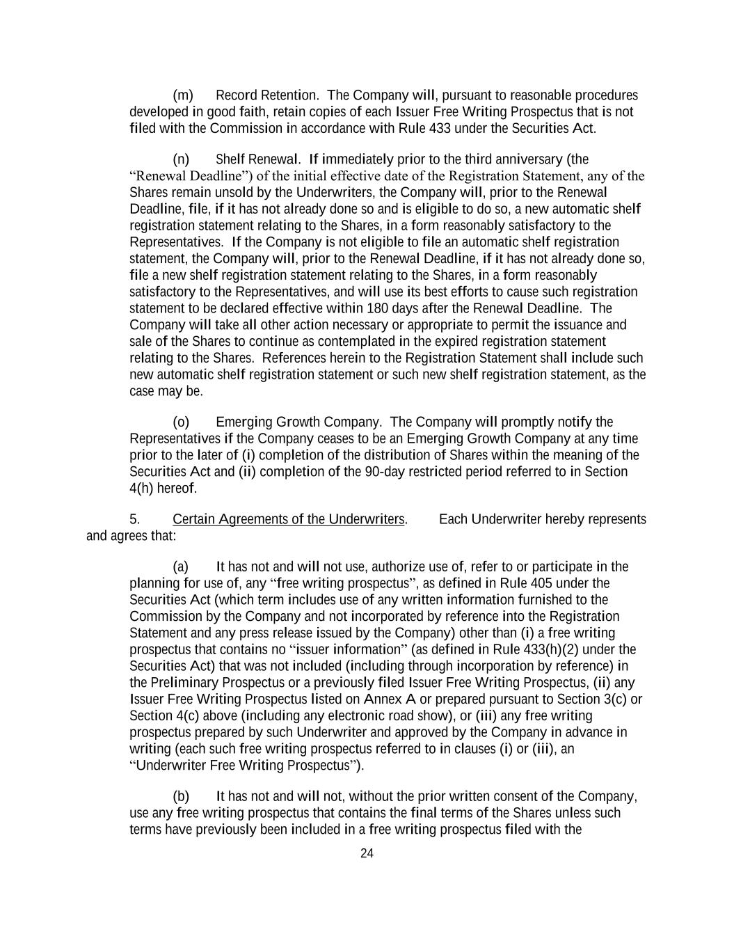 24 (m) Record Retention. The Company will, pursuant to reasonable procedures developed in good faith, retain copies of each Issuer Free Writing Prospectus that is not filed with the Commission in accordance with Rule 433 under the Securities Act. (n) Shelf Renewal. If immediately prior to the third anniversary (the “Renewal Deadline”) of the initial effective date of the Registration Statement, any of the Shares remain unsold by the Underwriters, the Company will, prior to the Renewal Deadline, file, if it has not already done so and is eligible to do so, a new automatic shelf registration statement relating to the Shares, in a form reasonably satisfactory to the Representatives. If the Company is not eligible to file an automatic shelf registration statement, the Company will, prior to the Renewal Deadline, if it has not already done so, file a new shelf registration statement relating to the Shares, in a form reasonably satisfactory to the Representatives, and will use its best efforts to cause such registration statement to be declared effective within 180 days after the Renewal Deadline. The Company will take all other action necessary or appropriate to permit the issuance and sale of the Shares to continue as contemplated in the expired registration statement relating to the Shares. References herein to the Registration Statement shall include such new automatic shelf registration statement or such new shelf registration statement, as the case may be. (o) Emerging Growth Company. The Company will promptly notify the Representatives if the Company ceases to be an Emerging Growth Company at any time prior to the later of (i) completion of the distribution of Shares within the meaning of the Securities Act and (ii) completion of the 90-day restricted period referred to in Section 4(h) hereof. 5. Certain Agreements of the Underwriters. Each Underwriter hereby represents and agrees that: (a) It has not and will not use, authorize use of, refer to or participate in the planning for use of, any “free writing prospectus”, as defined in Rule 405 under the Securities Act (which term includes use of any written information furnished to the Commission by the Company and not incorporated by reference into the Registration Statement and any press release issued by the Company) other than (i) a free writing prospectus that contains no “issuer information” (as defined in Rule 433(h)(2) under the Securities Act) that was not included (including through incorporation by reference) in the Preliminary Prospectus or a previously filed Issuer Free Writing Prospectus, (ii) any Issuer Free Writing Prospectus listed on Annex A or prepared pursuant to Section 3(c) or Section 4(c) above (including any electronic road show), or (iii) any free writing prospectus prepared by such Underwriter and approved by the Company in advance in writing (each such free writing prospectus referred to in clauses (i) or (iii), an “Underwriter Free Writing Prospectus”). (b) It has not and will not, without the prior written consent of the Company, use any free writing prospectus that contains the final terms of the Shares unless such terms have previously been included in a free writing prospectus filed with the