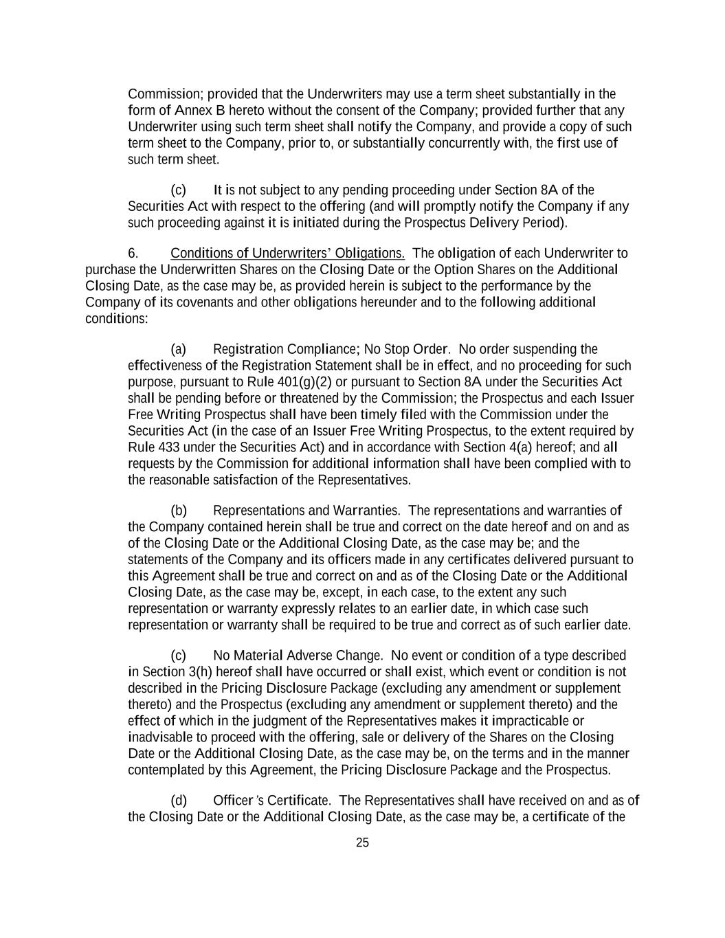 25 Commission; provided that the Underwriters may use a term sheet substantially in the form of Annex B hereto without the consent of the Company; provided further that any Underwriter using such term sheet shall notify the Company, and provide a copy of such term sheet to the Company, prior to, or substantially concurrently with, the first use of such term sheet. (c) It is not subject to any pending proceeding under Section 8A of the Securities Act with respect to the offering (and will promptly notify the Company if any such proceeding against it is initiated during the Prospectus Delivery Period). 6. Conditions of Underwriters’ Obligations. The obligation of each Underwriter to purchase the Underwritten Shares on the Closing Date or the Option Shares on the Additional Closing Date, as the case may be, as provided herein is subject to the performance by the Company of its covenants and other obligations hereunder and to the following additional conditions: (a) Registration Compliance; No Stop Order. No order suspending the effectiveness of the Registration Statement shall be in effect, and no proceeding for such purpose, pursuant to Rule 401(g)(2) or pursuant to Section 8A under the Securities Act shall be pending before or threatened by the Commission; the Prospectus and each Issuer Free Writing Prospectus shall have been timely filed with the Commission under the Securities Act (in the case of an Issuer Free Writing Prospectus, to the extent required by Rule 433 under the Securities Act) and in accordance with Section 4(a) hereof; and all requests by the Commission for additional information shall have been complied with to the reasonable satisfaction of the Representatives. (b) Representations and Warranties. The representations and warranties of the Company contained herein shall be true and correct on the date hereof and on and as of the Closing Date or the Additional Closing Date, as the case may be; and the statements of the Company and its officers made in any certificates delivered pursuant to this Agreement shall be true and correct on and as of the Closing Date or the Additional Closing Date, as the case may be, except, in each case, to the extent any such representation or warranty expressly relates to an earlier date, in which case such representation or warranty shall be required to be true and correct as of such earlier date. (c) No Material Adverse Change. No event or condition of a type described in Section 3(h) hereof shall have occurred or shall exist, which event or condition is not described in the Pricing Disclosure Package (excluding any amendment or supplement thereto) and the Prospectus (excluding any amendment or supplement thereto) and the effect of which in the judgment of the Representatives makes it impracticable or inadvisable to proceed with the offering, sale or delivery of the Shares on the Closing Date or the Additional Closing Date, as the case may be, on the terms and in the manner contemplated by this Agreement, the Pricing Disclosure Package and the Prospectus. (d) Officer’s Certificate. The Representatives shall have received on and as of the Closing Date or the Additional Closing Date, as the case may be, a certificate of the