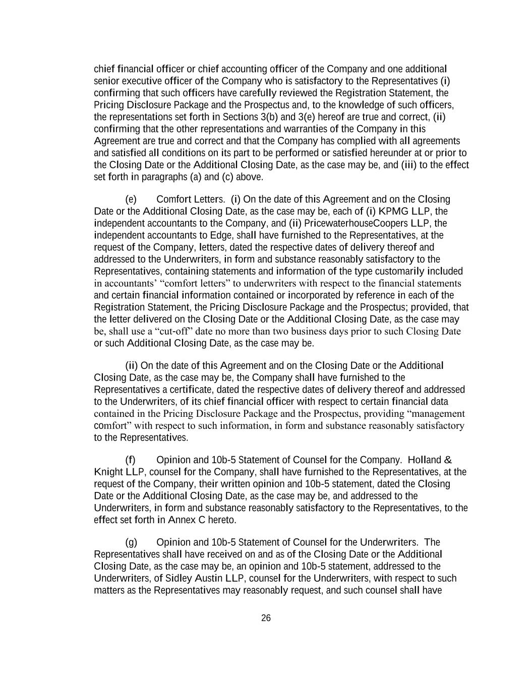 26 chief financial officer or chief accounting officer of the Company and one additional senior executive officer of the Company who is satisfactory to the Representatives (i) confirming that such officers have carefully reviewed the Registration Statement, the Pricing Disclosure Package and the Prospectus and, to the knowledge of such officers, the representations set forth in Sections 3(b) and 3(e) hereof are true and correct, (ii) confirming that the other representations and warranties of the Company in this Agreement are true and correct and that the Company has complied with all agreements and satisfied all conditions on its part to be performed or satisfied hereunder at or prior to the Closing Date or the Additional Closing Date, as the case may be, and (iii) to the effect set forth in paragraphs (a) and (c) above. (e) Comfort Letters. (i) On the date of this Agreement and on the Closing Date or the Additional Closing Date, as the case may be, each of (i) KPMG LLP, the independent accountants to the Company, and (ii) PricewaterhouseCoopers LLP, the independent accountants to Edge, shall have furnished to the Representatives, at the request of the Company, letters, dated the respective dates of delivery thereof and addressed to the Underwriters, in form and substance reasonably satisfactory to the Representatives, containing statements and information of the type customarily included in accountants’ “comfort letters” to underwriters with respect to the financial statements and certain financial information contained or incorporated by reference in each of the Registration Statement, the Pricing Disclosure Package and the Prospectus; provided, that the letter delivered on the Closing Date or the Additional Closing Date, as the case may be, shall use a “cut-off” date no more than two business days prior to such Closing Date or such Additional Closing Date, as the case may be. (ii) On the date of this Agreement and on the Closing Date or the Additional Closing Date, as the case may be, the Company shall have furnished to the Representatives a certificate, dated the respective dates of delivery thereof and addressed to the Underwriters, of its chief financial officer with respect to certain financial data contained in the Pricing Disclosure Package and the Prospectus, providing “management comfort” with respect to such information, in form and substance reasonably satisfactory to the Representatives. (f) Opinion and 10b-5 Statement of Counsel for the Company. Holland & Knight LLP, counsel for the Company, shall have furnished to the Representatives, at the request of the Company, their written opinion and 10b-5 statement, dated the Closing Date or the Additional Closing Date, as the case may be, and addressed to the Underwriters, in form and substance reasonably satisfactory to the Representatives, to the effect set forth in Annex C hereto. (g) Opinion and 10b-5 Statement of Counsel for the Underwriters. The Representatives shall have received on and as of the Closing Date or the Additional Closing Date, as the case may be, an opinion and 10b-5 statement, addressed to the Underwriters, of Sidley Austin LLP, counsel for the Underwriters, with respect to such matters as the Representatives may reasonably request, and such counsel shall have