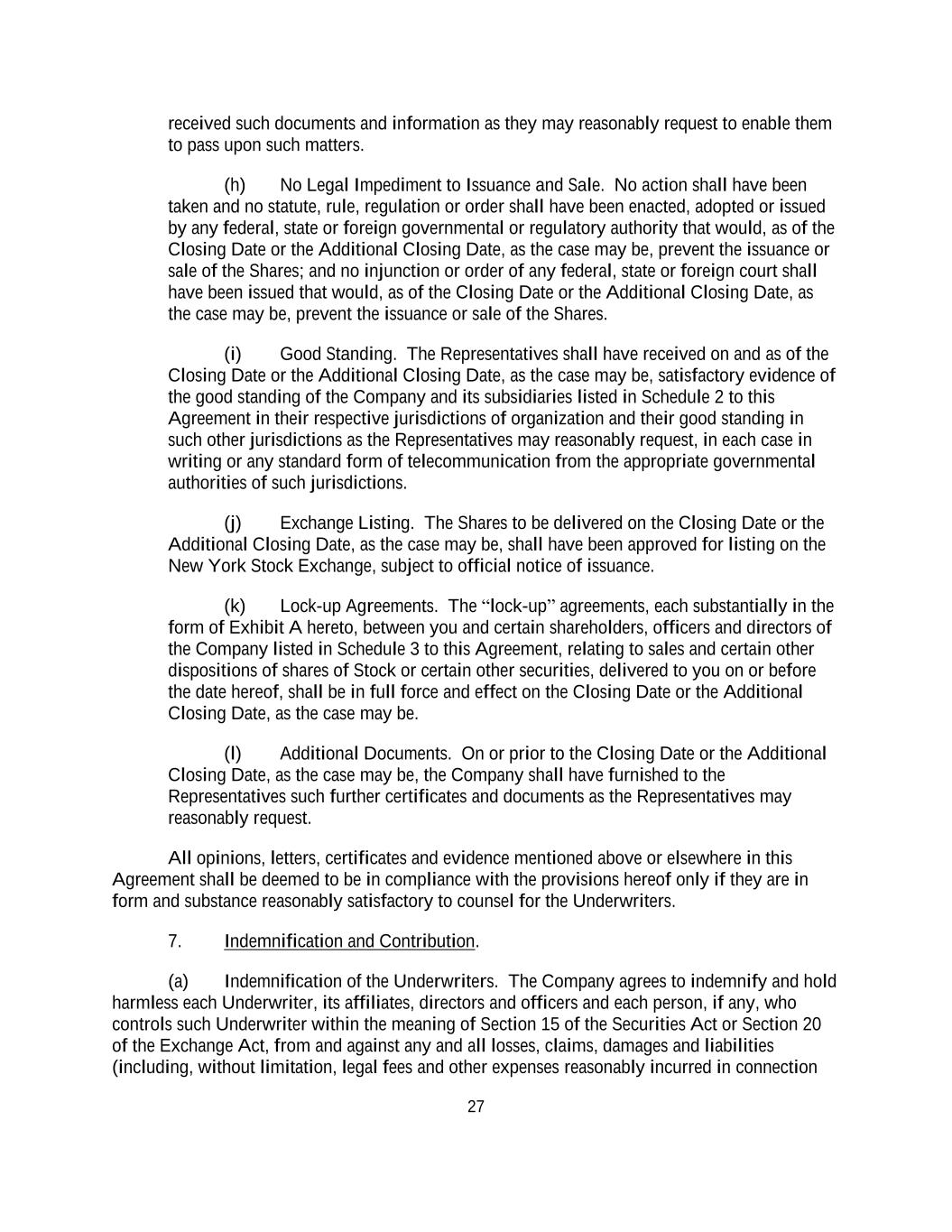27 received such documents and information as they may reasonably request to enable them to pass upon such matters. (h) No Legal Impediment to Issuance and Sale. No action shall have been taken and no statute, rule, regulation or order shall have been enacted, adopted or issued by any federal, state or foreign governmental or regulatory authority that would, as of the Closing Date or the Additional Closing Date, as the case may be, prevent the issuance or sale of the Shares; and no injunction or order of any federal, state or foreign court shall have been issued that would, as of the Closing Date or the Additional Closing Date, as the case may be, prevent the issuance or sale of the Shares. (i) Good Standing. The Representatives shall have received on and as of the Closing Date or the Additional Closing Date, as the case may be, satisfactory evidence of the good standing of the Company and its subsidiaries listed in Schedule 2 to this Agreement in their respective jurisdictions of organization and their good standing in such other jurisdictions as the Representatives may reasonably request, in each case in writing or any standard form of telecommunication from the appropriate governmental authorities of such jurisdictions. (j) Exchange Listing. The Shares to be delivered on the Closing Date or the Additional Closing Date, as the case may be, shall have been approved for listing on the New York Stock Exchange, subject to official notice of issuance. (k) Lock-up Agreements. The “lock-up” agreements, each substantially in the form of Exhibit A hereto, between you and certain shareholders, officers and directors of the Company listed in Schedule 3 to this Agreement, relating to sales and certain other dispositions of shares of Stock or certain other securities, delivered to you on or before the date hereof, shall be in full force and effect on the Closing Date or the Additional Closing Date, as the case may be. (l) Additional Documents. On or prior to the Closing Date or the Additional Closing Date, as the case may be, the Company shall have furnished to the Representatives such further certificates and documents as the Representatives may reasonably request. All opinions, letters, certificates and evidence mentioned above or elsewhere in this Agreement shall be deemed to be in compliance with the provisions hereof only if they are in form and substance reasonably satisfactory to counsel for the Underwriters. 7. Indemnification and Contribution. (a) Indemnification of the Underwriters. The Company agrees to indemnify and hold harmless each Underwriter, its affiliates, directors and officers and each person, if any, who controls such Underwriter within the meaning of Section 15 of the Securities Act or Section 20 of the Exchange Act, from and against any and all losses, claims, damages and liabilities (including, without limitation, legal fees and other expenses reasonably incurred in connection
