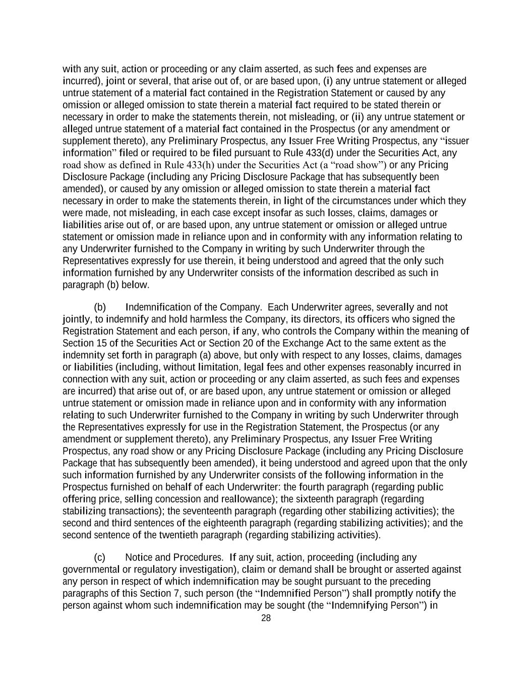 28 with any suit, action or proceeding or any claim asserted, as such fees and expenses are incurred), joint or several, that arise out of, or are based upon, (i) any untrue statement or alleged untrue statement of a material fact contained in the Registration Statement or caused by any omission or alleged omission to state therein a material fact required to be stated therein or necessary in order to make the statements therein, not misleading, or (ii) any untrue statement or alleged untrue statement of a material fact contained in the Prospectus (or any amendment or supplement thereto), any Preliminary Prospectus, any Issuer Free Writing Prospectus, any “issuer information” filed or required to be filed pursuant to Rule 433(d) under the Securities Act, any road show as defined in Rule 433(h) under the Securities Act (a “road show”) or any Pricing Disclosure Package (including any Pricing Disclosure Package that has subsequently been amended), or caused by any omission or alleged omission to state therein a material fact necessary in order to make the statements therein, in light of the circumstances under which they were made, not misleading, in each case except insofar as such losses, claims, damages or liabilities arise out of, or are based upon, any untrue statement or omission or alleged untrue statement or omission made in reliance upon and in conformity with any information relating to any Underwriter furnished to the Company in writing by such Underwriter through the Representatives expressly for use therein, it being understood and agreed that the only such information furnished by any Underwriter consists of the information described as such in paragraph (b) below. (b) Indemnification of the Company. Each Underwriter agrees, severally and not jointly, to indemnify and hold harmless the Company, its directors, its officers who signed the Registration Statement and each person, if any, who controls the Company within the meaning of Section 15 of the Securities Act or Section 20 of the Exchange Act to the same extent as the indemnity set forth in paragraph (a) above, but only with respect to any losses, claims, damages or liabilities (including, without limitation, legal fees and other expenses reasonably incurred in connection with any suit, action or proceeding or any claim asserted, as such fees and expenses are incurred) that arise out of, or are based upon, any untrue statement or omission or alleged untrue statement or omission made in reliance upon and in conformity with any information relating to such Underwriter furnished to the Company in writing by such Underwriter through the Representatives expressly for use in the Registration Statement, the Prospectus (or any amendment or supplement thereto), any Preliminary Prospectus, any Issuer Free Writing Prospectus, any road show or any Pricing Disclosure Package (including any Pricing Disclosure Package that has subsequently been amended), it being understood and agreed upon that the only such information furnished by any Underwriter consists of the following information in the Prospectus furnished on behalf of each Underwriter: the fourth paragraph (regarding public offering price, selling concession and reallowance); the sixteenth paragraph (regarding stabilizing transactions); the seventeenth paragraph (regarding other stabilizing activities); the second and third sentences of the eighteenth paragraph (regarding stabilizing activities); and the second sentence of the twentieth paragraph (regarding stabilizing activities). (c) Notice and Procedures. If any suit, action, proceeding (including any governmental or regulatory investigation), claim or demand shall be brought or asserted against any person in respect of which indemnification may be sought pursuant to the preceding paragraphs of this Section 7, such person (the “Indemnified Person”) shall promptly notify the person against whom such indemnification may be sought (the “Indemnifying Person”) in