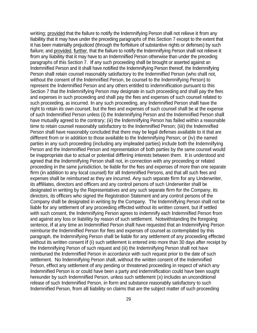 29 writing; provided that the failure to notify the Indemnifying Person shall not relieve it from any liability that it may have under the preceding paragraphs of this Section 7 except to the extent that it has been materially prejudiced (through the forfeiture of substantive rights or defenses) by such failure; and provided, further, that the failure to notify the Indemnifying Person shall not relieve it from any liability that it may have to an Indemnified Person otherwise than under the preceding paragraphs of this Section 7. If any such proceeding shall be brought or asserted against an Indemnified Person and it shall have notified the Indemnifying Person thereof, the Indemnifying Person shall retain counsel reasonably satisfactory to the Indemnified Person (who shall not, without the consent of the Indemnified Person, be counsel to the Indemnifying Person) to represent the Indemnified Person and any others entitled to indemnification pursuant to this Section 7 that the Indemnifying Person may designate in such proceeding and shall pay the fees and expenses in such proceeding and shall pay the fees and expenses of such counsel related to such proceeding, as incurred. In any such proceeding, any Indemnified Person shall have the right to retain its own counsel, but the fees and expenses of such counsel shall be at the expense of such Indemnified Person unless (i) the Indemnifying Person and the Indemnified Person shall have mutually agreed to the contrary; (ii) the Indemnifying Person has failed within a reasonable time to retain counsel reasonably satisfactory to the Indemnified Person; (iii) the Indemnified Person shall have reasonably concluded that there may be legal defenses available to it that are different from or in addition to those available to the Indemnifying Person; or (iv) the named parties in any such proceeding (including any impleaded parties) include both the Indemnifying Person and the Indemnified Person and representation of both parties by the same counsel would be inappropriate due to actual or potential differing interests between them. It is understood and agreed that the Indemnifying Person shall not, in connection with any proceeding or related proceeding in the same jurisdiction, be liable for the fees and expenses of more than one separate firm (in addition to any local counsel) for all Indemnified Persons, and that all such fees and expenses shall be reimbursed as they are incurred. Any such separate firm for any Underwriter, its affiliates, directors and officers and any control persons of such Underwriter shall be designated in writing by the Representatives and any such separate firm for the Company, its directors, its officers who signed the Registration Statement and any control persons of the Company shall be designated in writing by the Company. The Indemnifying Person shall not be liable for any settlement of any proceeding effected without its written consent, but if settled with such consent, the Indemnifying Person agrees to indemnify each Indemnified Person from and against any loss or liability by reason of such settlement. Notwithstanding the foregoing sentence, if at any time an Indemnified Person shall have requested that an Indemnifying Person reimburse the Indemnified Person for fees and expenses of counsel as contemplated by this paragraph, the Indemnifying Person shall be liable for any settlement of any proceeding effected without its written consent if (i) such settlement is entered into more than 30 days after receipt by the Indemnifying Person of such request and (ii) the Indemnifying Person shall not have reimbursed the Indemnified Person in accordance with such request prior to the date of such settlement. No Indemnifying Person shall, without the written consent of the Indemnified Person, effect any settlement of any pending or threatened proceeding in respect of which any Indemnified Person is or could have been a party and indemnification could have been sought hereunder by such Indemnified Person, unless such settlement (x) includes an unconditional release of such Indemnified Person, in form and substance reasonably satisfactory to such Indemnified Person, from all liability on claims that are the subject matter of such proceeding