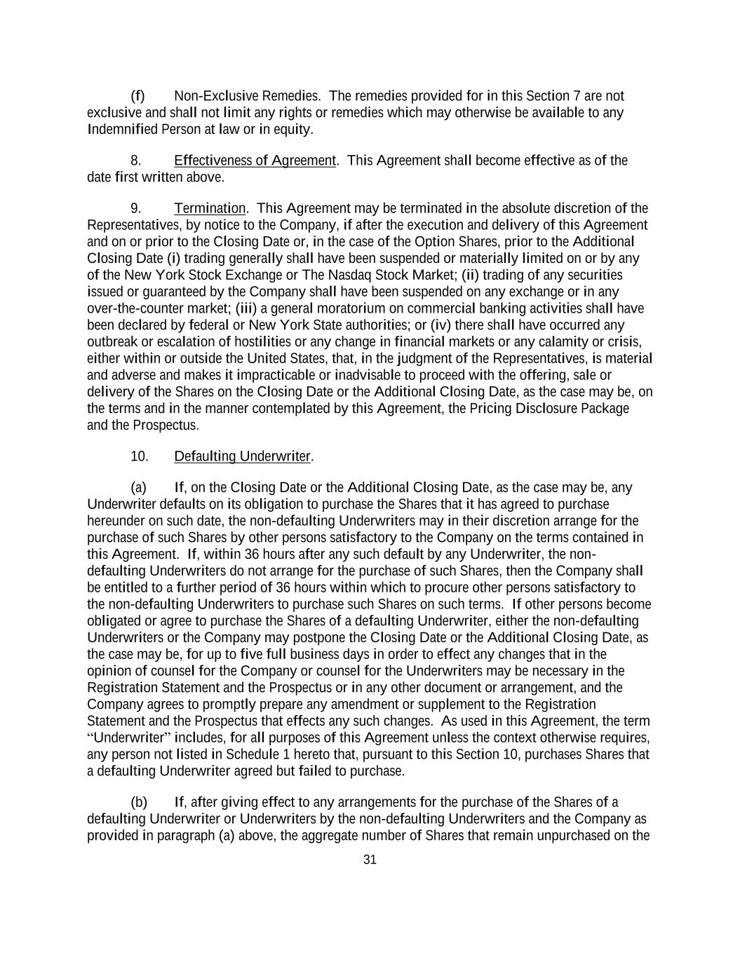 31 (f) Non-Exclusive Remedies. The remedies provided for in this Section 7 are not exclusive and shall not limit any rights or remedies which may otherwise be available to any Indemnified Person at law or in equity. 8. Effectiveness of Agreement. This Agreement shall become effective as of the date first written above. 9. Termination. This Agreement may be terminated in the absolute discretion of the Representatives, by notice to the Company, if after the execution and delivery of this Agreement and on or prior to the Closing Date or, in the case of the Option Shares, prior to the Additional Closing Date (i) trading generally shall have been suspended or materially limited on or by any of the New York Stock Exchange or The Nasdaq Stock Market; (ii) trading of any securities issued or guaranteed by the Company shall have been suspended on any exchange or in any over-the-counter market; (iii) a general moratorium on commercial banking activities shall have been declared by federal or New York State authorities; or (iv) there shall have occurred any outbreak or escalation of hostilities or any change in financial markets or any calamity or crisis, either within or outside the United States, that, in the judgment of the Representatives, is material and adverse and makes it impracticable or inadvisable to proceed with the offering, sale or delivery of the Shares on the Closing Date or the Additional Closing Date, as the case may be, on the terms and in the manner contemplated by this Agreement, the Pricing Disclosure Package and the Prospectus. 10. Defaulting Underwriter. (a) If, on the Closing Date or the Additional Closing Date, as the case may be, any Underwriter defaults on its obligation to purchase the Shares that it has agreed to purchase hereunder on such date, the non-defaulting Underwriters may in their discretion arrange for the purchase of such Shares by other persons satisfactory to the Company on the terms contained in this Agreement. If, within 36 hours after any such default by any Underwriter, the non- defaulting Underwriters do not arrange for the purchase of such Shares, then the Company shall be entitled to a further period of 36 hours within which to procure other persons satisfactory to the non-defaulting Underwriters to purchase such Shares on such terms. If other persons become obligated or agree to purchase the Shares of a defaulting Underwriter, either the non-defaulting Underwriters or the Company may postpone the Closing Date or the Additional Closing Date, as the case may be, for up to five full business days in order to effect any changes that in the opinion of counsel for the Company or counsel for the Underwriters may be necessary in the Registration Statement and the Prospectus or in any other document or arrangement, and the Company agrees to promptly prepare any amendment or supplement to the Registration Statement and the Prospectus that effects any such changes. As used in this Agreement, the term “Underwriter” includes, for all purposes of this Agreement unless the context otherwise requires, any person not listed in Schedule 1 hereto that, pursuant to this Section 10, purchases Shares that a defaulting Underwriter agreed but failed to purchase. (b) If, after giving effect to any arrangements for the purchase of the Shares of a defaulting Underwriter or Underwriters by the non-defaulting Underwriters and the Company as provided in paragraph (a) above, the aggregate number of Shares that remain unpurchased on the