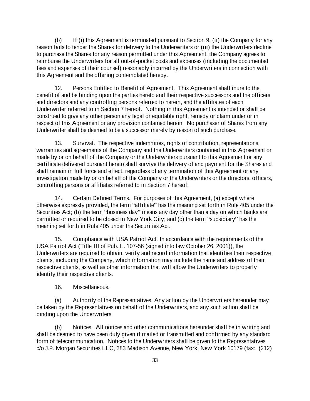 33 (b) If (i) this Agreement is terminated pursuant to Section 9, (ii) the Company for any reason fails to tender the Shares for delivery to the Underwriters or (iii) the Underwriters decline to purchase the Shares for any reason permitted under this Agreement, the Company agrees to reimburse the Underwriters for all out-of-pocket costs and expenses (including the documented fees and expenses of their counsel) reasonably incurred by the Underwriters in connection with this Agreement and the offering contemplated hereby. 12. Persons Entitled to Benefit of Agreement. This Agreement shall inure to the benefit of and be binding upon the parties hereto and their respective successors and the officers and directors and any controlling persons referred to herein, and the affiliates of each Underwriter referred to in Section 7 hereof. Nothing in this Agreement is intended or shall be construed to give any other person any legal or equitable right, remedy or claim under or in respect of this Agreement or any provision contained herein. No purchaser of Shares from any Underwriter shall be deemed to be a successor merely by reason of such purchase. 13. Survival. The respective indemnities, rights of contribution, representations, warranties and agreements of the Company and the Underwriters contained in this Agreement or made by or on behalf of the Company or the Underwriters pursuant to this Agreement or any certificate delivered pursuant hereto shall survive the delivery of and payment for the Shares and shall remain in full force and effect, regardless of any termination of this Agreement or any investigation made by or on behalf of the Company or the Underwriters or the directors, officers, controlling persons or affiliates referred to in Section 7 hereof. 14. Certain Defined Terms. For purposes of this Agreement, (a) except where otherwise expressly provided, the term “affiliate” has the meaning set forth in Rule 405 under the Securities Act; (b) the term “business day” means any day other than a day on which banks are permitted or required to be closed in New York City; and (c) the term “subsidiary” has the meaning set forth in Rule 405 under the Securities Act. 15. Compliance with USA Patriot Act. In accordance with the requirements of the USA Patriot Act (Title III of Pub. L. 107-56 (signed into law October 26, 2001)), the Underwriters are required to obtain, verify and record information that identifies their respective clients, including the Company, which information may include the name and address of their respective clients, as well as other information that will allow the Underwriters to properly identify their respective clients. 16. Miscellaneous. (a) Authority of the Representatives. Any action by the Underwriters hereunder may be taken by the Representatives on behalf of the Underwriters, and any such action shall be binding upon the Underwriters. (b) Notices. All notices and other communications hereunder shall be in writing and shall be deemed to have been duly given if mailed or transmitted and confirmed by any standard form of telecommunication. Notices to the Underwriters shall be given to the Representatives c/o J.P. Morgan Securities LLC, 383 Madison Avenue, New York, New York 10179 (fax: (212)