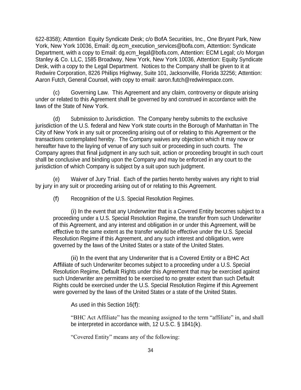 34 622-8358); Attention Equity Syndicate Desk; c/o BofA Securities, Inc., One Bryant Park, New York, New York 10036, Email: dg.ecm_execution_services@bofa.com, Attention: Syndicate Department, with a copy to Email: dg.ecm_legal@bofa.com, Attention: ECM Legal; c/o Morgan Stanley & Co. LLC, 1585 Broadway, New York, New York 10036, Attention: Equity Syndicate Desk, with a copy to the Legal Department. Notices to the Company shall be given to it at Redwire Corporation, 8226 Philips Highway, Suite 101, Jacksonville, Florida 32256; Attention: Aaron Futch, General Counsel, with copy to email: aaron.futch@redwirespace.com. (c) Governing Law. This Agreement and any claim, controversy or dispute arising under or related to this Agreement shall be governed by and construed in accordance with the laws of the State of New York. (d) Submission to Jurisdiction. The Company hereby submits to the exclusive jurisdiction of the U.S. federal and New York state courts in the Borough of Manhattan in The City of New York in any suit or proceeding arising out of or relating to this Agreement or the transactions contemplated hereby. The Company waives any objection which it may now or hereafter have to the laying of venue of any such suit or proceeding in such courts. The Company agrees that final judgment in any such suit, action or proceeding brought in such court shall be conclusive and binding upon the Company and may be enforced in any court to the jurisdiction of which Company is subject by a suit upon such judgment. (e) Waiver of Jury Trial. Each of the parties hereto hereby waives any right to trial by jury in any suit or proceeding arising out of or relating to this Agreement. (f) Recognition of the U.S. Special Resolution Regimes. (i) In the event that any Underwriter that is a Covered Entity becomes subject to a proceeding under a U.S. Special Resolution Regime, the transfer from such Underwriter of this Agreement, and any interest and obligation in or under this Agreement, will be effective to the same extent as the transfer would be effective under the U.S. Special Resolution Regime if this Agreement, and any such interest and obligation, were governed by the laws of the United States or a state of the United States. (ii) In the event that any Underwriter that is a Covered Entity or a BHC Act Affiliate of such Underwriter becomes subject to a proceeding under a U.S. Special Resolution Regime, Default Rights under this Agreement that may be exercised against such Underwriter are permitted to be exercised to no greater extent than such Default Rights could be exercised under the U.S. Special Resolution Regime if this Agreement were governed by the laws of the United States or a state of the United States. As used in this Section 16(f): “BHC Act Affiliate” has the meaning assigned to the term “affiliate” in, and shall be interpreted in accordance with, 12 U.S.C. § 1841(k). “Covered Entity” means any of the following: