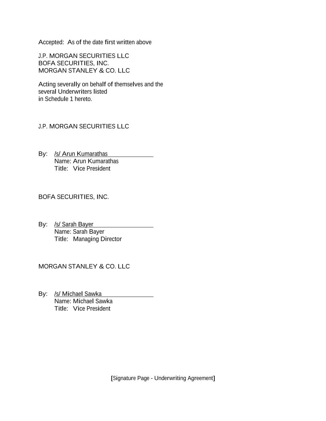 [Signature Page - Underwriting Agreement] Accepted: As of the date first written above J.P. MORGAN SECURITIES LLC BOFA SECURITIES, INC. MORGAN STANLEY & CO. LLC Acting severally on behalf of themselves and the several Underwriters listed in Schedule 1 hereto. J.P. MORGAN SECURITIES LLC By: /s/ Arun Kumarathas Name: Arun Kumarathas Title: Vice President BOFA SECURITIES, INC. By: /s/ Sarah Bayer Name: Sarah Bayer Title: Managing Director MORGAN STANLEY & CO. LLC By: /s/ Michael Sawka Name: Michael Sawka Title: Vice President